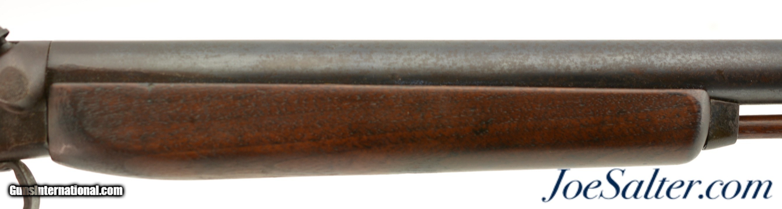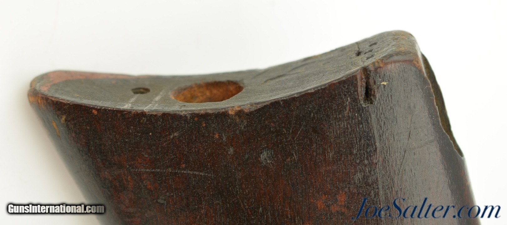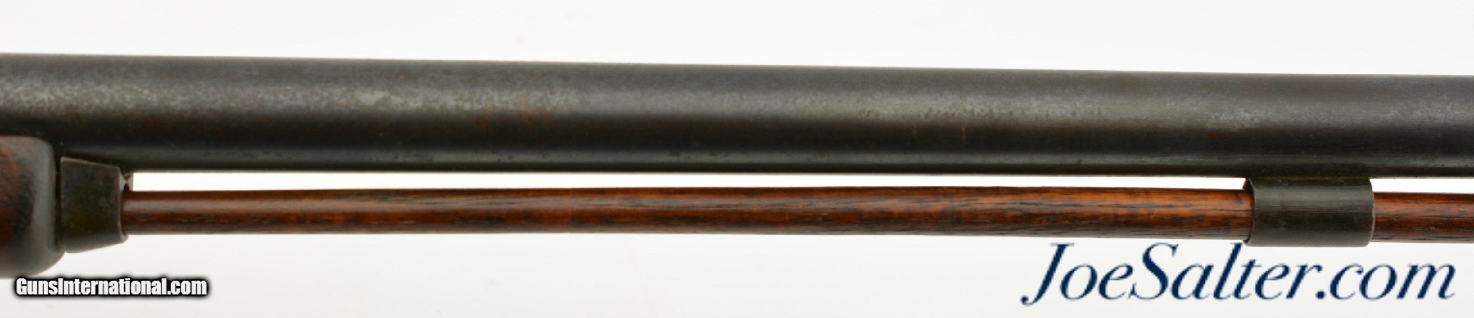 Description: Serial #672, 20 gauge black powder percussion, 32 5/8 inch (cut from a probable original 36") smooth bore barrel with a fine, dark, slightly rough bore. This is the Whitney Percussion single barrel shotgun manufactured from 1866-1869 with surplus 58 caliber rifled barrels that were reamed out to smoothbore. Quantities were quite limited and few of these single barrels survive today. This example is nicely marked on the barrel top "WHITNEY ARMS CO. WHITNEYVILLE CONN" with a blue/ brown patina having scattered freckling. It is missing the butt plate and has a replaced trigger-guard and now ill fitting ramrod that may have been original before the barrel was cut. The stock and forearm appear original with correct matching numbers on the butt and are solid with a stable crack below the top of the comb. The action functions holding at half and full cock. A rare and interesting piece of post Civil War firearms history. Antique: Yes Price: $495.00 Contact Seller |