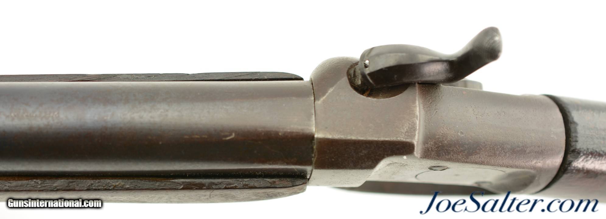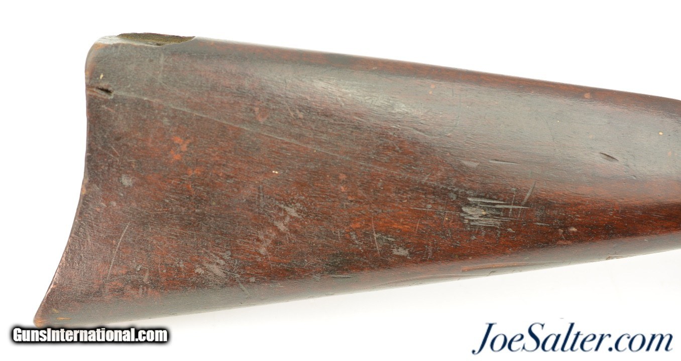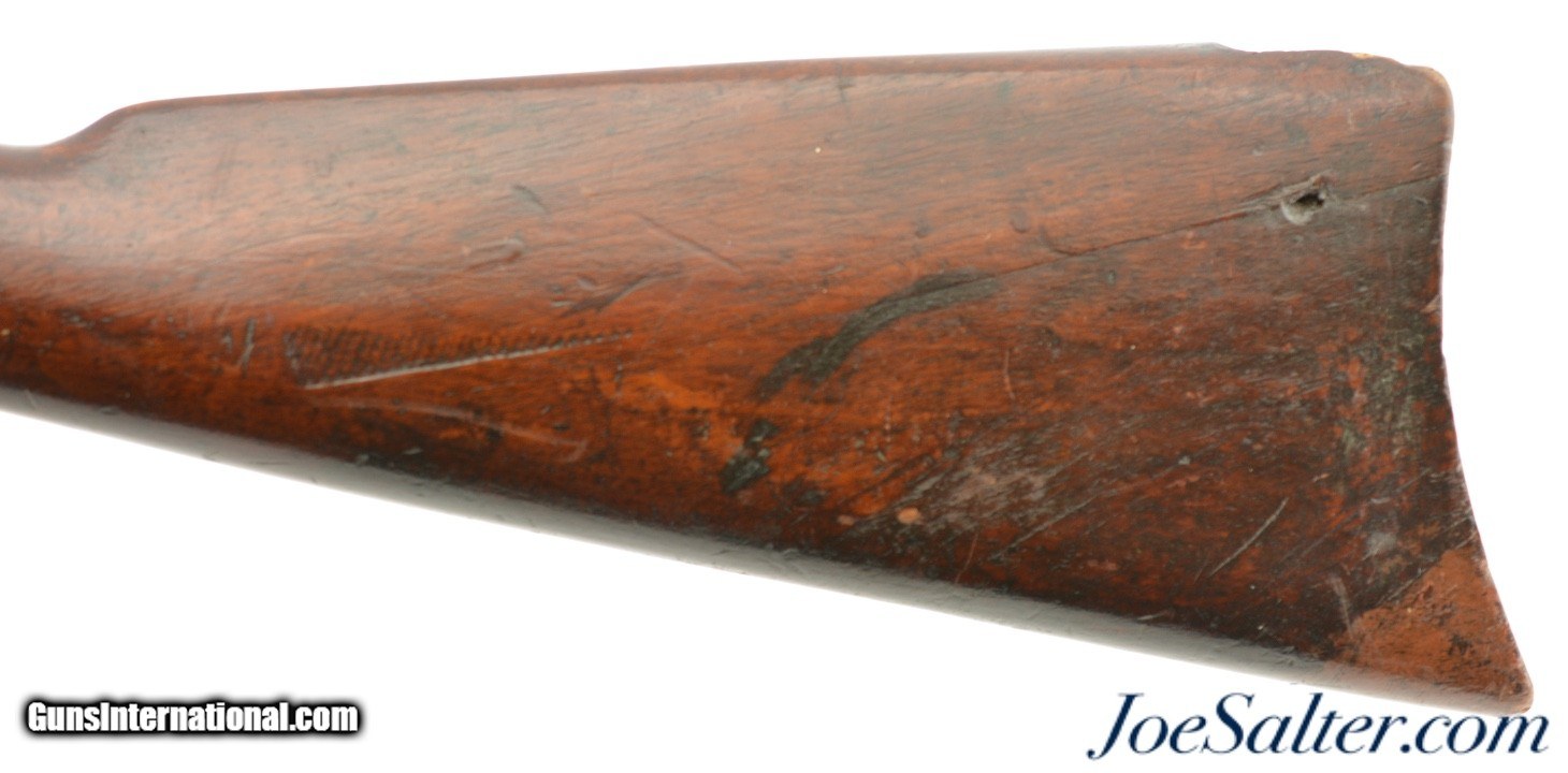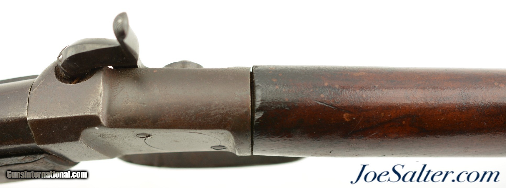 Description: Serial #672, 20 gauge black powder percussion, 32 5/8 inch (cut from a probable original 36") smooth bore barrel with a fine, dark, slightly rough bore. This is the Whitney Percussion single barrel shotgun manufactured from 1866-1869 with surplus 58 caliber rifled barrels that were reamed out to smoothbore. Quantities were quite limited and few of these single barrels survive today. This example is nicely marked on the barrel top "WHITNEY ARMS CO. WHITNEYVILLE CONN" with a blue/ brown patina having scattered freckling. It is missing the butt plate and has a replaced trigger-guard and now ill fitting ramrod that may have been original before the barrel was cut. The stock and forearm appear original with correct matching numbers on the butt and are solid with a stable crack below the top of the comb. The action functions holding at half and full cock. A rare and interesting piece of post Civil War firearms history. Antique: Yes Price: $495.00 Contact Seller |