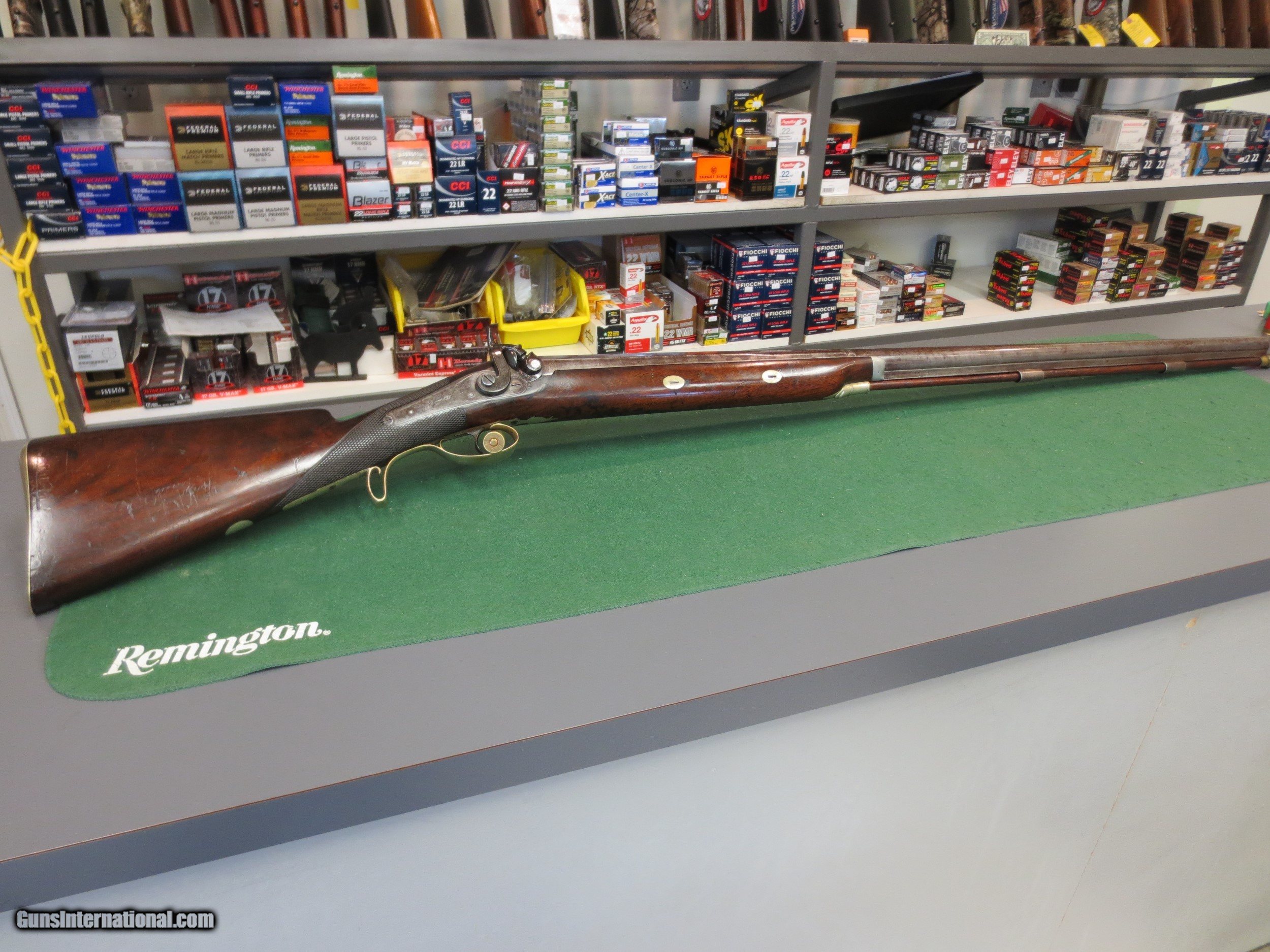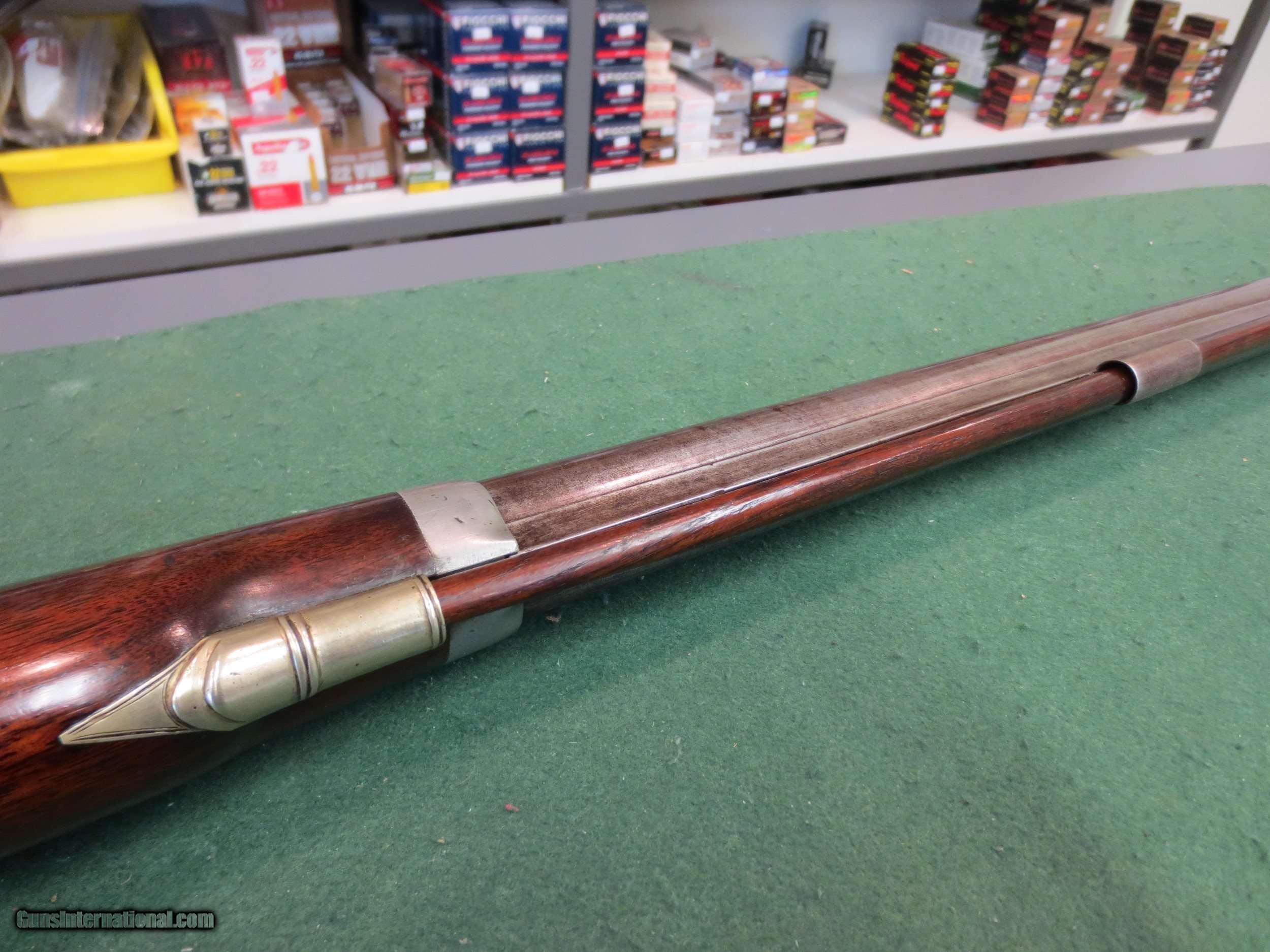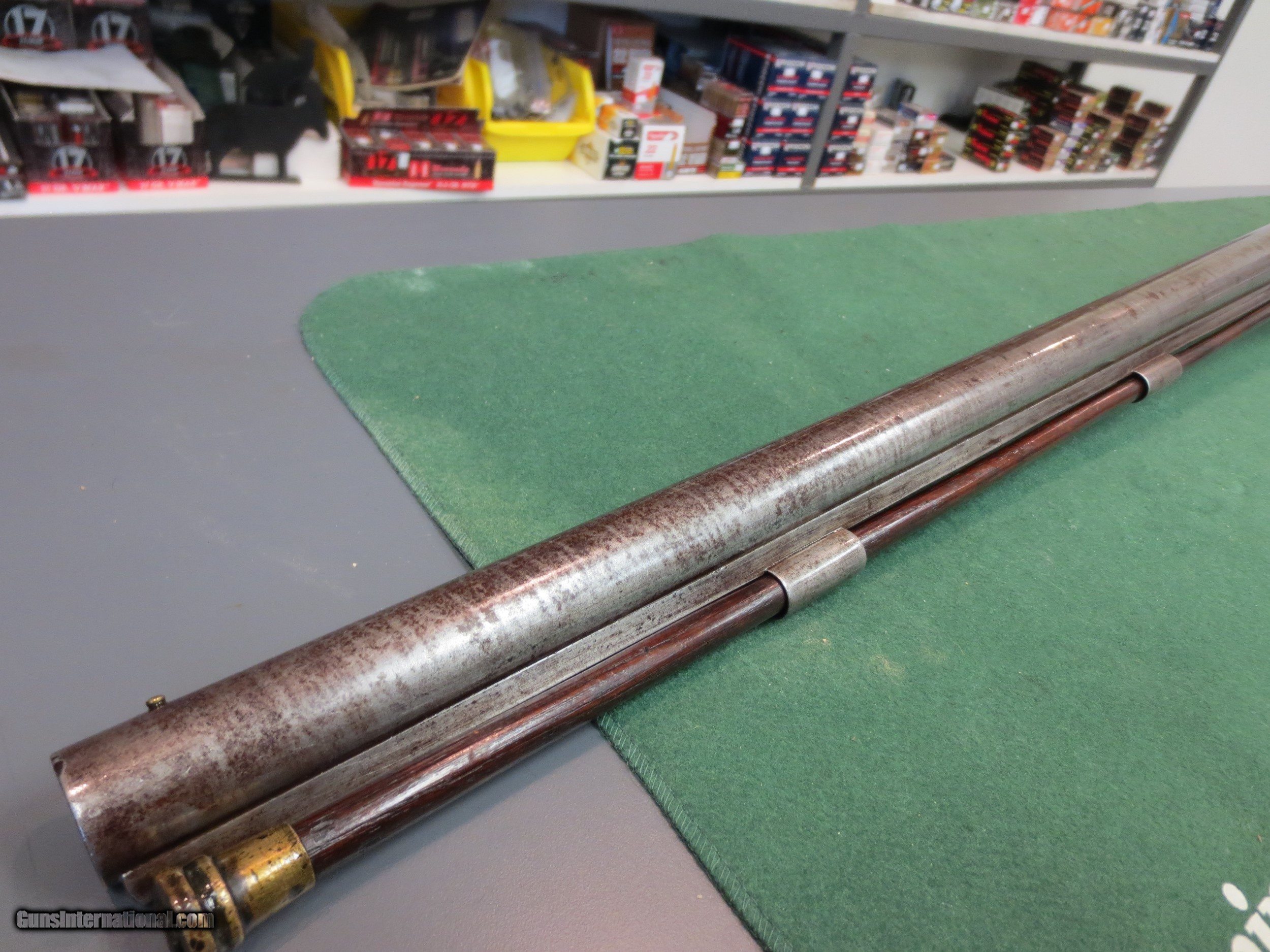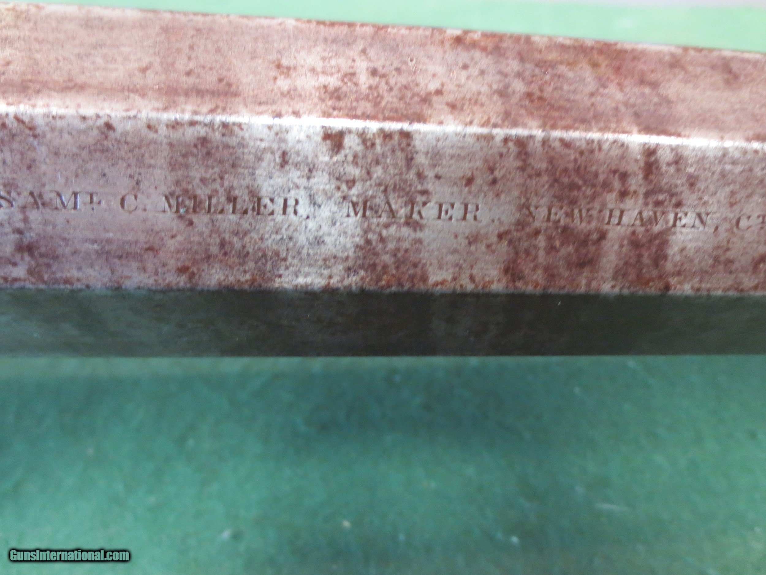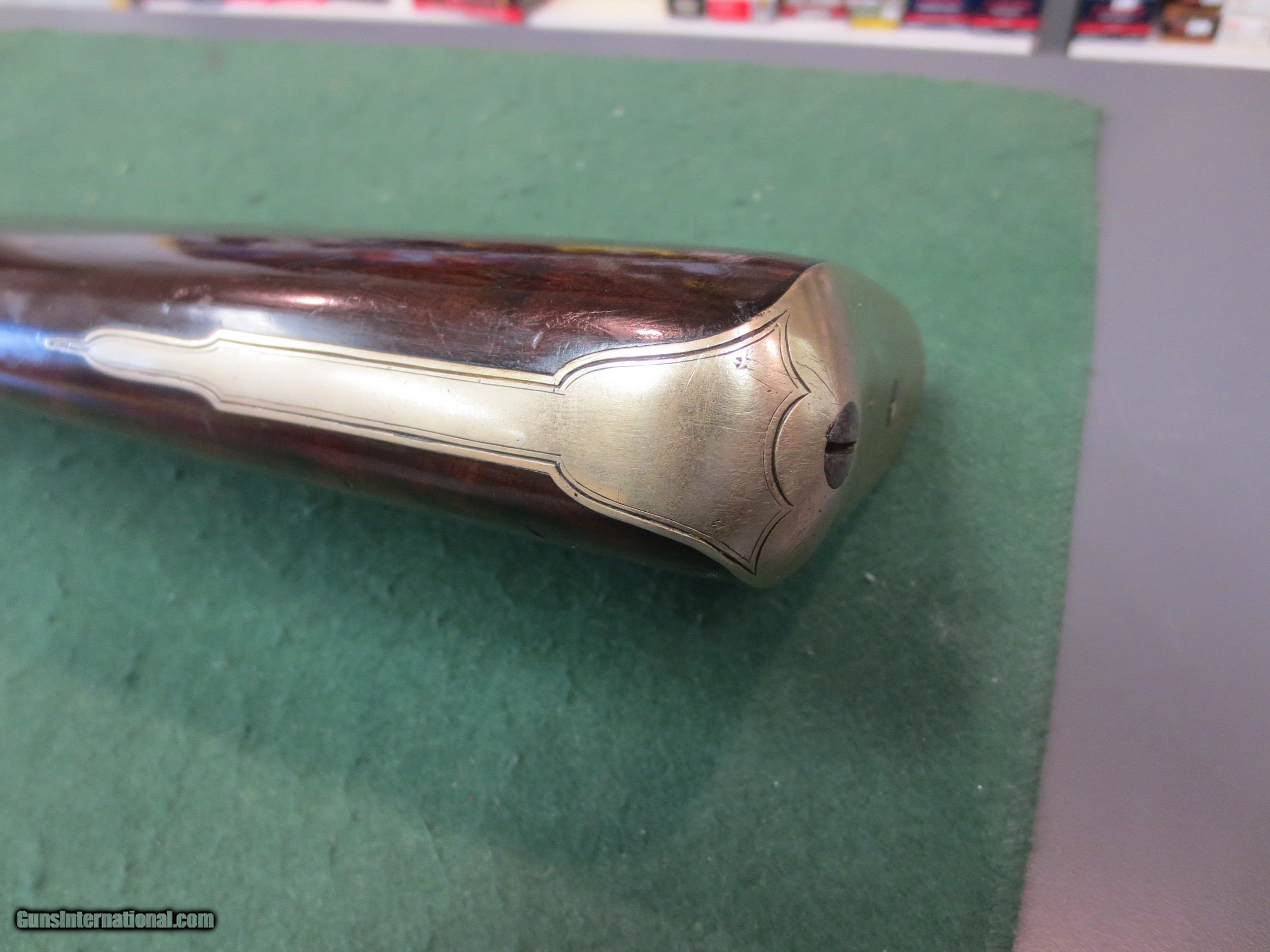 Description: S. C. Miller 8 Gauge percussion single barrel. “Samuel C Miller Maker New Haven CT” marked on top flat. Silver mountings, Thimbles, and Butt Plate. Weighs 16 lbs 7 oz. 0.100” wall thickness at muzzle. Double keyed. 40-1/8” Barrel , 14” LOP ,1-1/2” DAC, 2-1/4” DAH, cast off 3/8” Good condition bore overall. Small chip in wood just in front of snail breech. SOLD |