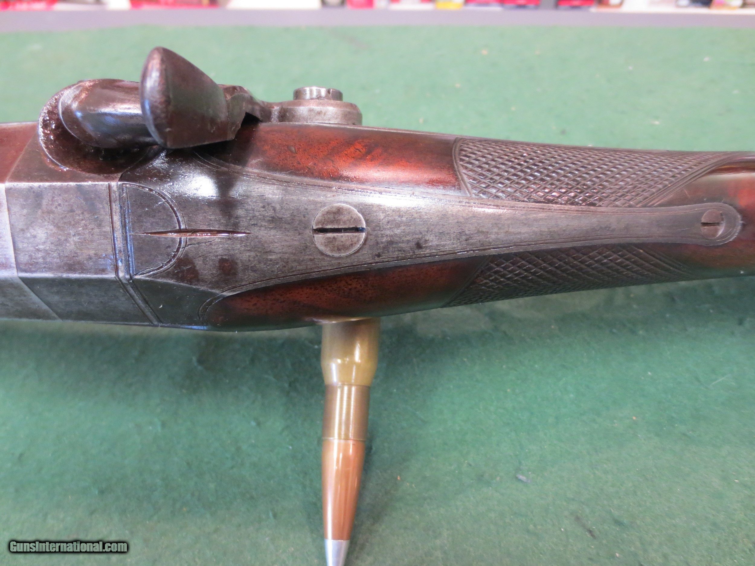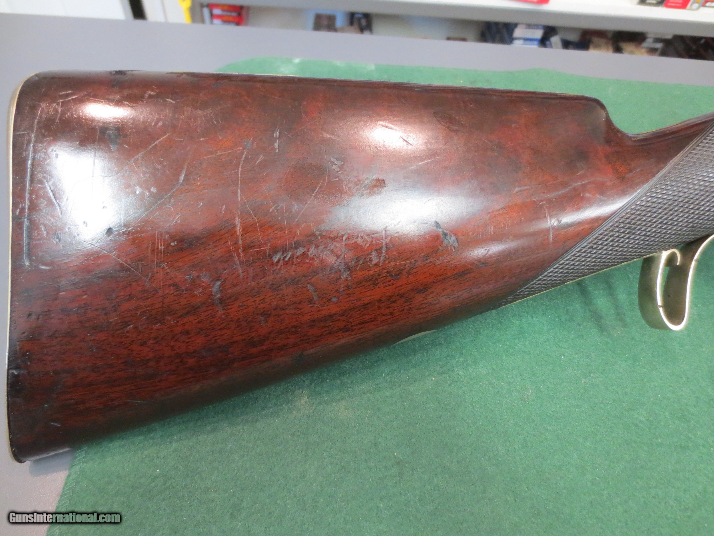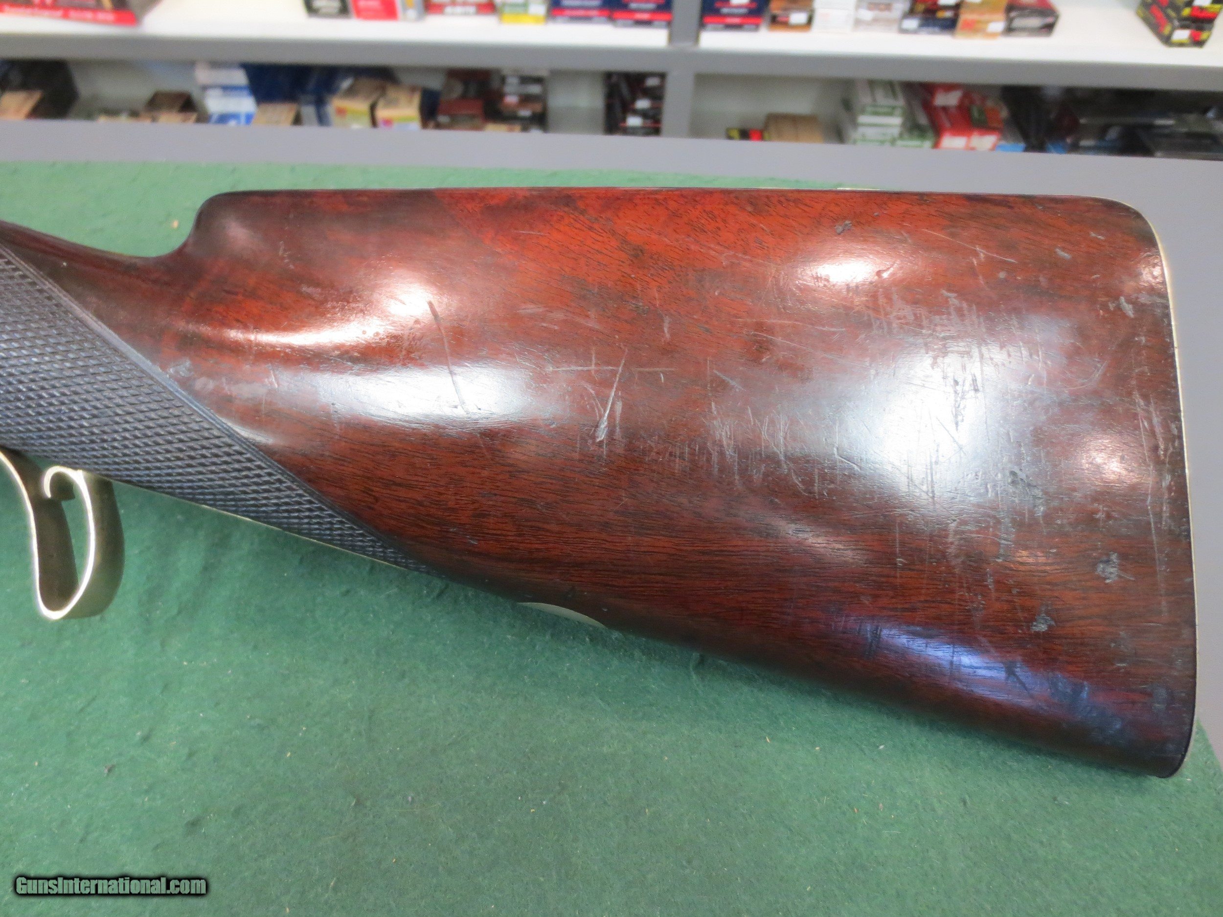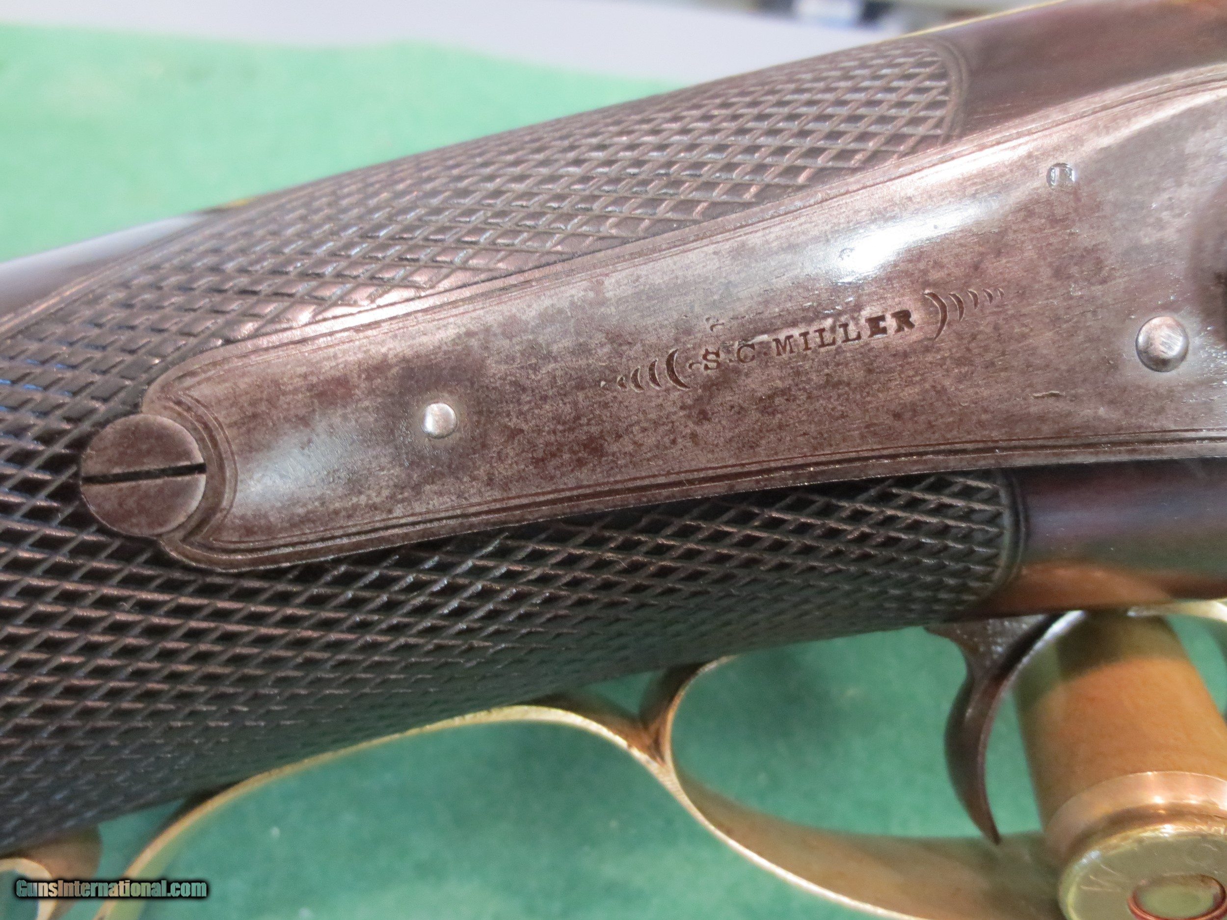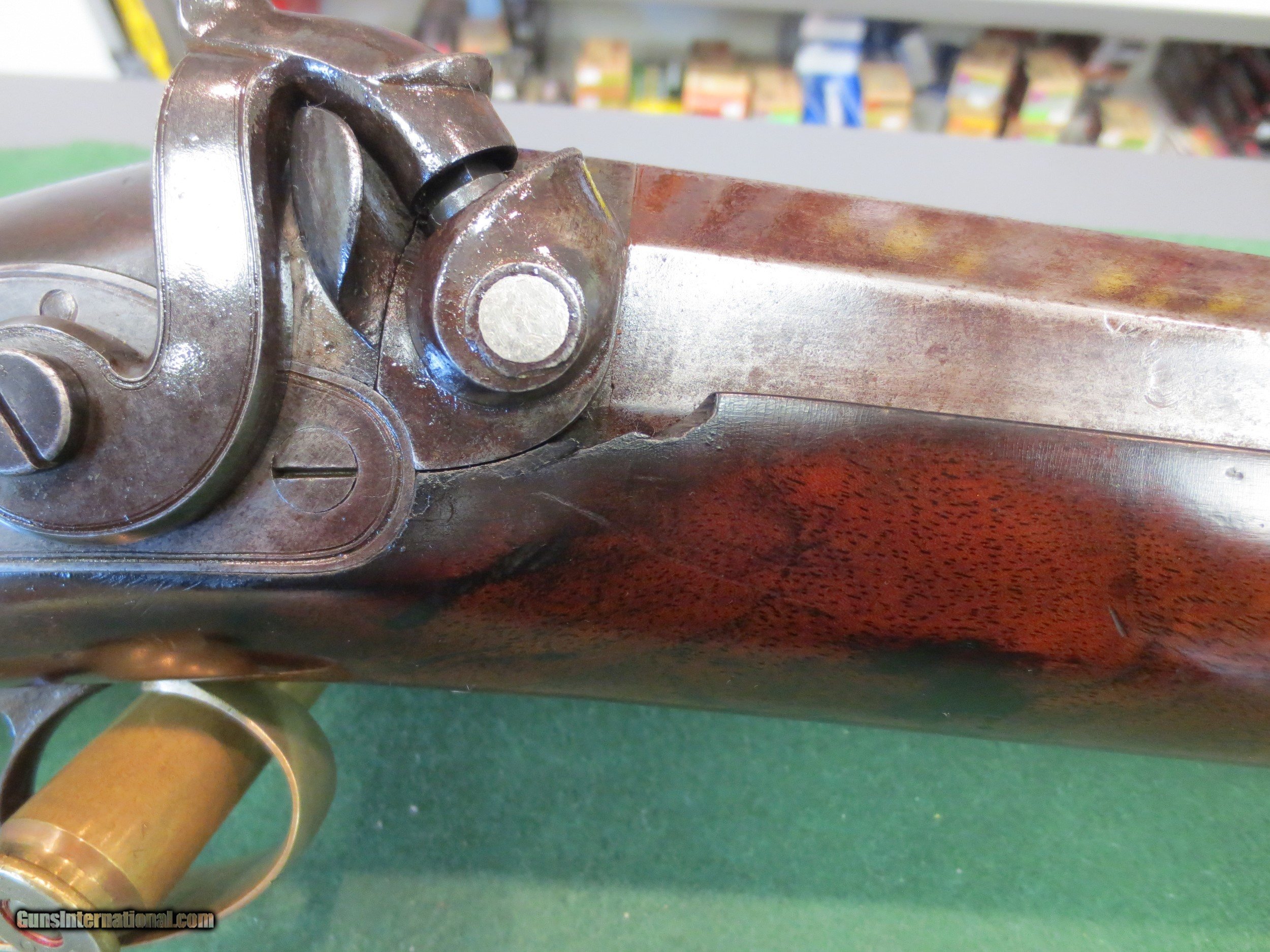 Description: S. C. Miller 8 Gauge percussion single barrel. “Samuel C Miller Maker New Haven CT” marked on top flat. Silver mountings, Thimbles, and Butt Plate. Weighs 16 lbs 7 oz. 0.100” wall thickness at muzzle. Double keyed. 40-1/8” Barrel , 14” LOP ,1-1/2” DAC, 2-1/4” DAH, cast off 3/8” Good condition bore overall. Small chip in wood just in front of snail breech. SOLD |