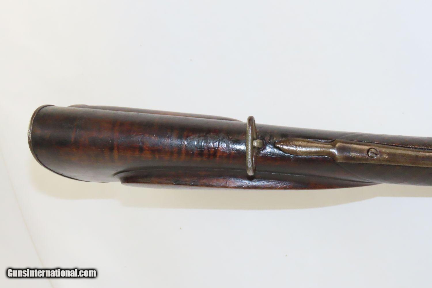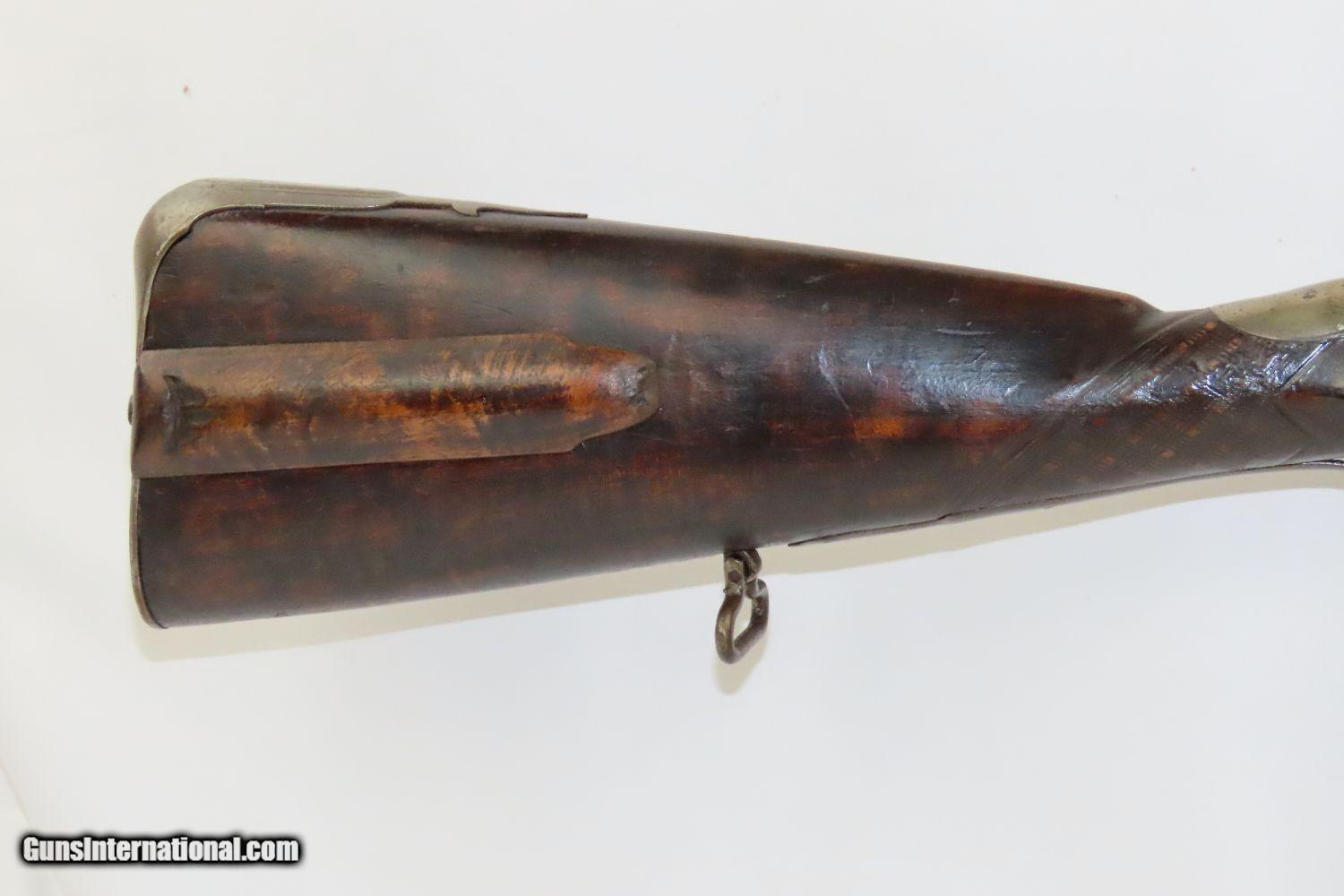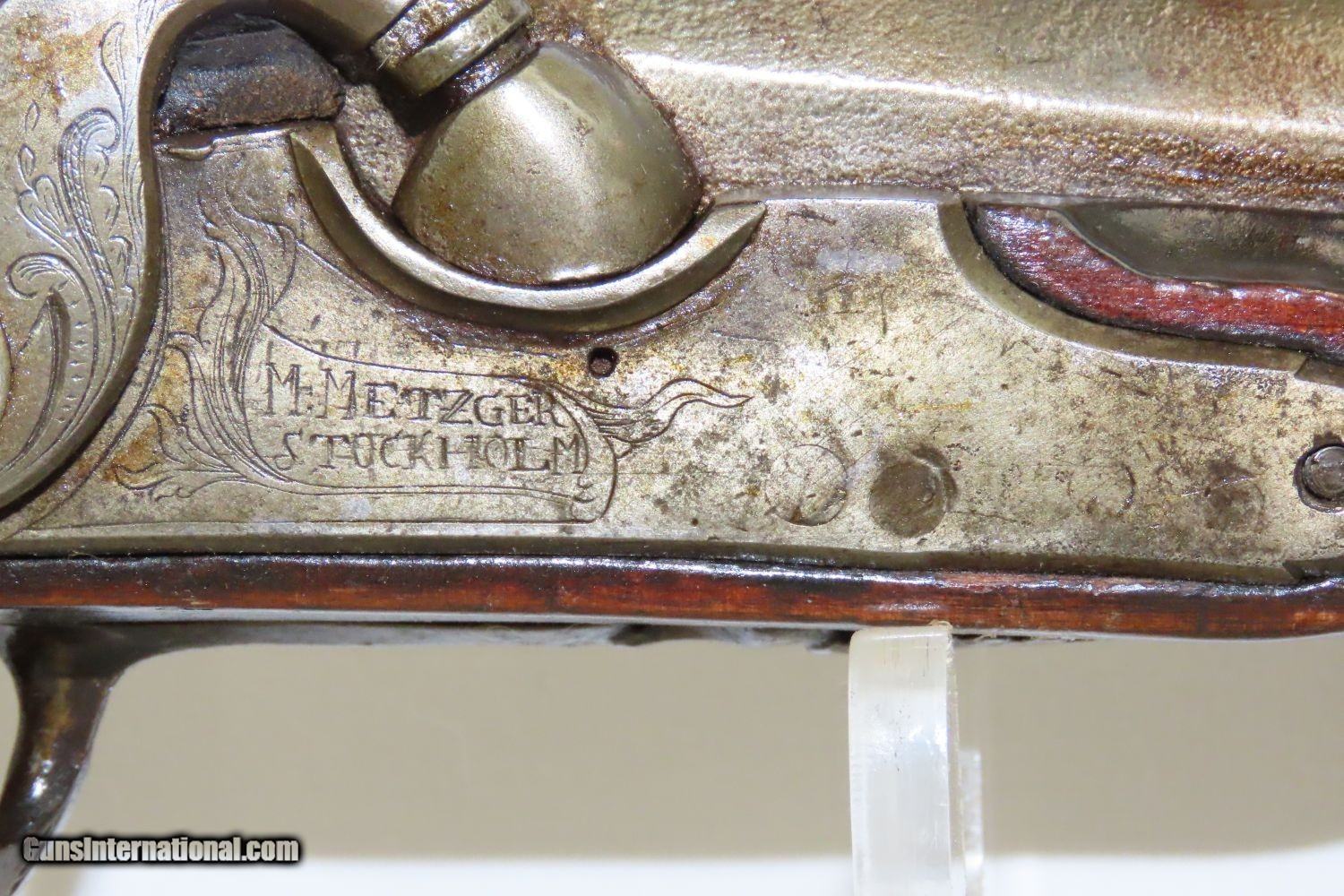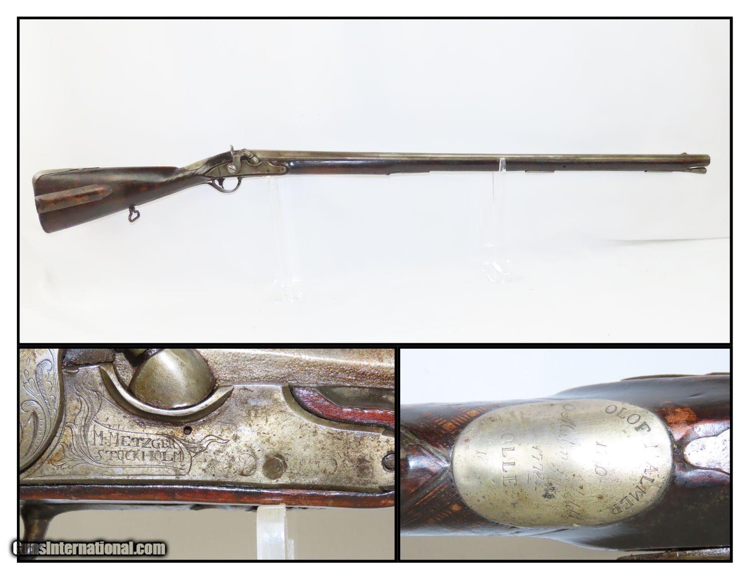 Description: STOCKHOLM SWEDEN Antique Metzger Marked PERCUSSION SINGLE BARREL Hammer Shotgun 1740s through 1840s Chain of Ownership! Here we present an antique M. Metzger Marked Percussion Shotgun, made sometime in the mid-19th Century in Stockholm, Sweden. This gun is likely from the lineage of Johan Michael Metzger, born in 1697 and died in 1776, who was a member of a noted Stockholm gunsmithing family active from the late 1600s through the mid-1800s. This shotgun was made in Stockholm, Sweden sometime around the 1840s or 50s. The overall condition is good. “M. Metzger/Stockholm” is marked on the lock. The placard atop the hand checkered wrist appears to read “OLOF MALMER/1740/ O.Malmer feldt /1772/OLLE/1842”, which may indeed be a chain of ownership. This idea is supported by the percussion conversion and it was probably used even later than the 1840s. Stable stock despite a small crack near the side plate. The bore is in good shape. The hammer is mobile and under good spring tension but it does not hold the cocked position. Own the original! This is a legitimate antique and not a reproduction. Barrels: 34 inches. Caliber: .69 Percussion Overall condition as seen in photos. Very Fast. Very Safe. FREE SHIPPING WORLDWIDE. Delivered directly to your door by express mail! Guaranteed AUTHENTIC & Includes CERTIFICATE OF AUTHENTICITY. ancestryguns $1175 #201881 SOLD Antique: Yes |