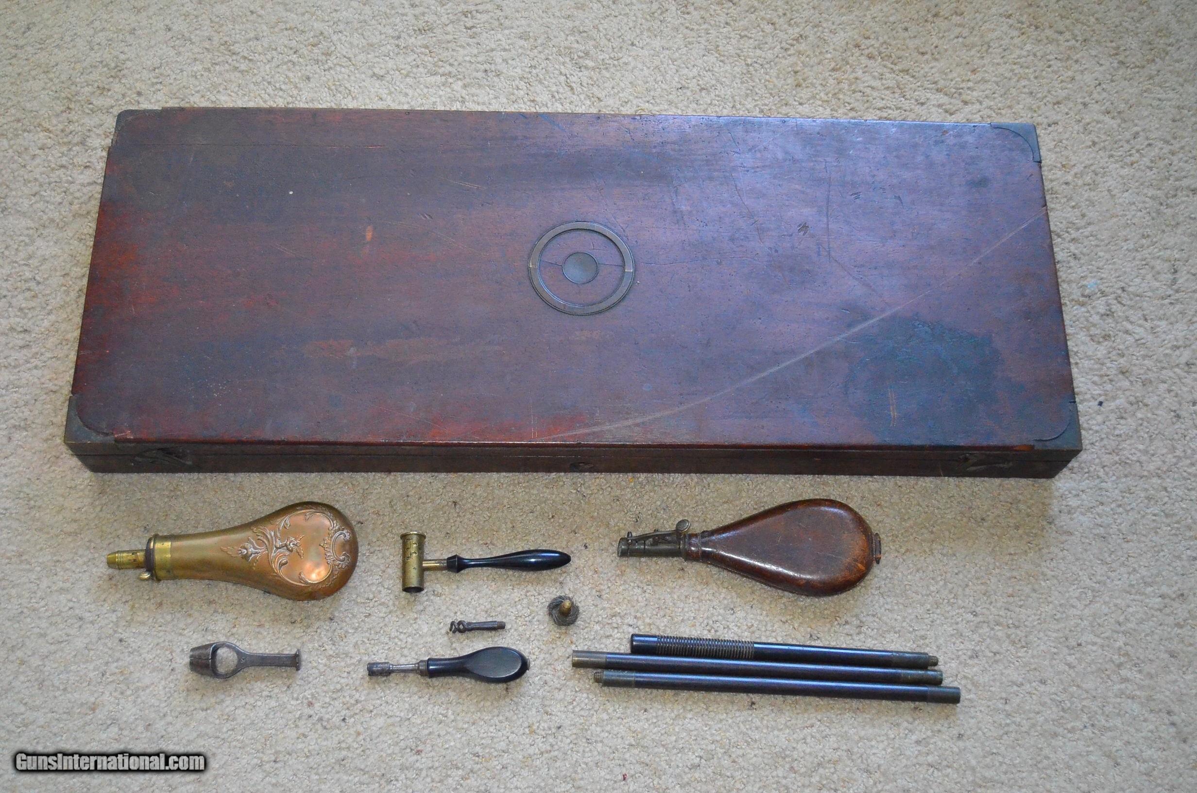 TL Lilley Damascus percussion double barrel with shotgun and rifle barrels, cased with tools