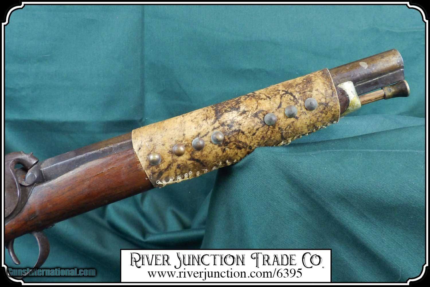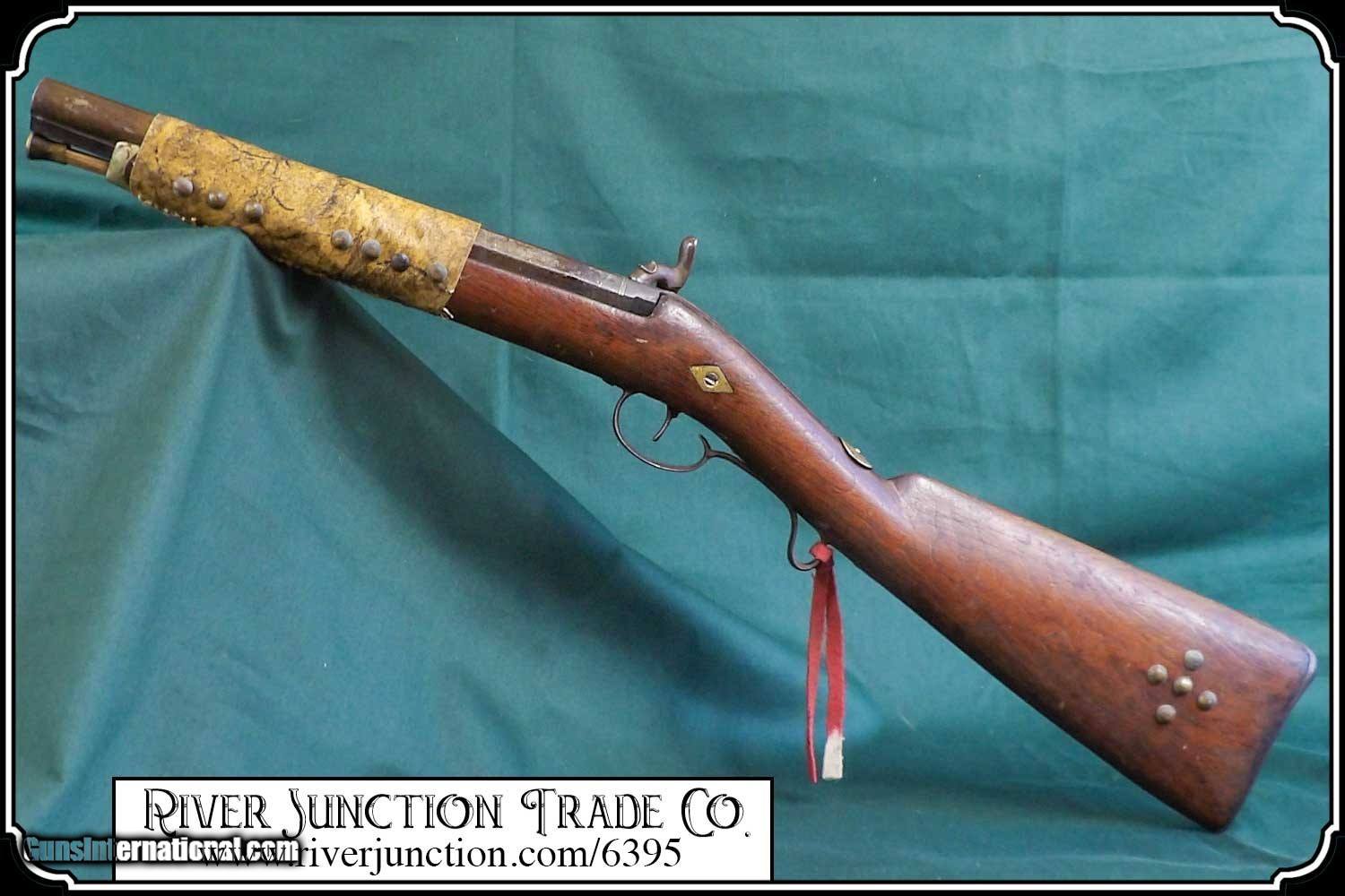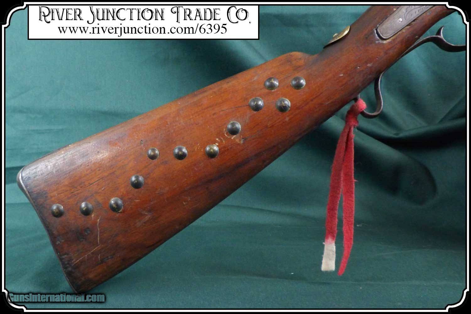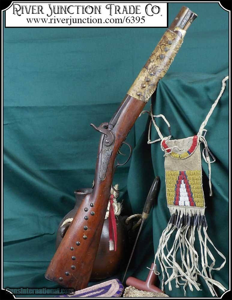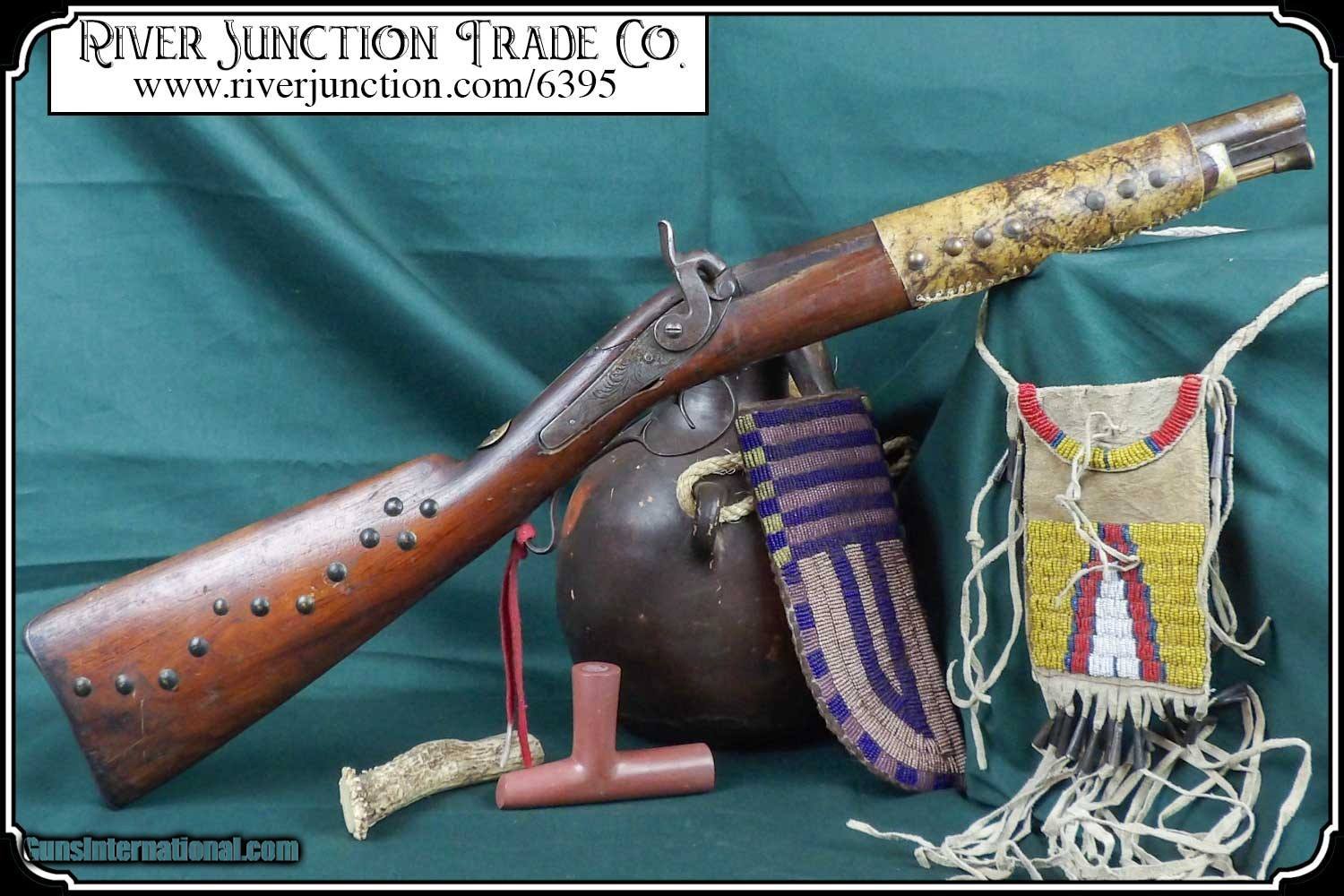 Description: Many weapons used by Native Americans would have been present at most of the late 19th century's most well-known battles, including the Battle of Little Bighorn. This was a single shot 12 ga. fowler and has since been sawed off to a 12 1/2 inch barrel. It has an overall length of 29 inches. The ramrod is 13 inches long. The wood has a small tack repaired crack above the lock mortise. The forearm and barrel have been rawhide rapped and tacked. The stock has tacks in the shape of a, snake? on the right side and on the left a small cross. The lock, hammer, trigger guard, function as they should. The breach plug is missing the nipple. This would have been a good horseback or canoe gun. The tacks on the stock make me think that it might have been a reservation gun and there is a small medallion on the top of the wrist of the stock reads US INDIAN SERVICE. It sure is interesting. Other items are not included. This is an ANTIQUE and can be shipped directly to you. (adult signature required) this is an Antique and I think a good sound shooter. No guarantees, warranties, or liabilities for any actual usage. If any firearms are to be used for shooting purposes, a qualified gunsmith should inspect them first. We will ship outside the U.S.A. Payment: Item, can be ordered on line with a credit card or paypal on our sight. Just Google (riverjunction) and type in the River Junction Trade Co. item number (6395) in the search box. Before you checkout you will see shipping cost and total. OR If you prefer: Pay by cash, postal money order, cashiers check, personal & business checks. We wait for checks to clear. We always answer questions and entertain offers. Have questions? Call me 563-880-4588. Jim SOLD |