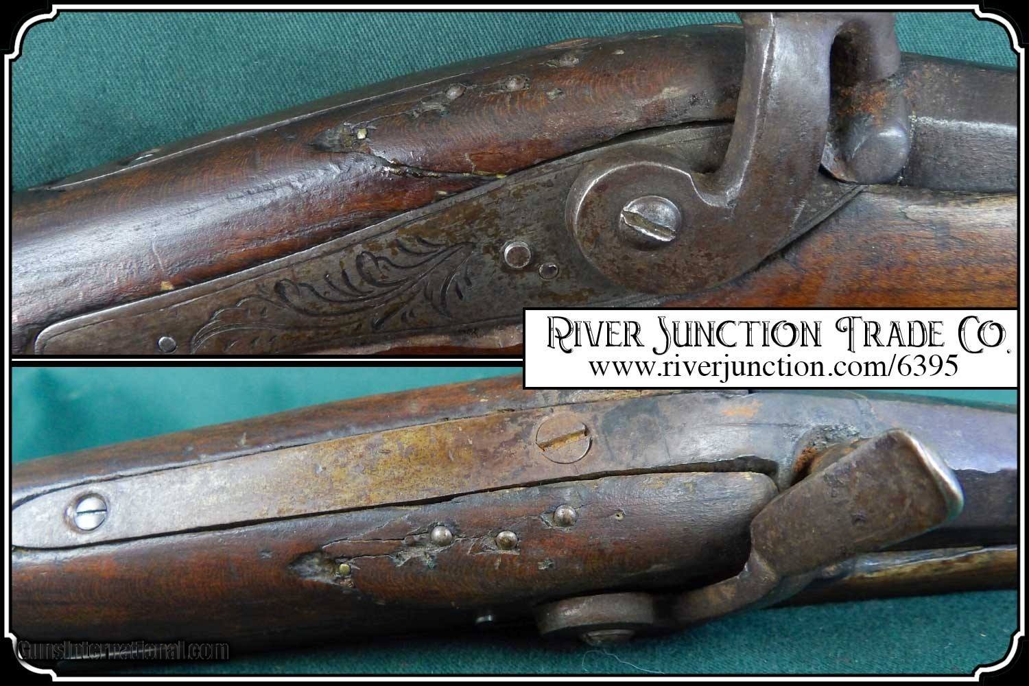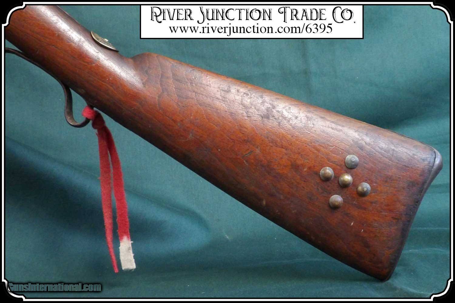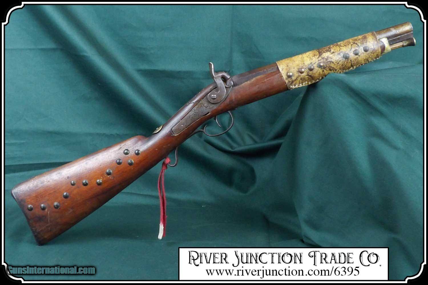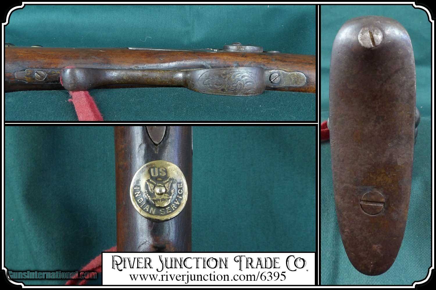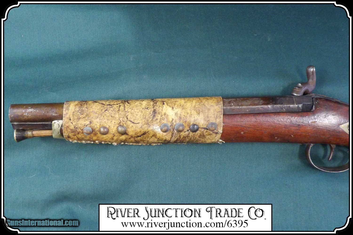 Description: Many weapons used by Native Americans would have been present at most of the late 19th century's most well-known battles, including the Battle of Little Bighorn. This was a single shot 12 ga. fowler and has since been sawed off to a 12 1/2 inch barrel. It has an overall length of 29 inches. The ramrod is 13 inches long. The wood has a small tack repaired crack above the lock mortise. The forearm and barrel have been rawhide rapped and tacked. The stock has tacks in the shape of a, snake? on the right side and on the left a small cross. The lock, hammer, trigger guard, function as they should. The breach plug is missing the nipple. This would have been a good horseback or canoe gun. The tacks on the stock make me think that it might have been a reservation gun and there is a small medallion on the top of the wrist of the stock reads US INDIAN SERVICE. It sure is interesting. Other items are not included. This is an ANTIQUE and can be shipped directly to you. (adult signature required) this is an Antique and I think a good sound shooter. No guarantees, warranties, or liabilities for any actual usage. If any firearms are to be used for shooting purposes, a qualified gunsmith should inspect them first. We will ship outside the U.S.A. Payment: Item, can be ordered on line with a credit card or paypal on our sight. Just Google (riverjunction) and type in the River Junction Trade Co. item number (6395) in the search box. Before you checkout you will see shipping cost and total. OR If you prefer: Pay by cash, postal money order, cashiers check, personal & business checks. We wait for checks to clear. We always answer questions and entertain offers. Have questions? Call me 563-880-4588. Jim SOLD |