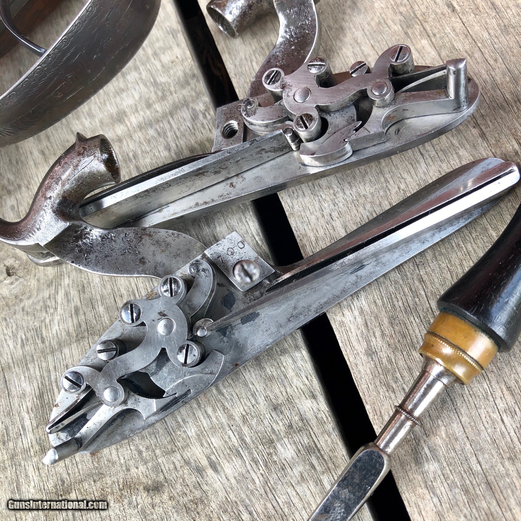 Description: A very good NEEDHAM & CO., LONDON double barrel 16 bore percussion sporting gun that is ready for the field. This lovely little sporting gun has had some work done over the years but it is, after all, more than 170 years old. The 30" damascus barrels are finished with an old rebrown exhibiting strong damascus pattern and strong color. The still deep and clearly legible top rib engraving may be just a touch soft but it takes an experienced eye to discern it. Most importantly, these handsome damascus barrels have fine bores just like you want, making them safe and a pleasure to load and clean. The perfectly functioning island locks - I love the look and extra effort these island locks require - are border, scroll, and game scene engraved with a charming pair of grouse on the right lock plate and pheasant on the left lock plate. They locks have been polished bright at some point long ago but they have dulled nicely. The internals are superb - very clean throughout, rare and fantastic five screw bridals, springs as strong as when they left the bench, and serial numbered. The walnut stock features good figure, sharp checkering and a great finish, no doubt freshened at some point. Extra features on this London gem include platinum pillow blocks to protect the forearm wood from the sharp edges of the barrel breeches when putting it together and platinum blow out plugs too. The iron furniture has been reblued and not quite as well as my eye would like. This work is particularly evident from the butt plate tang where the engraving is noticeably soft. Nevertheless, the gun has quite an appealing appearance. Mechanically it is perfect and ready for use. The maker, William Needham, was no ordinary London gunmaker; he was quite inventive and respected. He built the first commercial hammerless gun - a needle-fire in 1852 - and the first successful ejector gun. No less than the venerable W.W. Greener thought well enough of Needham's work to acquire the business in 1874 and to continue to sell guns under the Needham name thereafter. William Needham did business under the name Needham & Co. at 26 Piccadilly, the address engraved on the top rib near the breech of this gun, between 1844 and 1849, enabling us to positively date the gun to that period. Here's a chance to own a great little English double barrel 16 bore percussion sporting gun by a great London maker at a very reasonable price. Indeed, you couldn't even have just one of the superb locks of this gun made for the price. This London gem represents a great value for the hunter, shooter or collector. SOLD Antique: Yes Manufacturer: William Needham / Needham & Co. Model: 16 bore double percussion sporting Serial Number: 700 Bore: 16 Condition: very good Metal Condition: fine as refinished Wood Condition: fine as refreshed Bore Condition: fine Barrel Type: damascus Action: percussion sidelocks Triggers: double Gauge Info: 16 Stock: walnut Manufacture Date: 1844-49 |