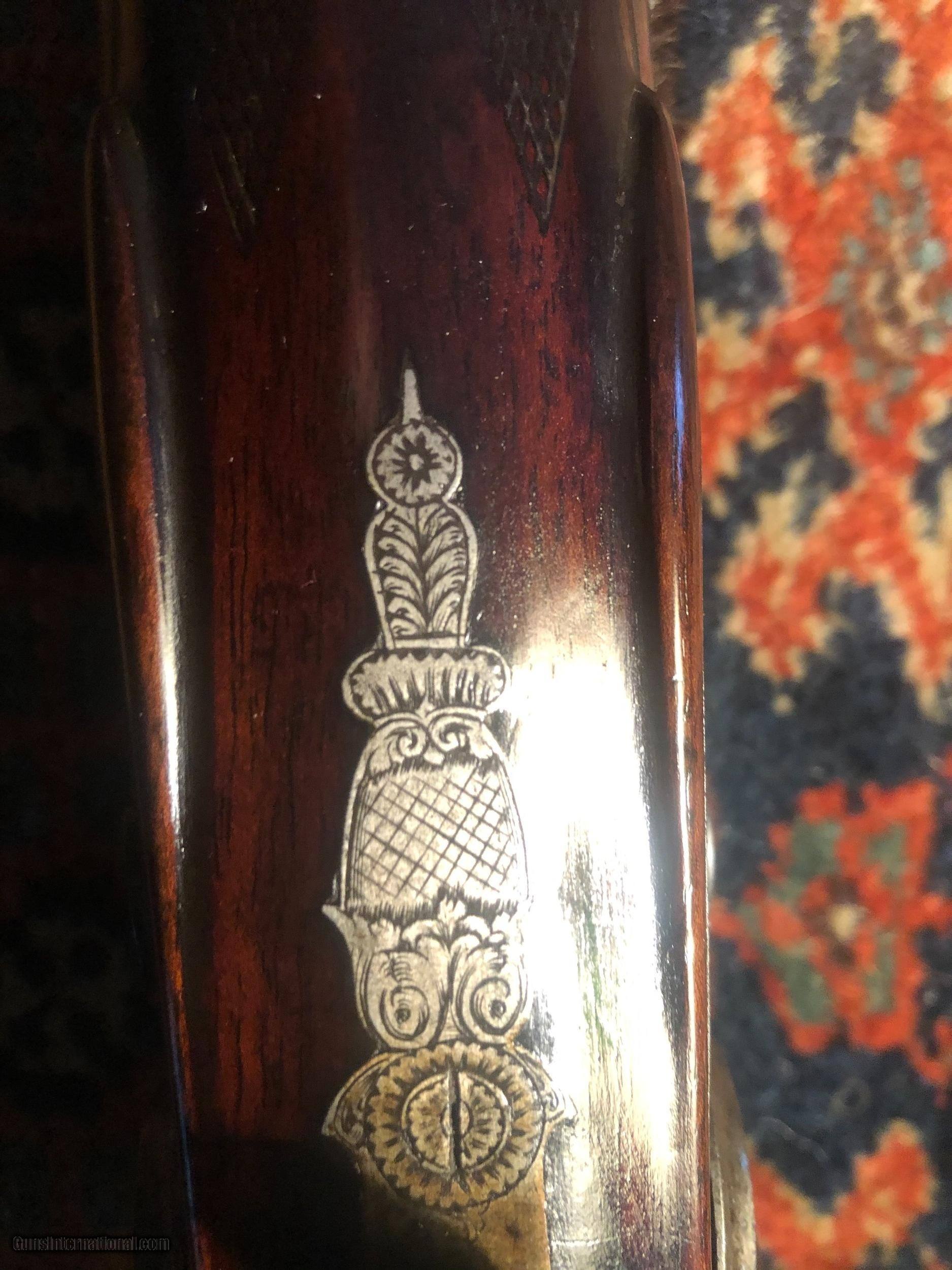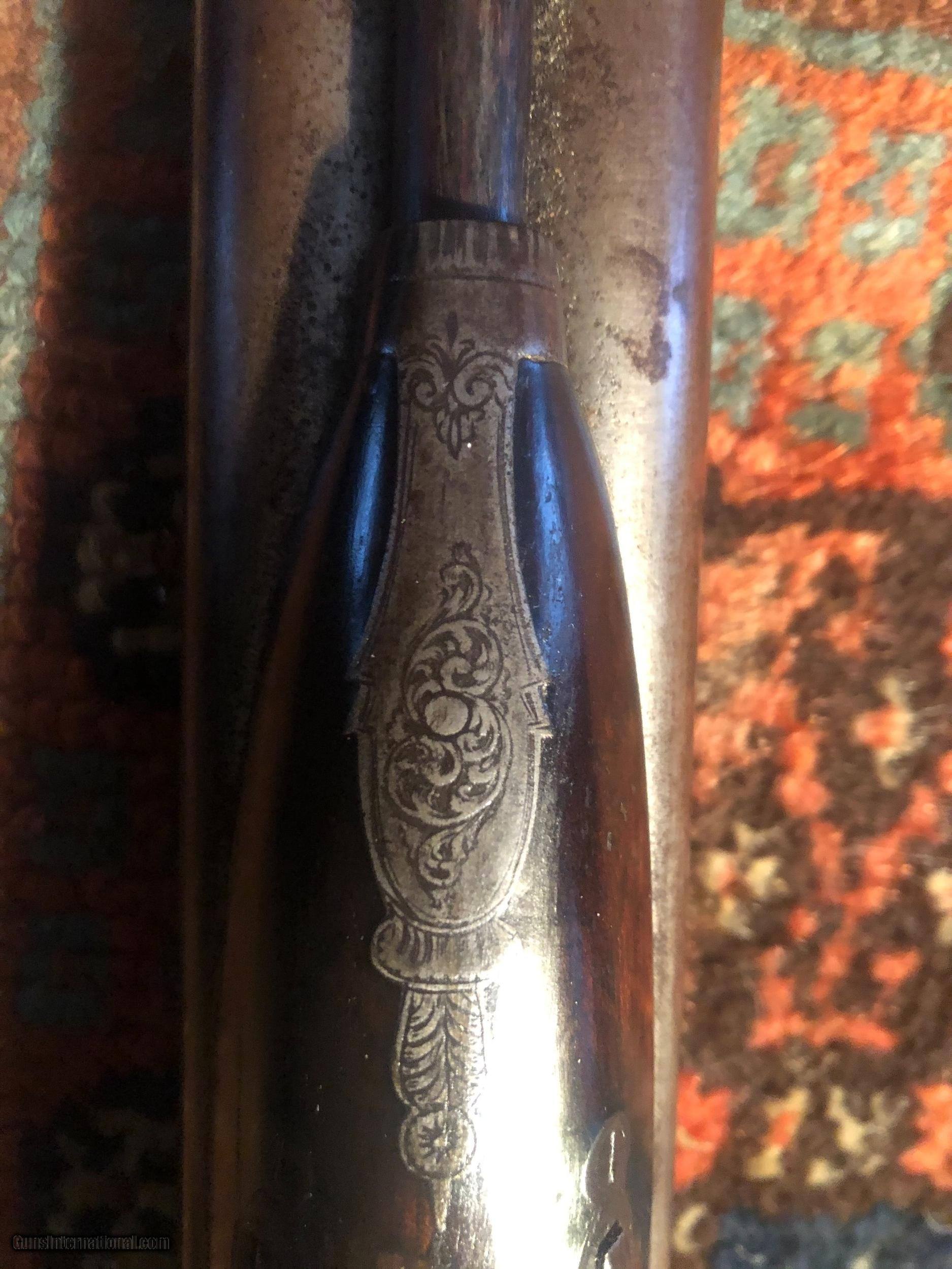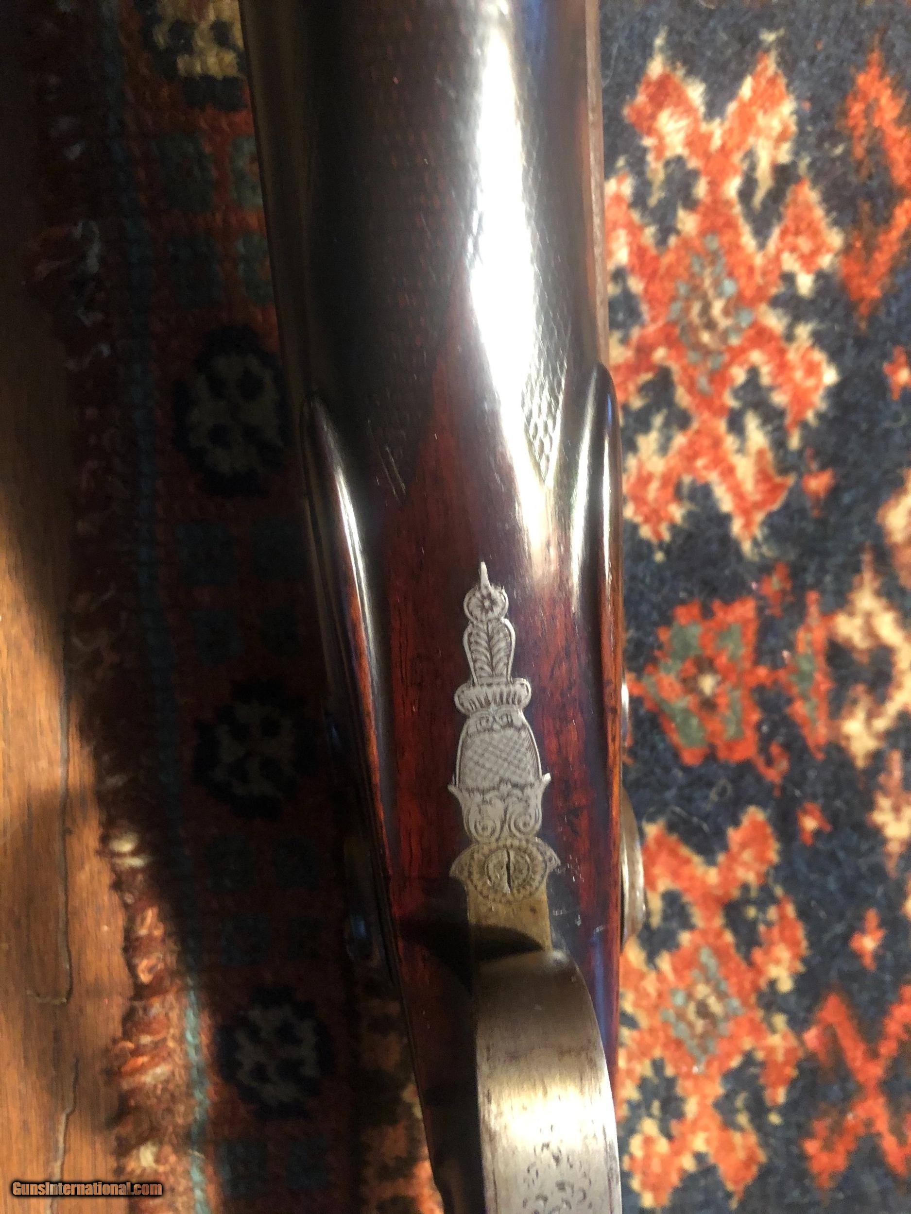 Description: Beautiful high grade Greener percussion. little use great bores and nipples, sharp engraving, tight, functions perfectly, 7 lbs, 28 inch barrels, not cut, original ramrod, fantastic stock, comes up great SOLD |