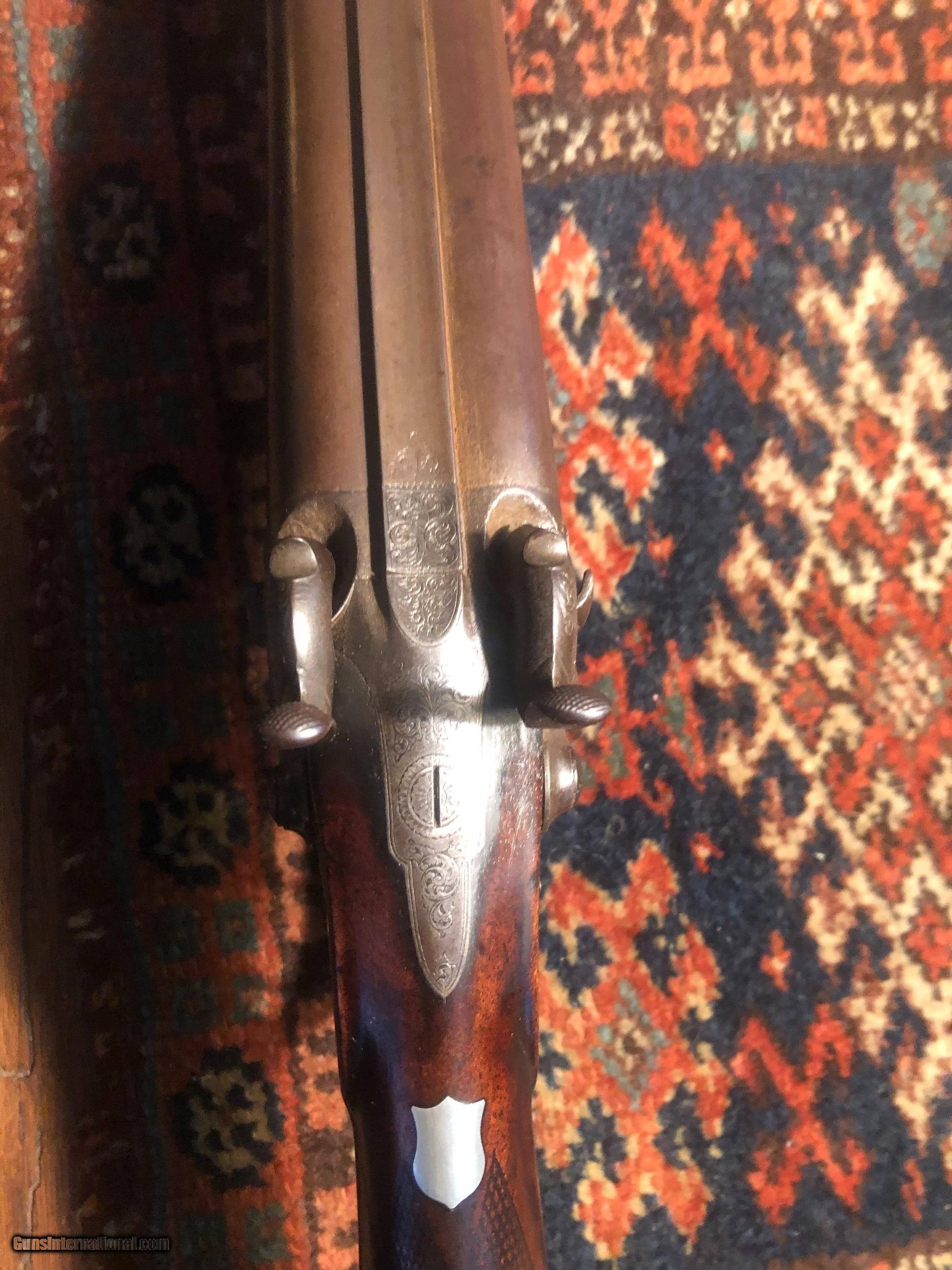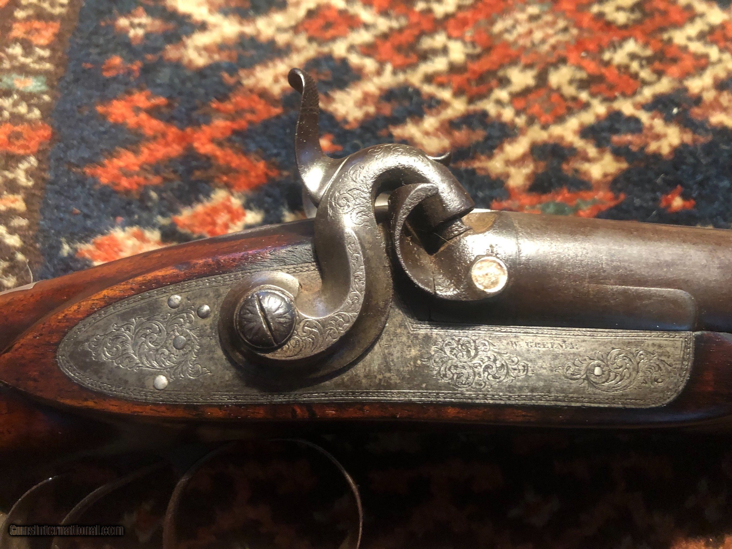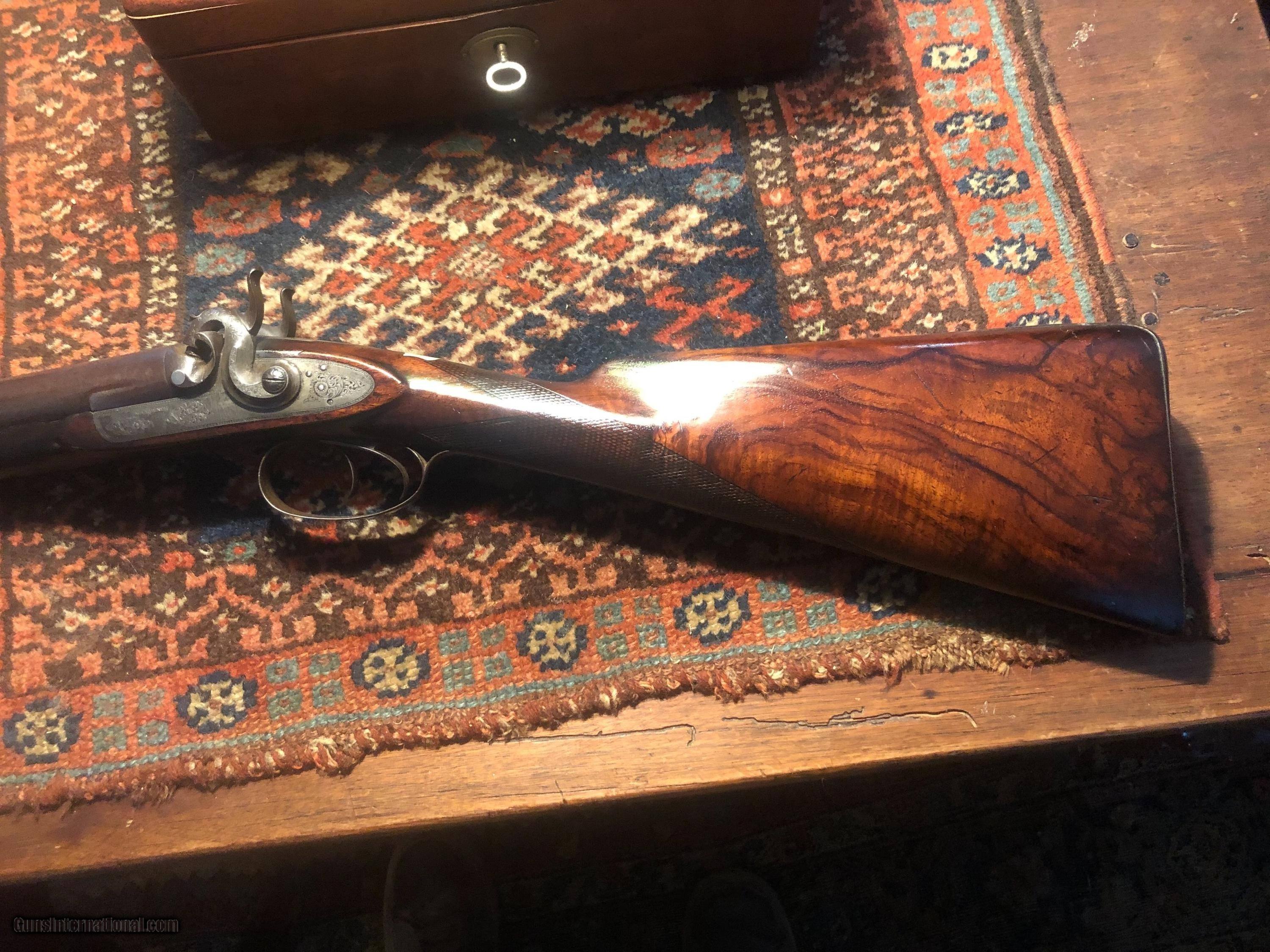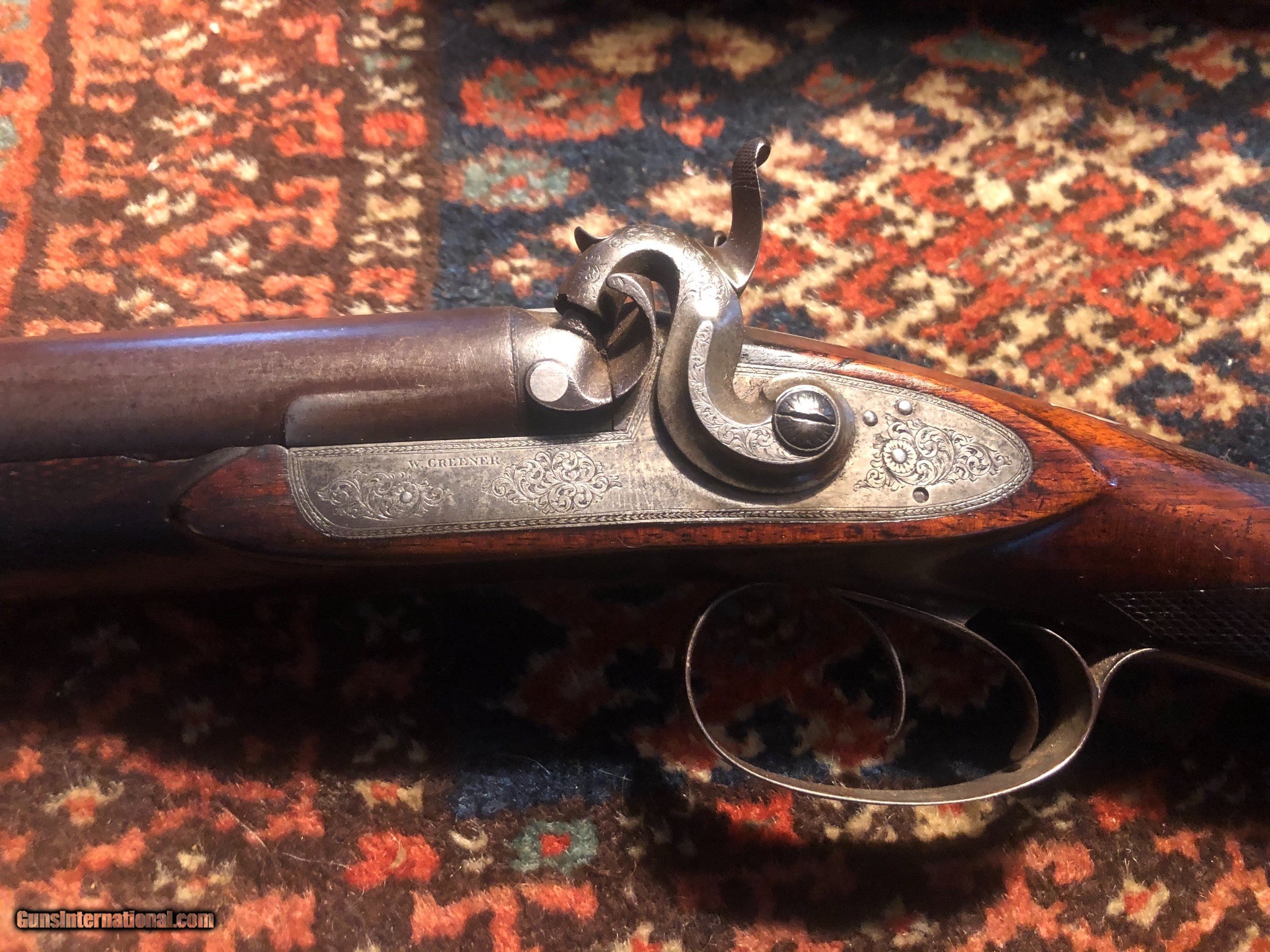Description: Beautiful high grade Greener percussion. little use great bores and nipples, sharp engraving, tight, functions perfectly, 7 lbs, 28 inch barrels, not cut, original ramrod, fantastic stock, comes up great SOLD |