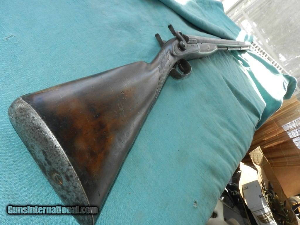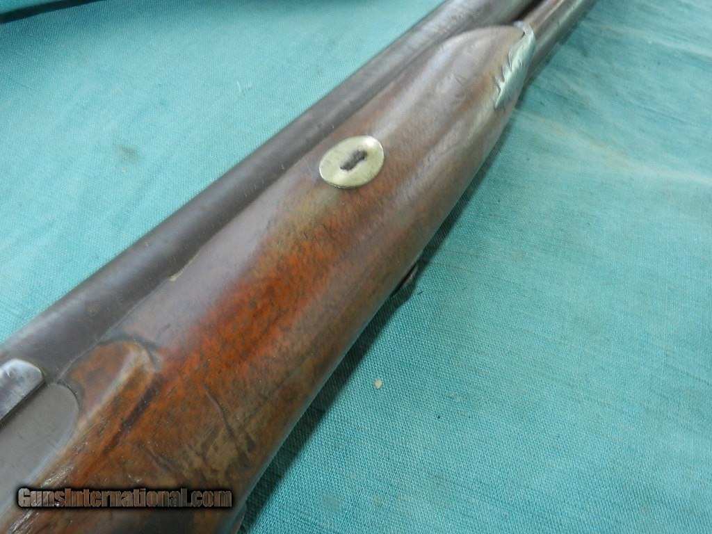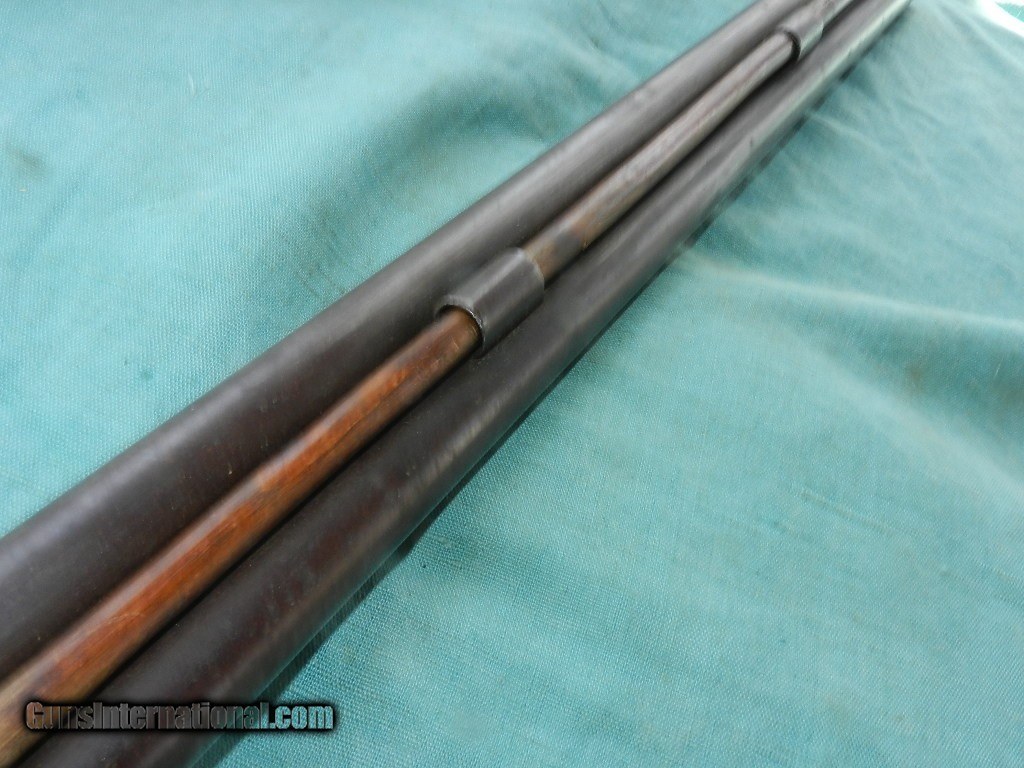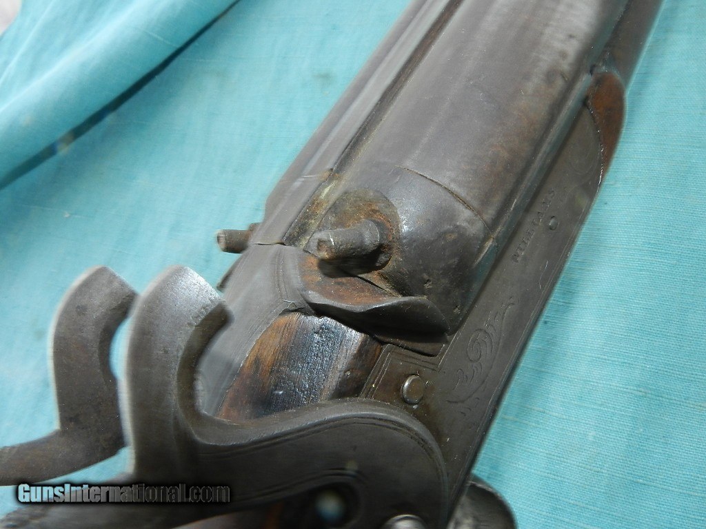 Description: <<<SOLD>>>>A clean 19th centiury fine English muzzle-loader 10ga hammer double shotgun with 30 1/2" damascus barrels with surprisingly clean barrels with the right tube having some surfacde corrosion ablout 10" doesn in spots ,but not pitted-out or rusted -out! Both hammers match and locks work well. Lock-plates well marked, and the top of the barrel states : LONDON FINE TWIST with bown and grey patina on the exterior. The English walnut stock issolid with strong hand checkering at the wrist and this stock may have been re-fijished in it's life. Left tube has a choke of .650 amd the right tube measures about .640". Comes with a plain hardwood ram-rod that has a mashed head from usage.When buying a gun always have it examined by a competent gunsmith before shooting. To buy a gun from me you must get a direct email for me, with details, and shipping cost. We don’t have a web site .I prefer money orders or a check. Item ships when funds come in. I try to keep guns affordable, which means I make less money than most dealers. You won’t get altitude sickness, or nose bleed, with my prices! I consistently have the best selection of older guns If you attempt to buy, you must still contact us for details . Best to email to buy. Sometimes a local person can stop buy and purchase before the gun is removed. Sometimes not home to get calls. Some guns are required shipment to a gun dealer near you for a transfer to you when it arrives. Otherwise many older or black powder guns ship to your door. With the widest selection of older guns at great prices, We don’t have a store, and sell on the internet only. I’m easy to get along with. Thank You SOLD Antique: Yes |
