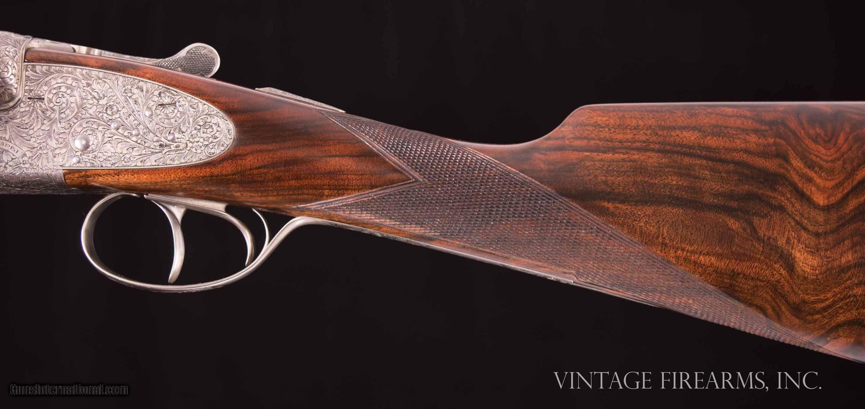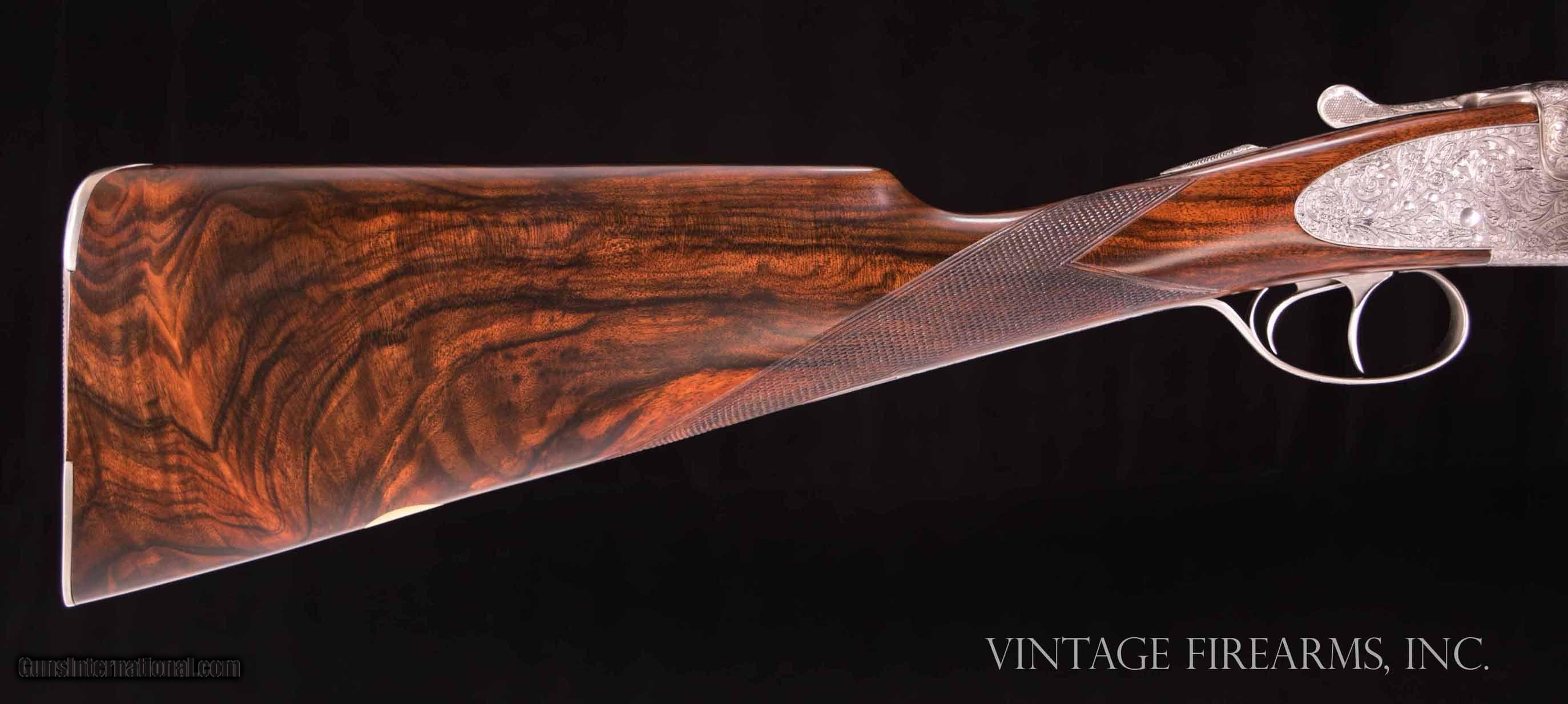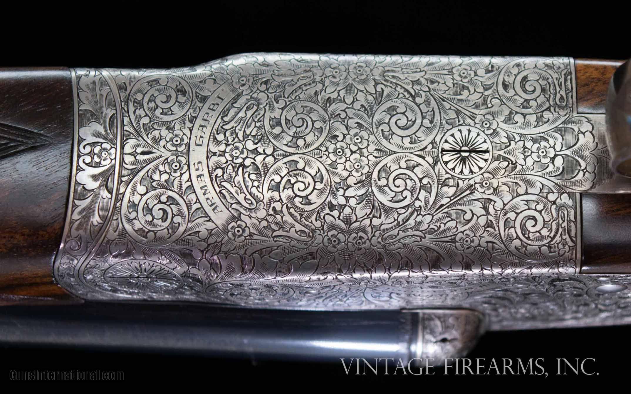 Description: Garbi 103-A SPECIAL 16 Gauge SxS DELUXE ORNAMENTAL ENGRAVING, UPGRADED WOOD, THE BEST! General Specs: Garbi, Year 2005, 16 Gauge, 6lbs 10oz, Side-by-Side Serial Number: 27-03-002-5 Armas Garbi builds a traditional English style gun based on the Holland & Holland type sidelock action. These guns feature chopper lump barrels, automatic ejectors, 5-pin side-locks and articulated front triggers as standard equipment. Considered the best of the Spanish BEST gunmakers, the Garbi is an incredible value for a BEST gun in every way, with hand engraved actions, hand checkered stocks fitted to perfection, and highly polished internal parts. This particular Garbi is considered a Model 103-A Special, as it has many factory-ordered extra-cost features that really make this a special gun. William Larkin Moore is the North American supplier for Armas Garbi and if you go to their to price this gun out with all of the extra-order features the cost would exceed $23,000 new. This gun is as new without a flaw and can be bought for a fraction of that cost. Extra-order features include: deluxe ornamental engraving, upgraded wood, 29” barrels, rounded action, heel and toe plates, gold stock shield, rolled edge trigger guard, file cut rib, and low-profile safety. Look at the photos carefully…the gun is perfect in every way with little use since its build date in 2005. The wood is off-the-charts Turkish walnut with dimensions of 14 7/8” x 2 ¼” x 1 ½” x 5/16” cast off, the full coverage hand cut engraving is superb, the 29” chopper lump barrels are choked IC/M, the gun balances perfectly in hand, and the mechanics are perfect in every way. You could not find or want a more attractive, well-appointed gun for anywhere near the money we are asking for this gun. Thank you for your continued support and looking at our guns. Enjoy! Barrels Barrel Length: 29" Chokes: .010/.016 IC/M Bores: perfect mirror Bore Diameter: .664 both Wall Thickness: .029/.032 % Blue: 99% Chambers: 2 3/4" Ribs: tight Sights: single Action Action: tight, way right of center Ejectors or Extractors: ejectors, strong, timed Case Color: coin finish Screws: perfect Engraving: No. 2 Deluxe Ornamental Trigger Type: double, articulated Trigger Guard Color: coin 100% Stock Type: upgraded turkish LOP: 14 7/8" LOP To End Of Wood: same DAH: 2 1/4" DAC: 1 1/2" Cast: 5/16" off Checkering Condition: perfect Butt Treatment: heel/toe plates There are more photos upon request. We offer a 30 day mechanical warranty on this fine shotgun. Call us for full details. PLEASE SEE MY OTHER FINE VINTAGE FIREARMS. Just open one of my ads and click on the line that says “see all items from this seller” and a very nice list of fine sporting and collectible arms will appear. I have many more fine sxs shotguns not yet listed. Thanks for looking! We employ a full time gunsmith on premises and can perform alterations to suit your needs within a few weeks of purchase. Payment Methods: Money Order, Certified Check, Personal Check, Wire Transfer Inspection Period / Return Policy: Three Days from the date the item was received. Sales Tax: 6% Michigan Only Shipping & Insurance: Ground $95.00 We ship internationally! Item Condition: Used Requires FFL?: Yes If you have any questions about this item or payment, please email or call us directly, at #616-292-6240. Thanks! Vintage Firearms Inc We employ a full time gunsmith on premises and can perform alterations to suit your needs within a few weeks of purchase. Common requests are: -stock bending to suit your particular requirements -addition of any specified butt pad to increase length of pull -alteration of chokes to suit your shooting preferences -lengthening of chambers and forcing cones -darkening stock color with penetrating stains -restoring any part of the gun including rust blue, charcoal blue, bone and charcoal case color, wood restoration and checkering recuts. If you like one our guns but it needs "tweaked", let us know and we can quote you a time and price. Some enthusiasts like the guns "as found" and others want them "just so". We often list guns as found and let the particular buyer choose how they want their gun to fit or look. SOLD |