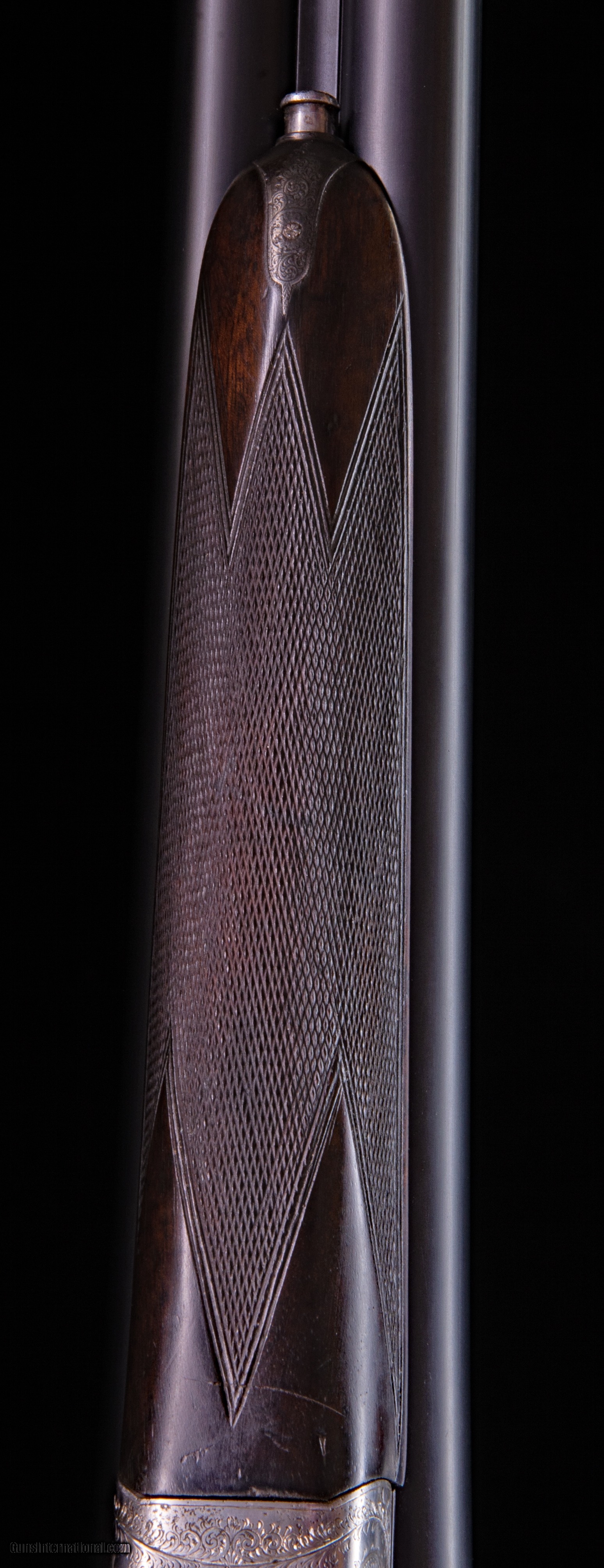 Description: Hammerless Sidelocks - Built around 1905 makes this fine shotgun a true Edwardian driven bird gun. Excellent bright clean barrels which are tight to the action. This is a lot of English sidelock for the money *** Note: To see this gun with high resolution photos and a zoom-in feature, go to the vintagedoubles main site and search for the gun ID: 4997 or browse the main site to see our full gun collection. SOLD Manufacturer: Army and Navy C.S.L. Sidelock with nice wood and dimensions ~ These W.C. Scott sidelocks are a real value ~ 2 3/4" proofs! Model: None Serial Number: 45452 Ejectors: Yes Barrels: 30 Barrel Type: Steel Action: Sidelock Ejector Gauge Info: 12 gauge Stock Comb: 1 1/2 Stock Heel: 2 1/8 Stock Cast: 1/4 LOP: 14 1/2" with c Weight: 6lbs 9.5ozs Choke Left: .041 extra full Choke Right: .011 IC Proof:Nitro: 2 3/4 Minimum Wall Thickness Left: .026 Minimum Wall Thickness Right: .026 |