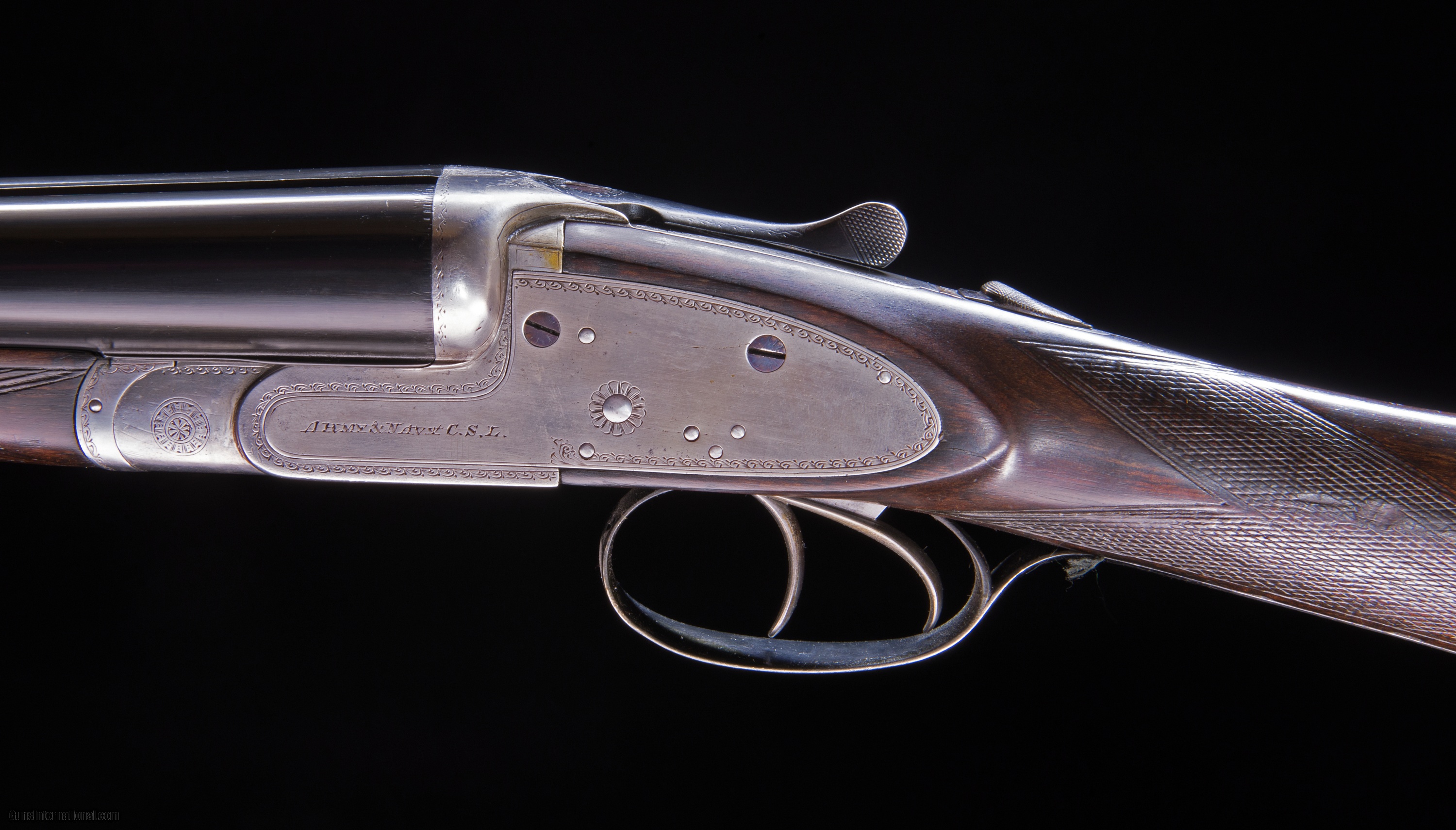 Description: Hammerless Sidelocks - This is a well made gun but has had some stock modifications done by a professional to fit a specific shooter. It would make a great restock project or just shoot it as it is. The current dimensions are very modern. It would also for the artisan be fun to try grain painting and make the stock changes invisible. *** Note: To see this gun with high resolution photos and a zoom-in feature, go to the vintagedoubles main site and search for the gun ID: 3470 or browse the main site to see our full gun collection. SOLD Manufacturer: Army & Navy 12 ga. Sidelock ~ Model: None Serial Number: 57519 Ejectors: Yes Barrels: 30 Barrel Type: Steel Action: Sidelock ejector Gauge Info: 12 gauge Stock Comb: 1 3/8 Stock Heel: 2 Stock Cast: 5/16 LOP: 14 3/4" (13 3/4" ori Weight: 6 lbs. 8 oz. Choke Left: .036 full Choke Right: .003 skeet 1 Proof:Nitro: 2 1/2" nitro Minimum Wall Thickness Left: .034 Minimum Wall Thickness Right: .028 |