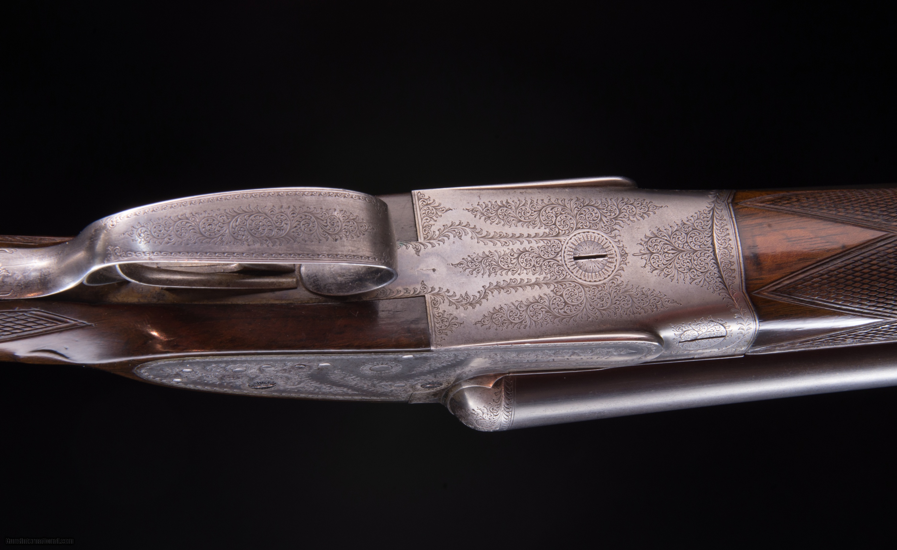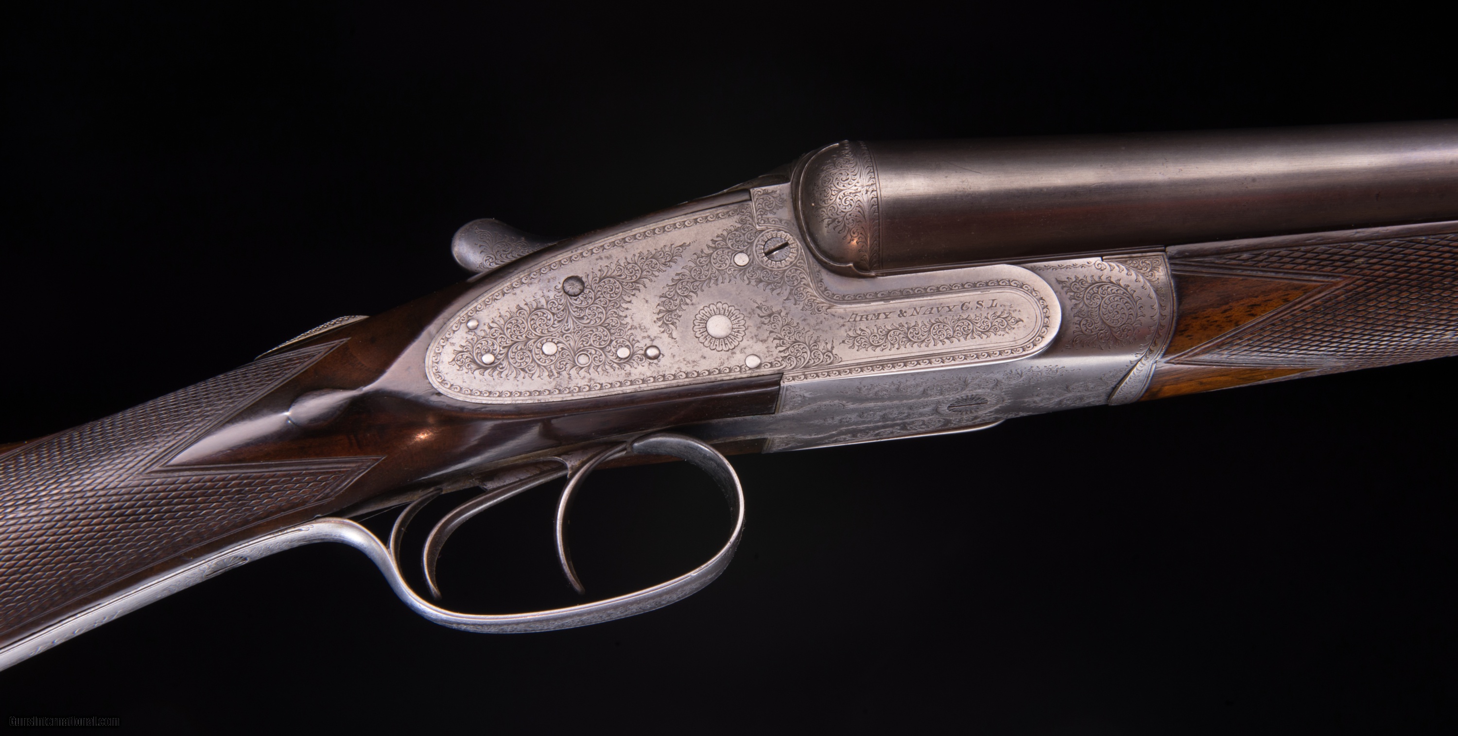 Description: Hammerless Sidelocks - This is a very nice English sidelock. Made for J.Harrison Esquire on 25th of June in 1897 for 20 pounds, She is tight on face with barrels that ring well and have excellent wall thickness. It is quite possible this gun was London built as it has its original London proof marks on the barrel flats. The Bores on this fine shotgun are extremely bright and shiny with no pitting or dents that we can see.