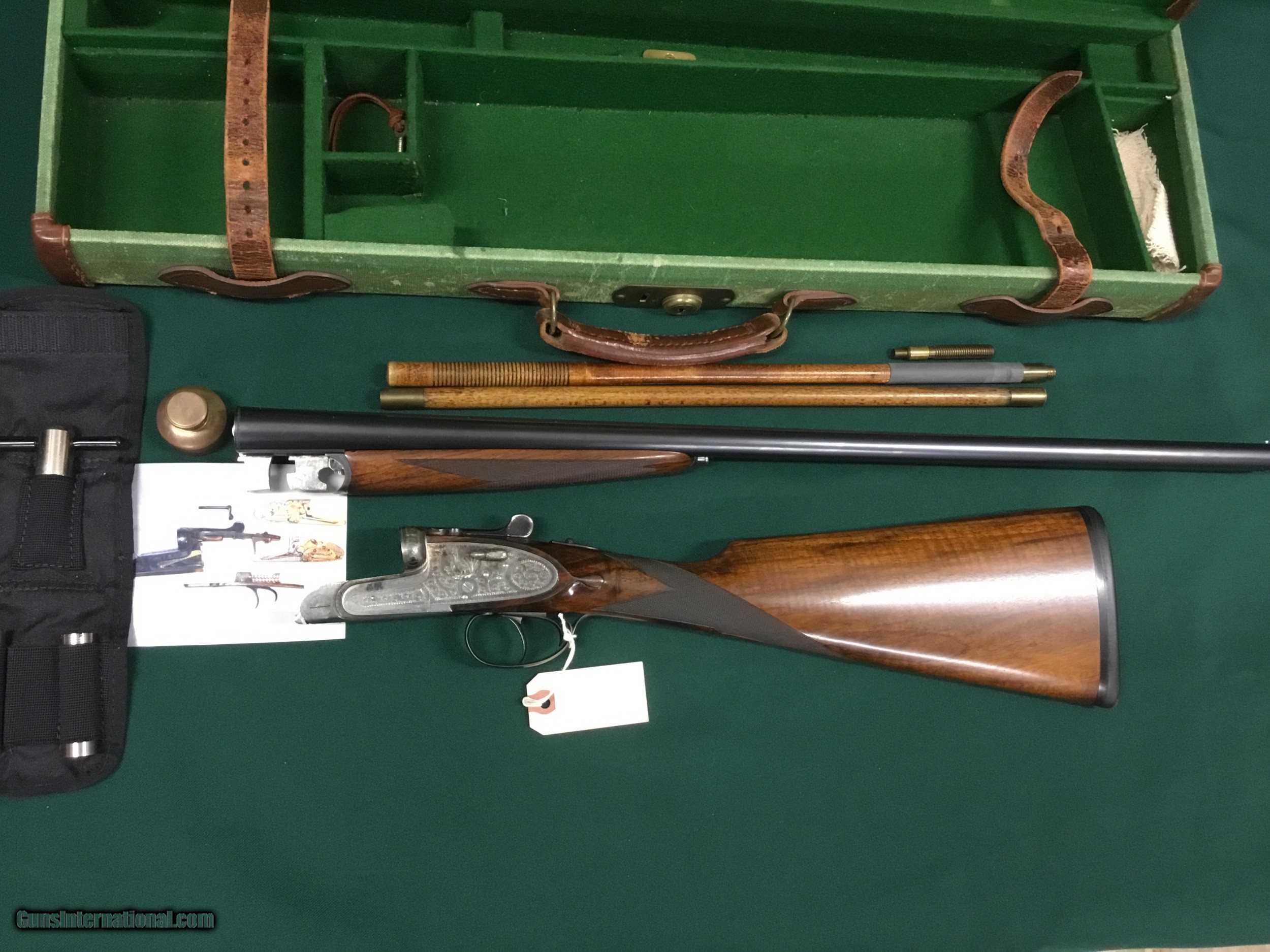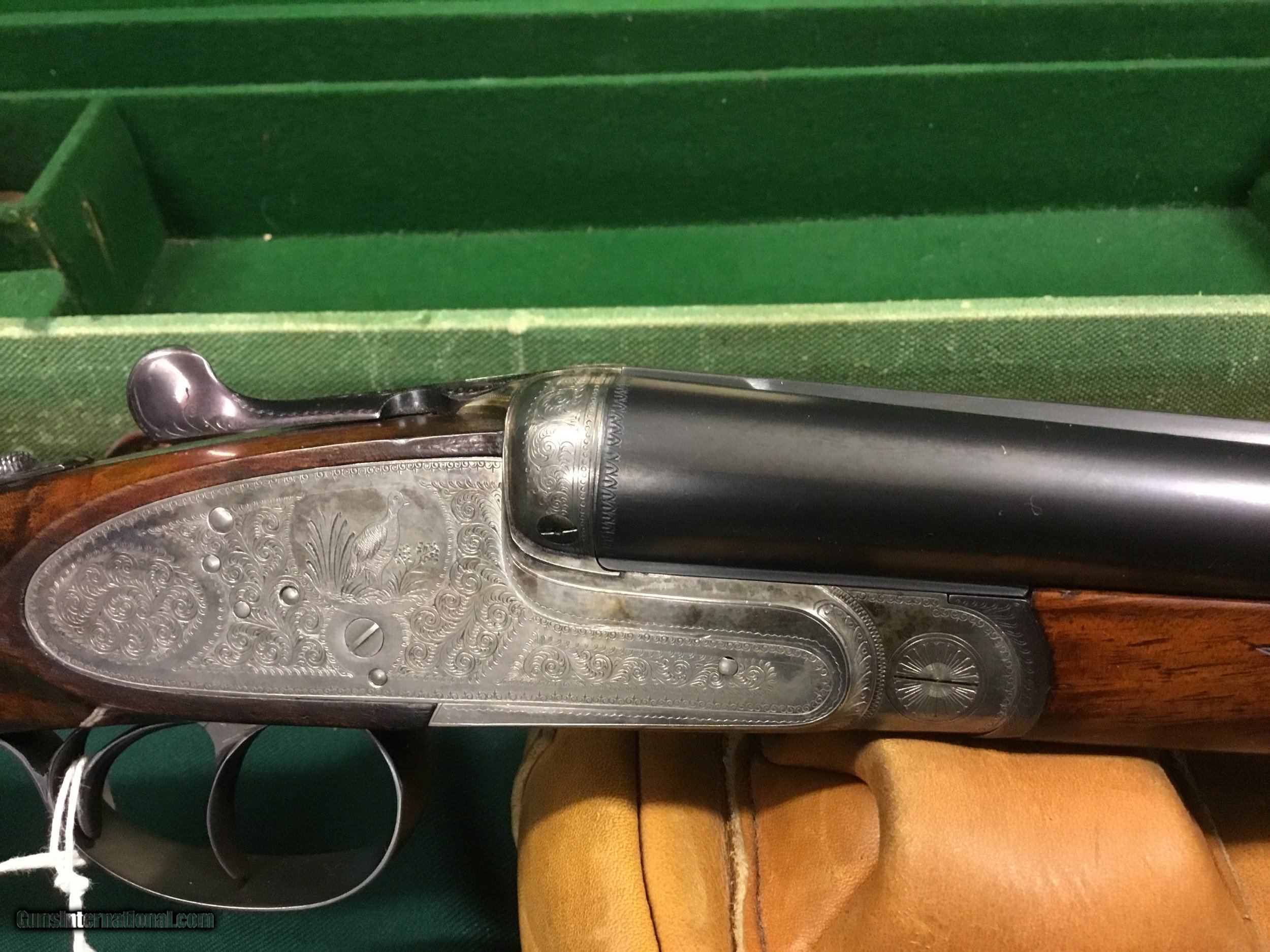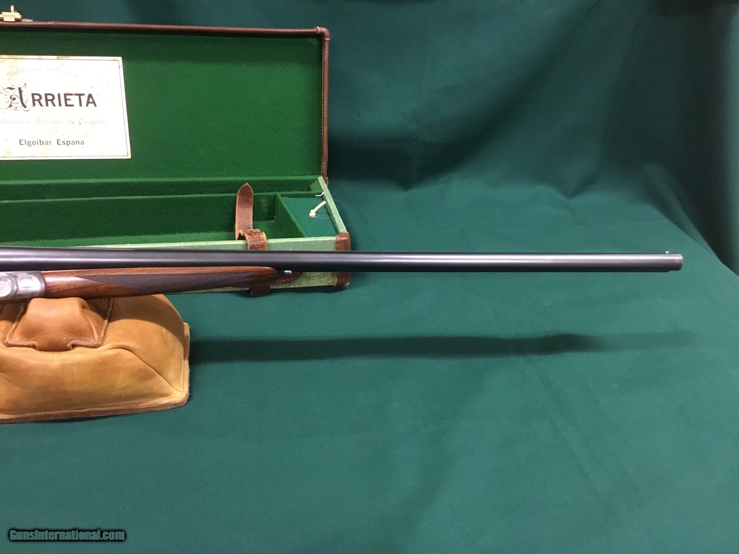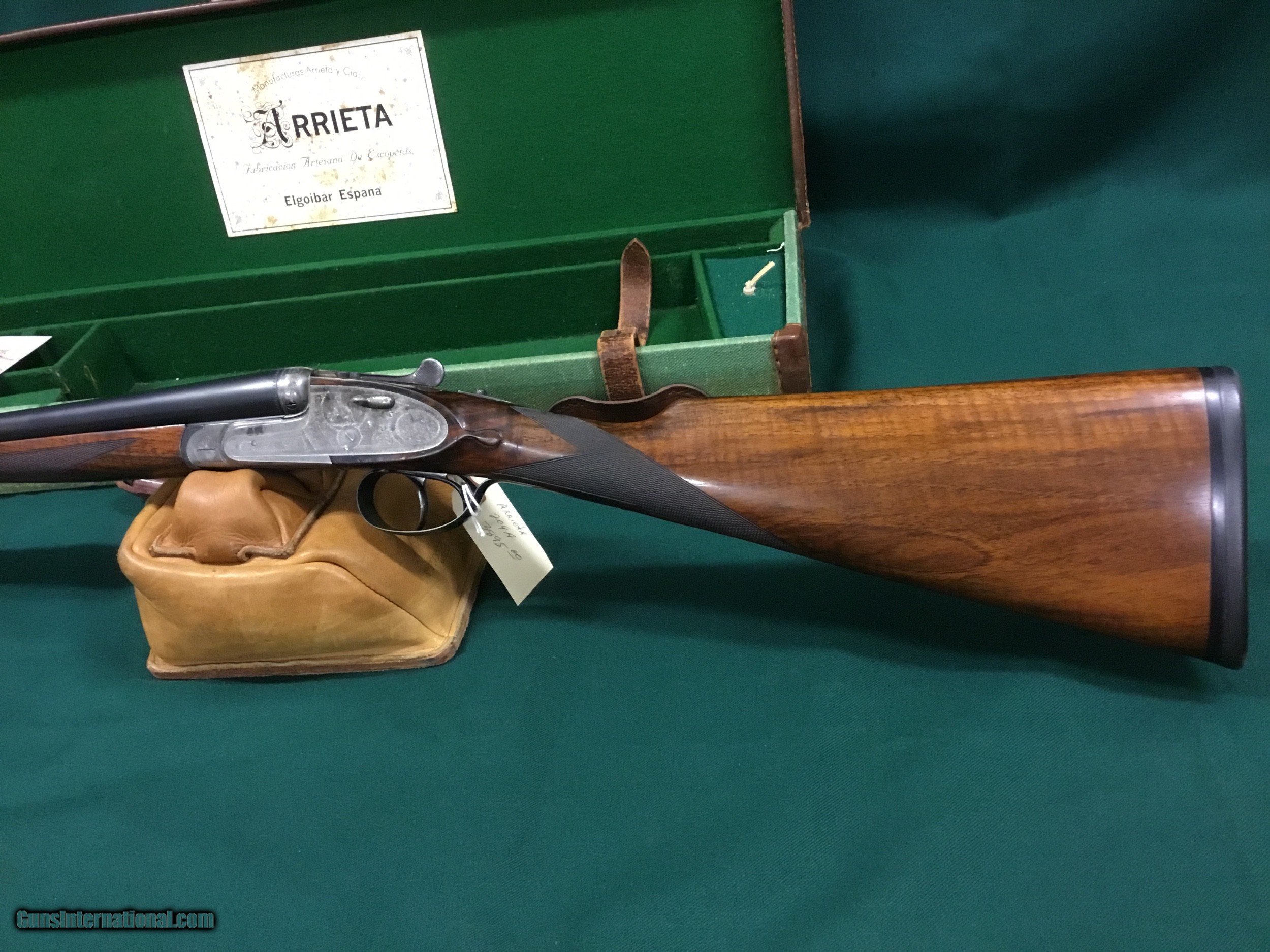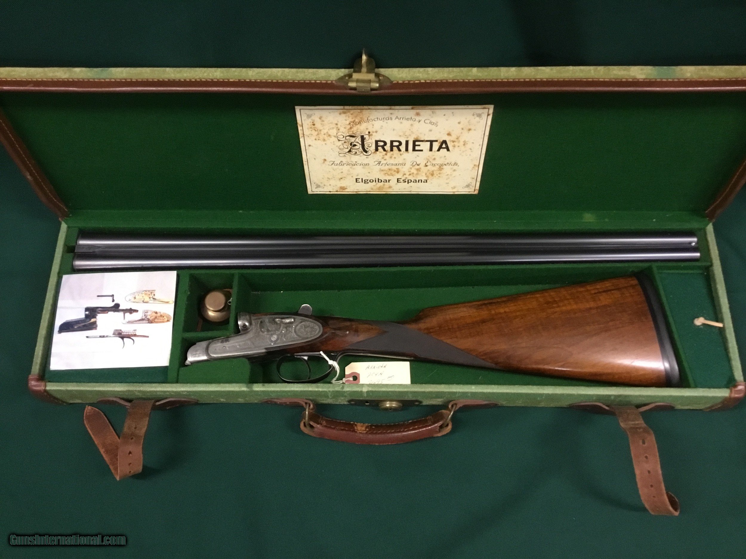 Description: Very nice older Arrieta 20 ga. Cased with accessories, this shotgun has gold plated internals,hinged front trigger,hand detachable side locks,26" barrels that has Briley thin wall tubes installed,gun weighs just shy of 6 lbs. and is cast off,LOP 14 1/2", DAH 2 1/4",DAC1 3/4", serial number is 247xx,this would make an excellent hunting piece,please call with questions,thanks Jim SOLD |