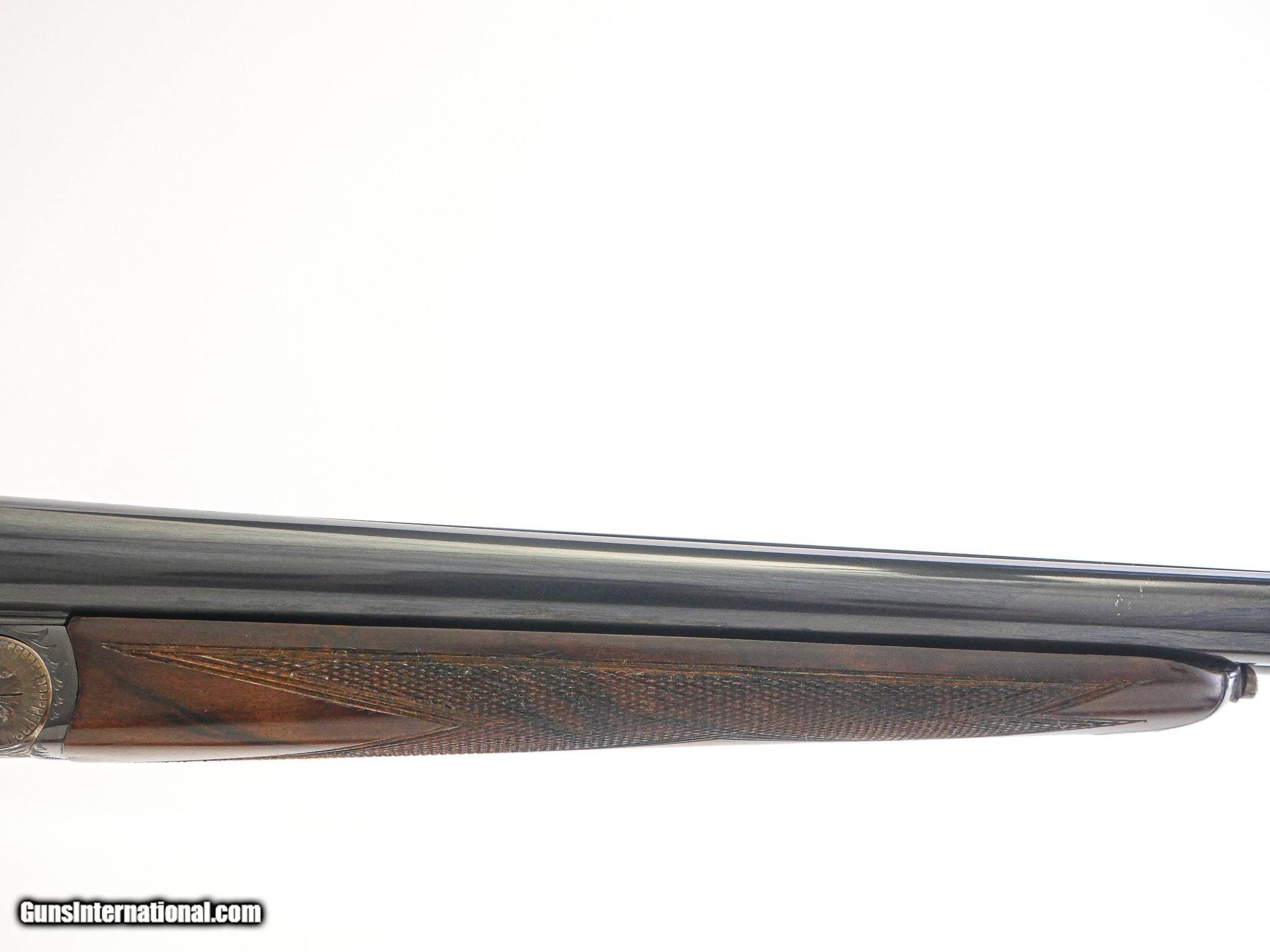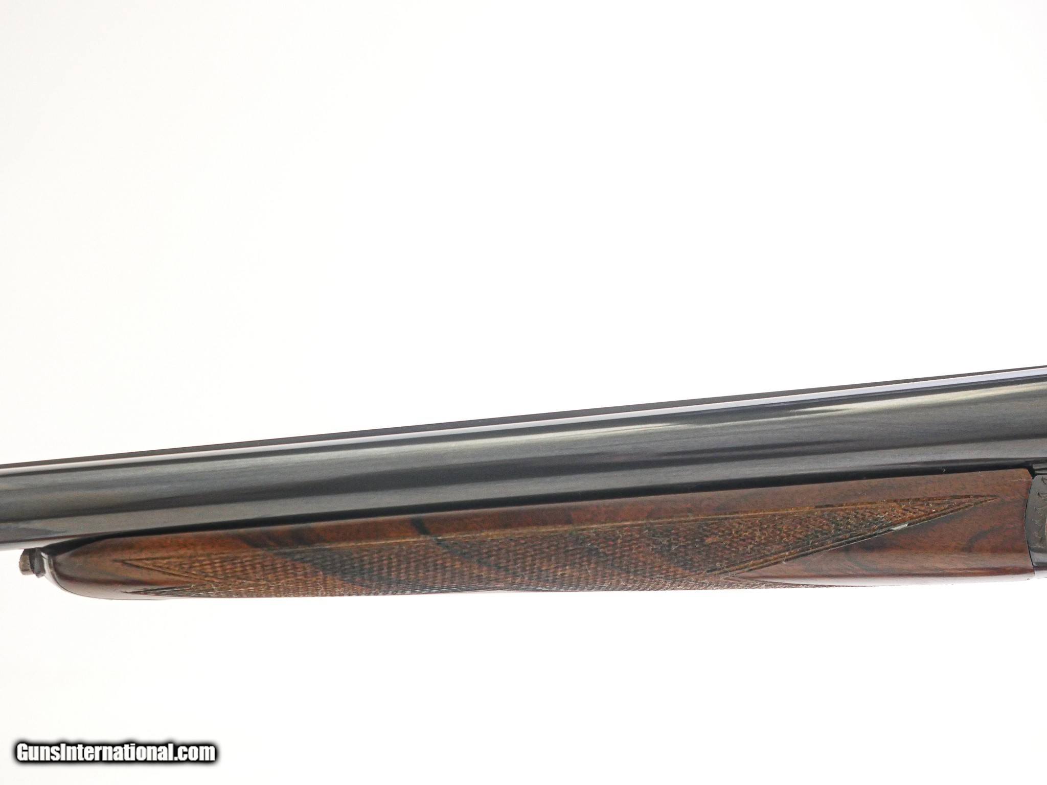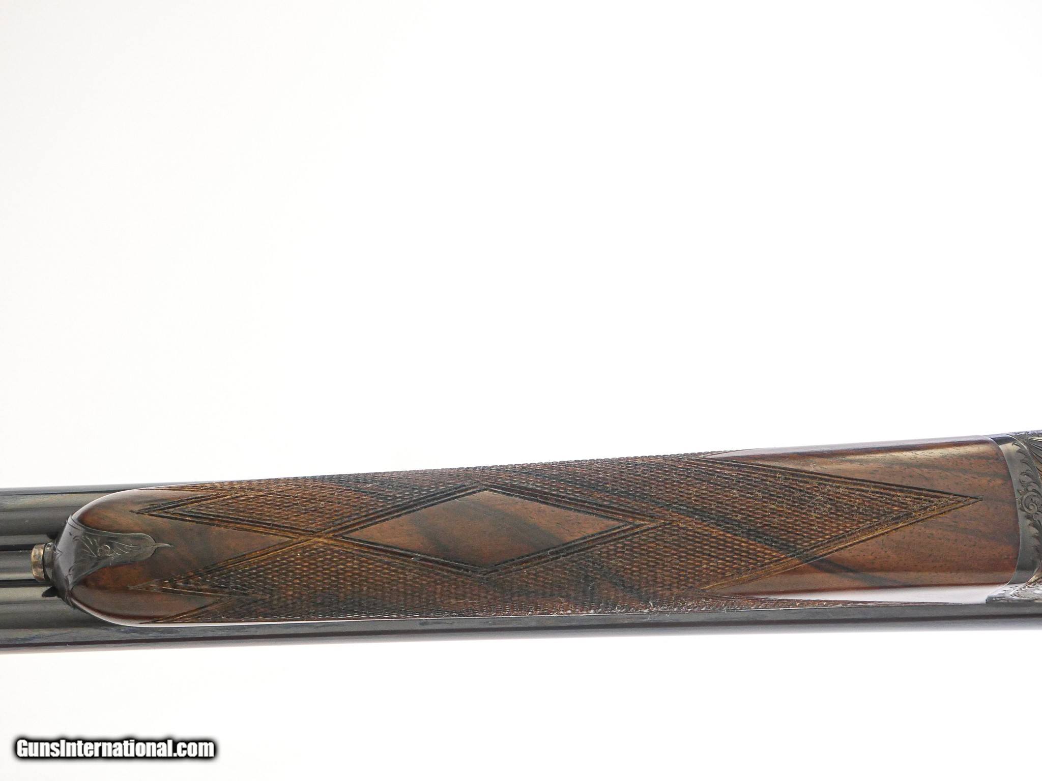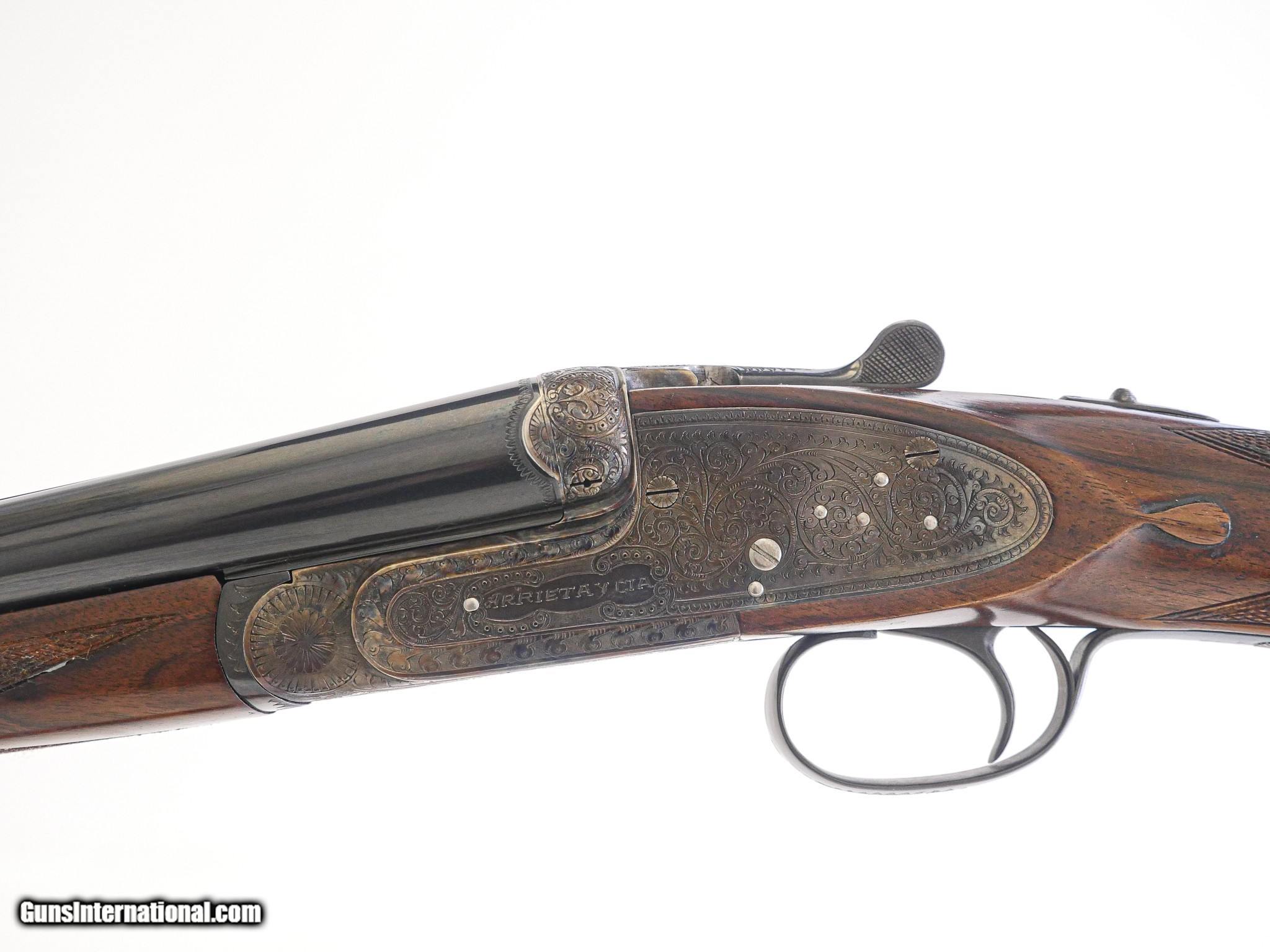 Description: Arrieta - 570, 20ga. 30” Barrels Choked IC/M. Nicely figured straight grip stock, leather covered recoil pad, gold oval, splinter forend, single trigger, sideclips, automatic ejectors, case colored receiver, full sidelock shotgun, chopper lump barrels, drop points, gun appears to have very little use, 99% condition throughout, leather cased, excellent configuration, available for immediate delivery. Inv: 50107 6 lbs. 10 oz. 14 ¾” x 1 ½” x 2 ¼” $4,250.00 SOLD |