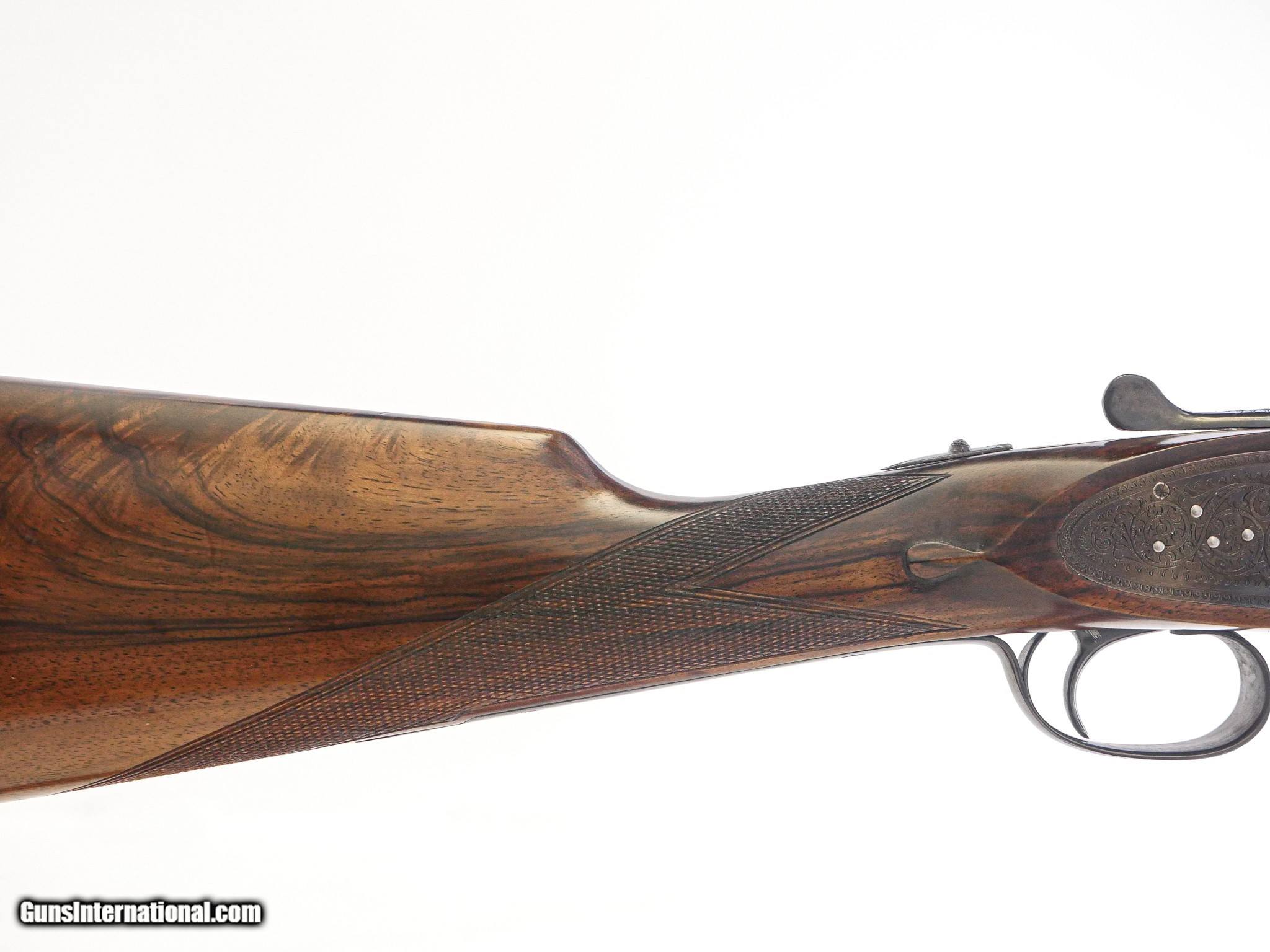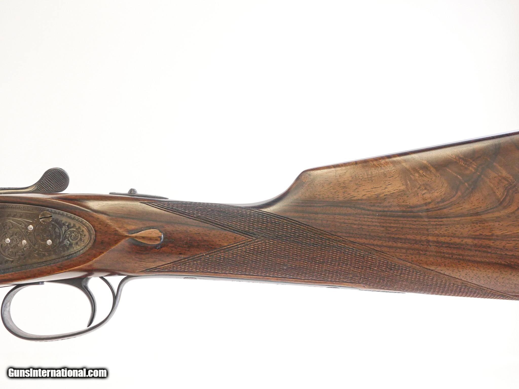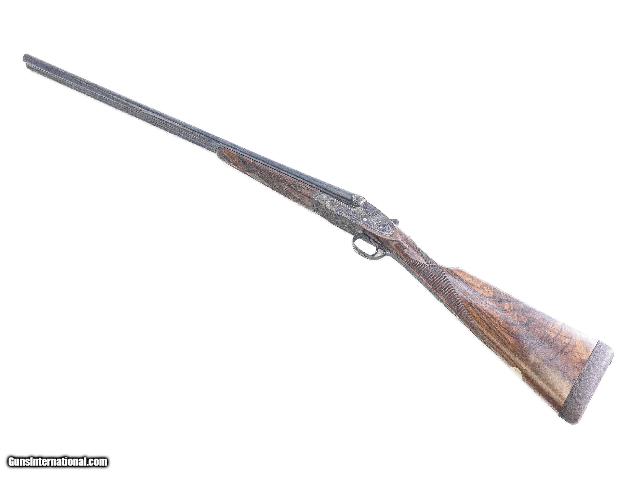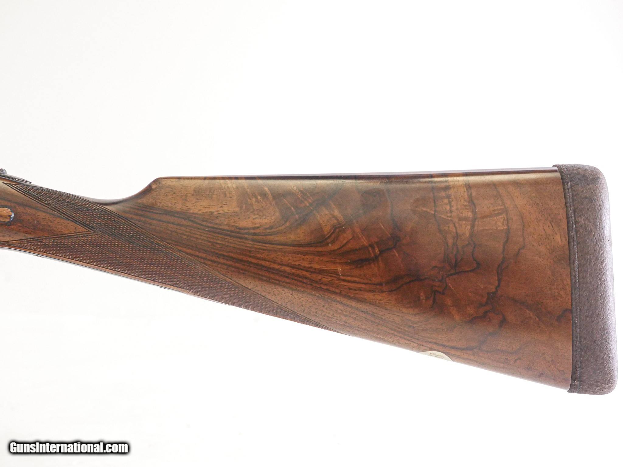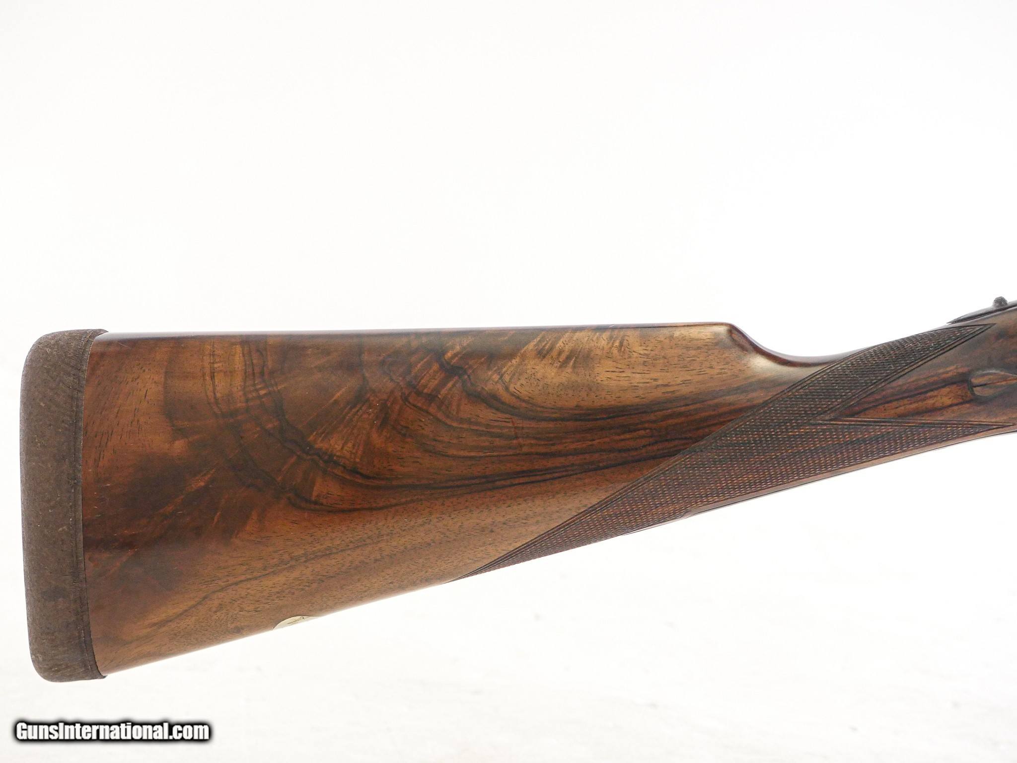 Description: Arrieta - 570, 20ga. 30” Barrels Choked IC/M. Nicely figured straight grip stock, leather covered recoil pad, gold oval, splinter forend, single trigger, sideclips, automatic ejectors, case colored receiver, full sidelock shotgun, chopper lump barrels, drop points, gun appears to have very little use, 99% condition throughout, leather cased, excellent configuration, available for immediate delivery. Inv: 50107 6 lbs. 10 oz. 14 ¾” x 1 ½” x 2 ¼” $4,250.00 SOLD |