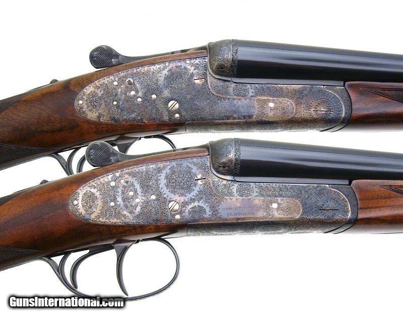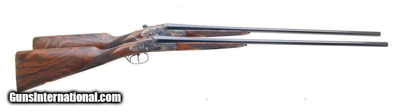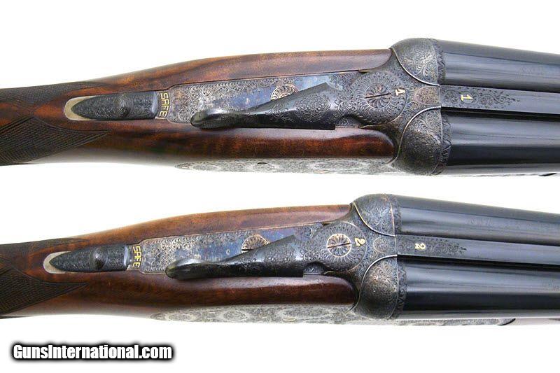 Description: Arrieta - Boss SLE Matched Pair - 28 ga - Item Number: ARR570312704 Shotgun type: SxS Action: Sidelock Ejectors: Yes Trigger: Double Grip: Straight Grip Forend: Splinter Lop: 14 3/4 " Pad thickness: " Type of butt: Checkered Wood Drop comb: 1 1/2 " Drop heel: 2 1/4 " Cast amount: 3/16 " Cast: Off Weight: 6 lbs, 6 oz Manufactured in: Spain Manufacture Year: Finish: Case Colored Overall condition: Very Good Stock condition: Very Good Metal condition: Very Good Stock: Original finish Metal: Original finish Type of Case: Maker's Leather Luggage Case Extra barrels: 0 Barrel info: Gauge: 28 ga Chamber: 2 3/4 " Length: 28 " Chokes: C/IC Rib type: Concave Comments : Heel and toe plates case colored and engraved. Boss style engraving. Gold nameplate in butt. Gold number on top lever and rib. SG-59 SOLD |