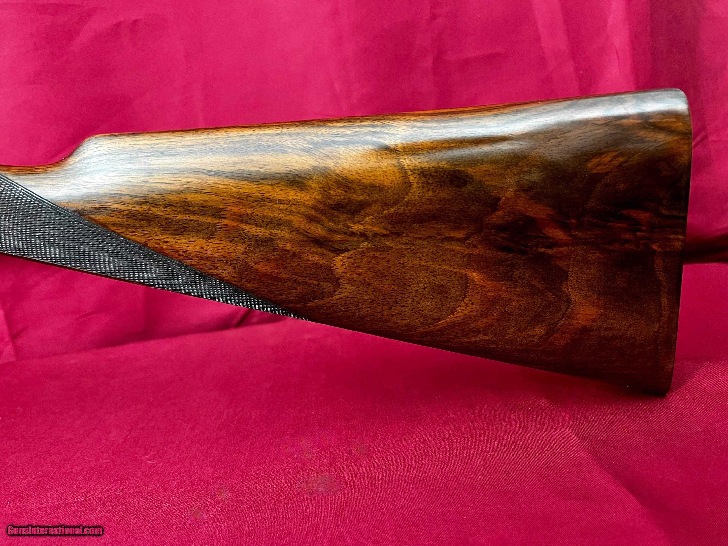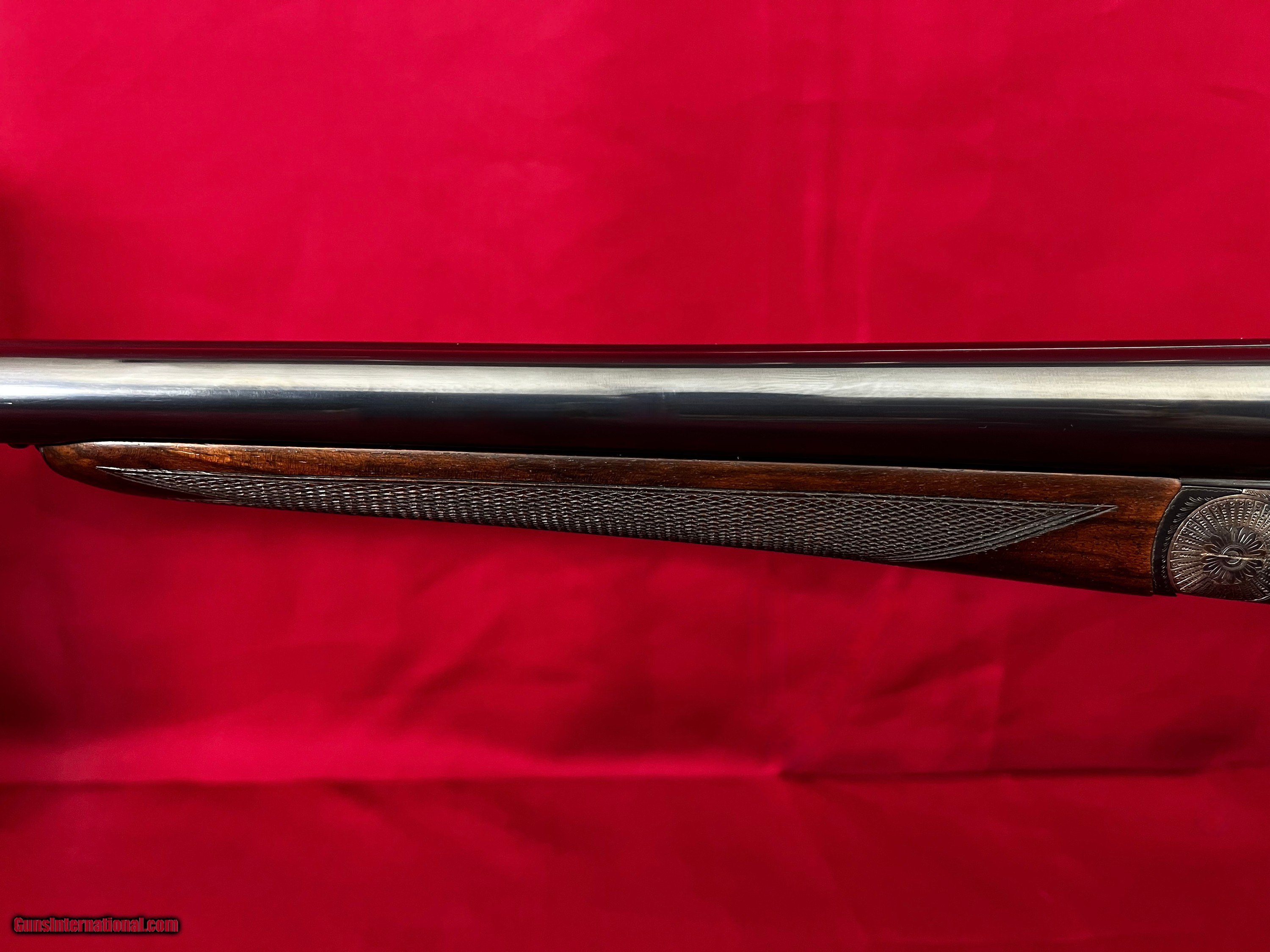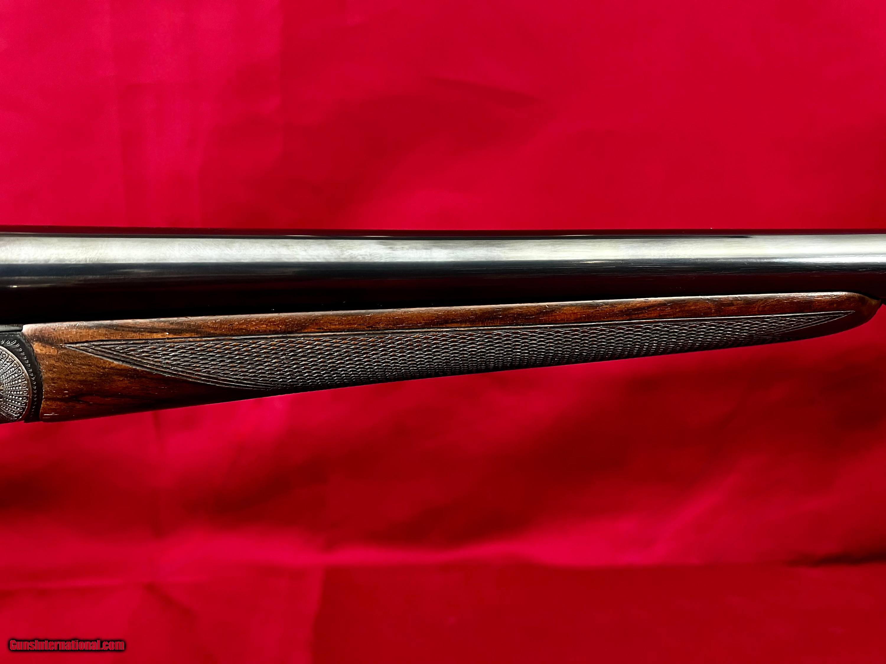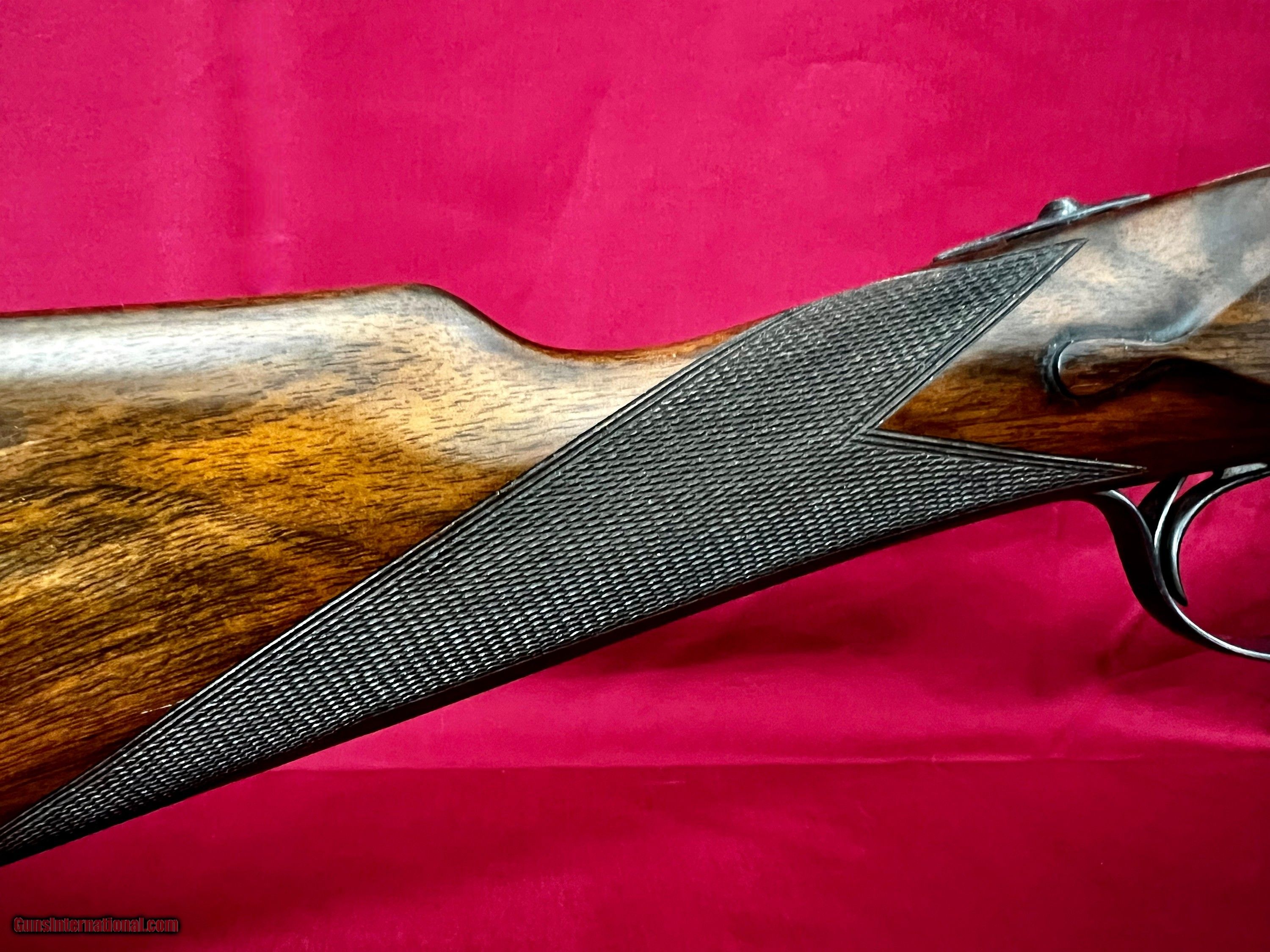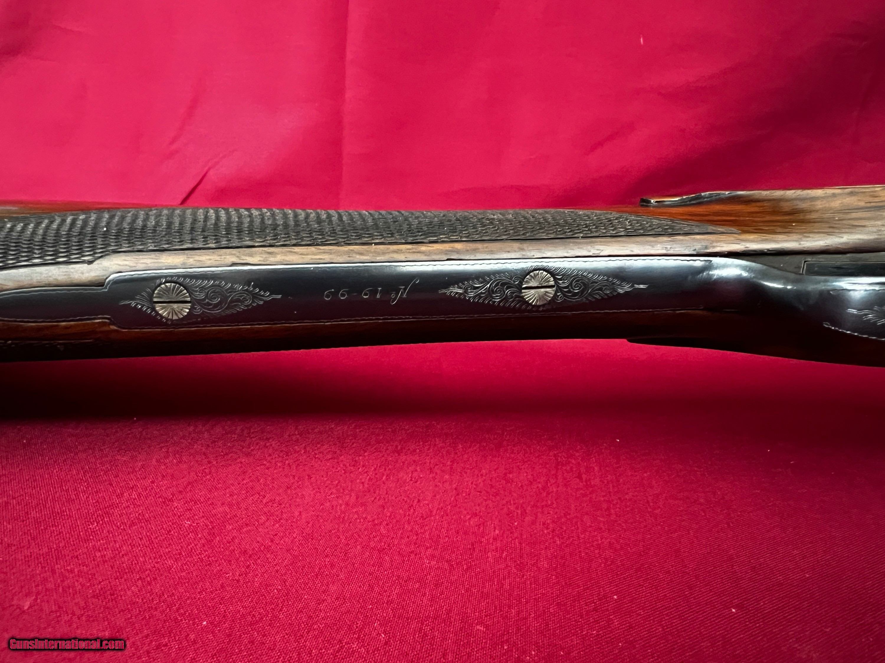 Description: I have for sale a beautiful little upland gun, set up perfectly for Grouse, Woodcock, or Quail. This little Arrieta Model 578 in 20 gauge was built with the bird hunter in mind. Having 28 inch barrels providing a smooth swing and chokes of .004 skeet, and .007 improved cylinder it is to my mind the perfect upland gun. This lovely gun has wonderful hand cut engraving, hand detachable sidelocks, rolled trigger guard, bushed firing pins, articulated front trigger, selective ejectors, and perfect balance just in front of the hinge pin. The stock dimensions are 1 5/8 X 2 3/8 X 14 3/4 over a checkered butt. Cast is just about neutral so either a right of left hand shooter can easily handle this gun. The stock has very nice grain pattern and only a very few light marks. As you can tell by looking at the breech face, seeing the condition of the stock, and seeing the top lever so far to the right you can tell this gun hasn't been fired more than a few times. No screw has been turned on this little gun, it is just as it left the factory. Price of this little Grouse killing machine is $4700 plus $50 shipping to your FFL. As always there is a three day non-firing inspection period with the buyer paying shipping charges if returned. Feel free to call me to discuss this gun. SOLD Shotgun Gauge: 20 Gauge Manufacturer: Arrieta Model: 578 Serial Number: 57-03-19-99 Barrel Length: 28 Chambers: 2 3/4SXS Ejectors: Selective Well Timed Condition: excellent Metal Condition: excellent Wood Condition: excellent Bore Condition: excellent Barrels: SXS Action: Sidelock Triggers: Double front articulated Stock: Straight English Stock Comb: 1 5/8 Stock Heel: 2 3/8 Stock Cast: Neutral Fore End: Splinter Butt Pad: Checkered LOP: 14 3/4 Finish: Hand Rubbed Oil Weight: 6 pounds 0 ounces Chokes: SK & IC Choke Left: Improved Cylinder Choke Right: Skeet Engraving: Hand Cut Rose and Scroll |