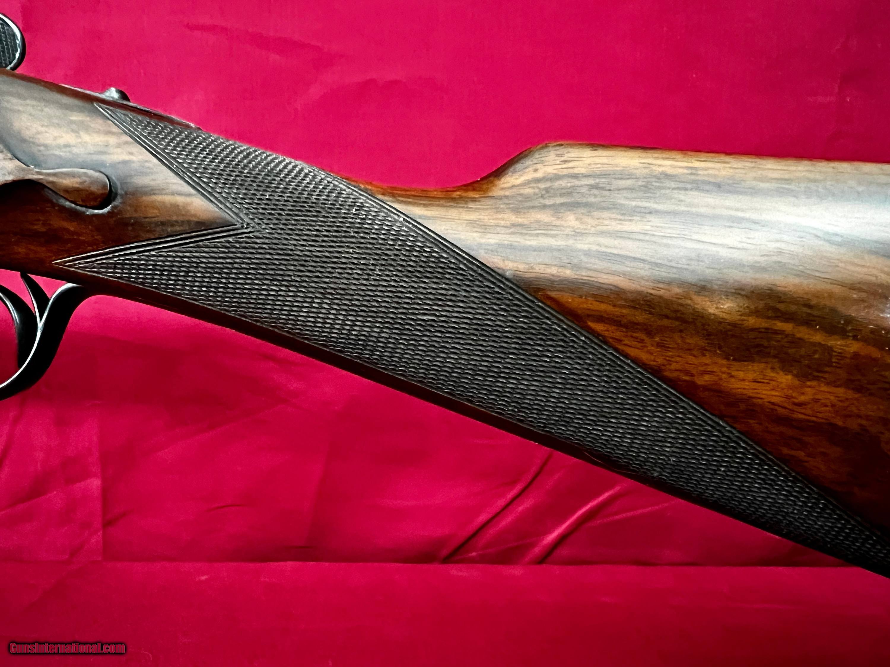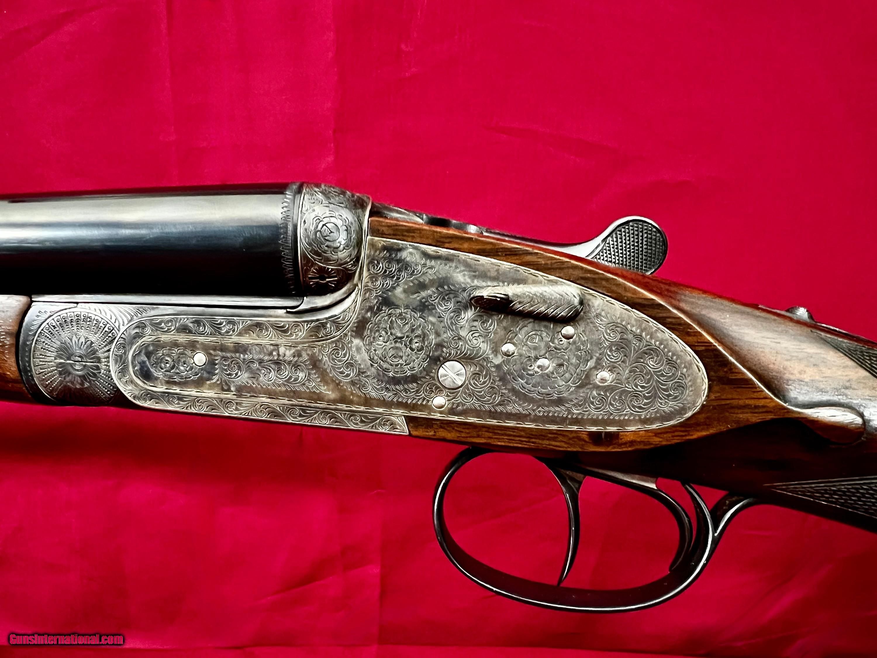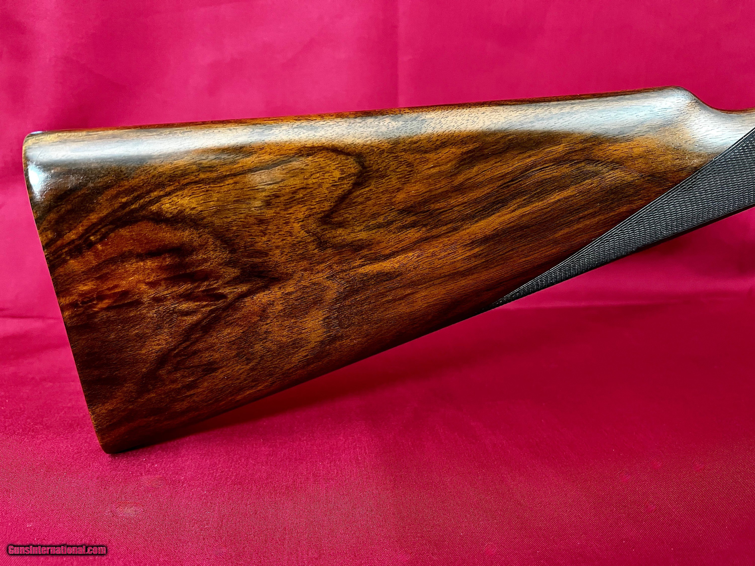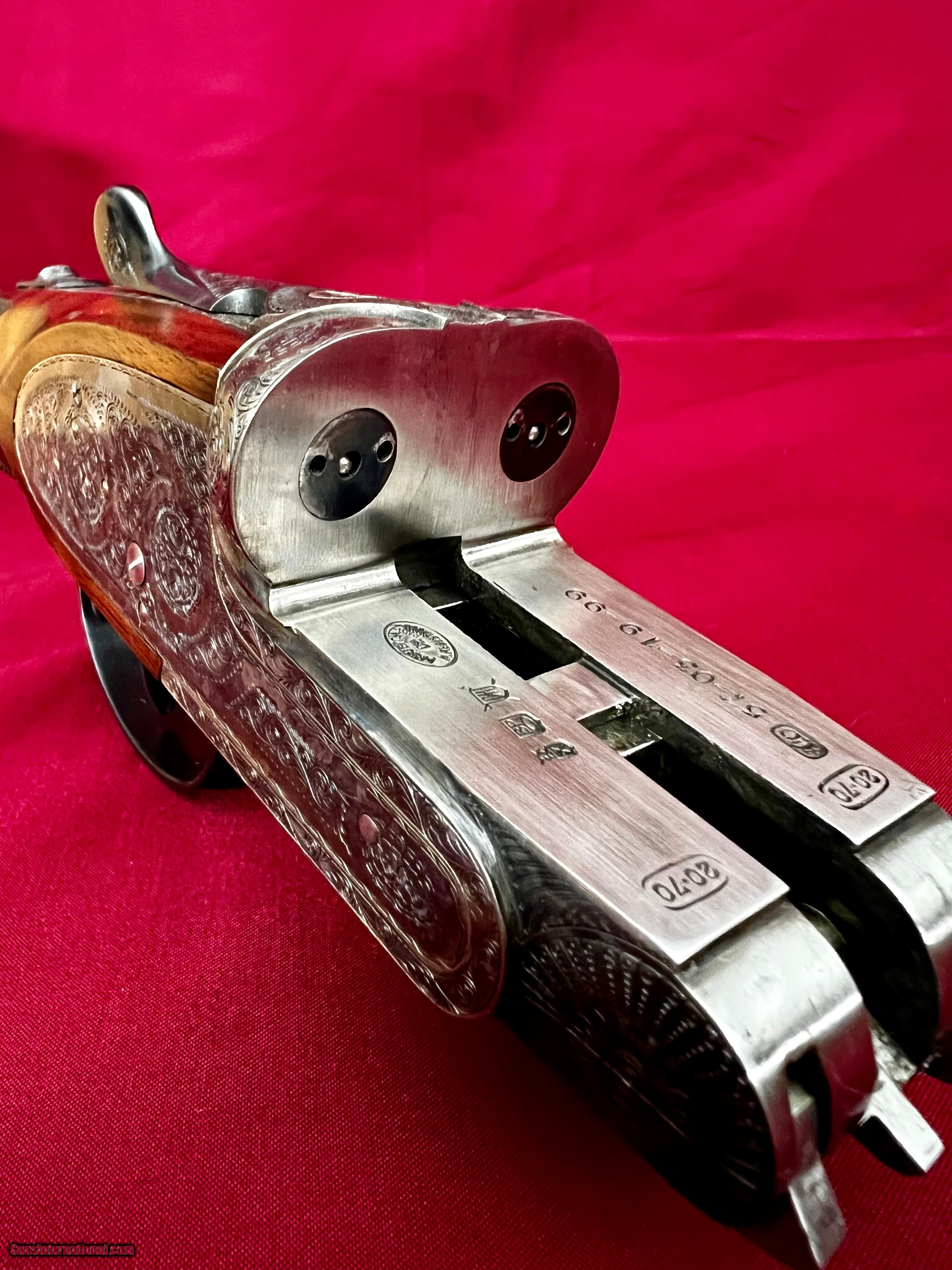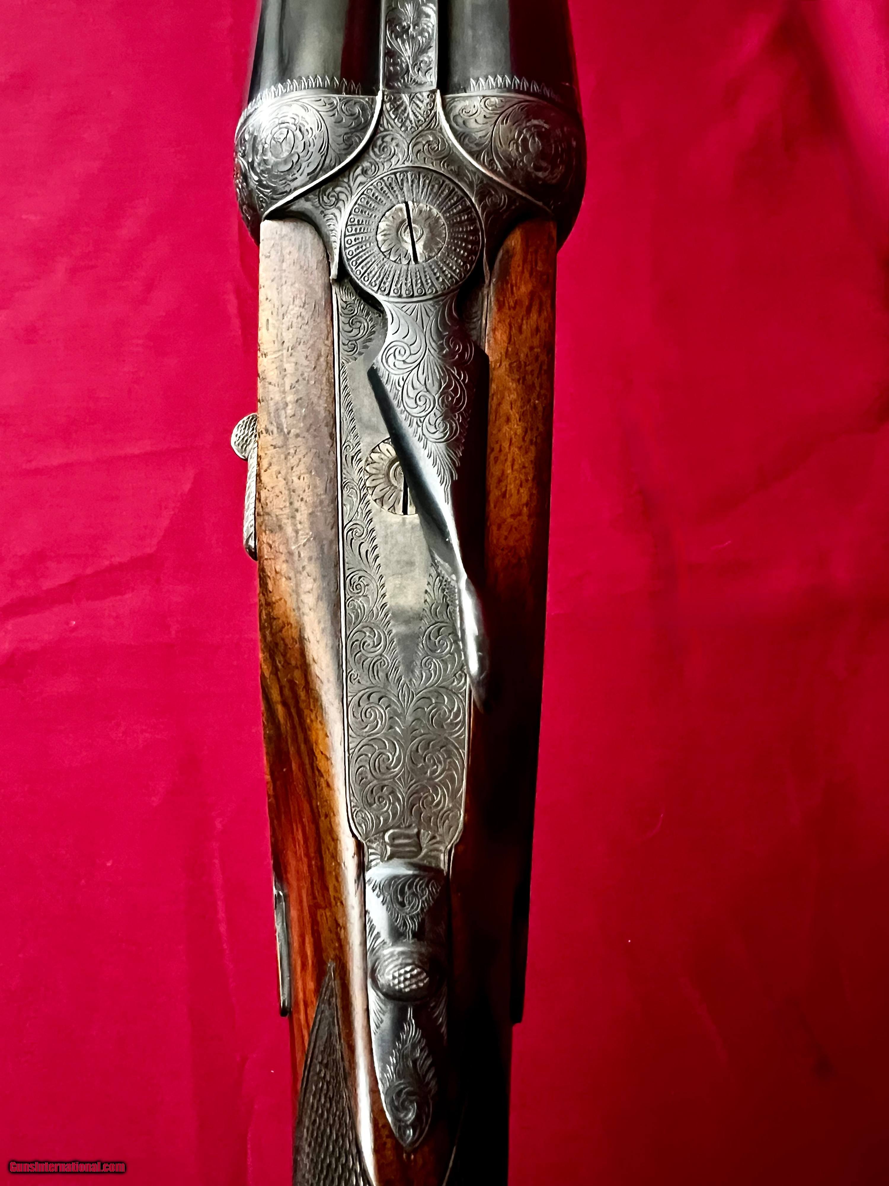 Description: I have for sale a beautiful little upland gun, set up perfectly for Grouse, Woodcock, or Quail. This little Arrieta Model 578 in 20 gauge was built with the bird hunter in mind. Having 28 inch barrels providing a smooth swing and chokes of .004 skeet, and .007 improved cylinder it is to my mind the perfect upland gun. This lovely gun has wonderful hand cut engraving, hand detachable sidelocks, rolled trigger guard, bushed firing pins, articulated front trigger, selective ejectors, and perfect balance just in front of the hinge pin. The stock dimensions are 1 5/8 X 2 3/8 X 14 3/4 over a checkered butt. Cast is just about neutral so either a right of left hand shooter can easily handle this gun. The stock has very nice grain pattern and only a very few light marks. As you can tell by looking at the breech face, seeing the condition of the stock, and seeing the top lever so far to the right you can tell this gun hasn't been fired more than a few times. No screw has been turned on this little gun, it is just as it left the factory. Price of this little Grouse killing machine is $4700 plus $50 shipping to your FFL. As always there is a three day non-firing inspection period with the buyer paying shipping charges if returned. Feel free to call me to discuss this gun. SOLD Shotgun Gauge: 20 Gauge Manufacturer: Arrieta Model: 578 Serial Number: 57-03-19-99 Barrel Length: 28 Chambers: 2 3/4SXS Ejectors: Selective Well Timed Condition: excellent Metal Condition: excellent Wood Condition: excellent Bore Condition: excellent Barrels: SXS Action: Sidelock Triggers: Double front articulated Stock: Straight English Stock Comb: 1 5/8 Stock Heel: 2 3/8 Stock Cast: Neutral Fore End: Splinter Butt Pad: Checkered LOP: 14 3/4 Finish: Hand Rubbed Oil Weight: 6 pounds 0 ounces Chokes: SK & IC Choke Left: Improved Cylinder Choke Right: Skeet Engraving: Hand Cut Rose and Scroll |
