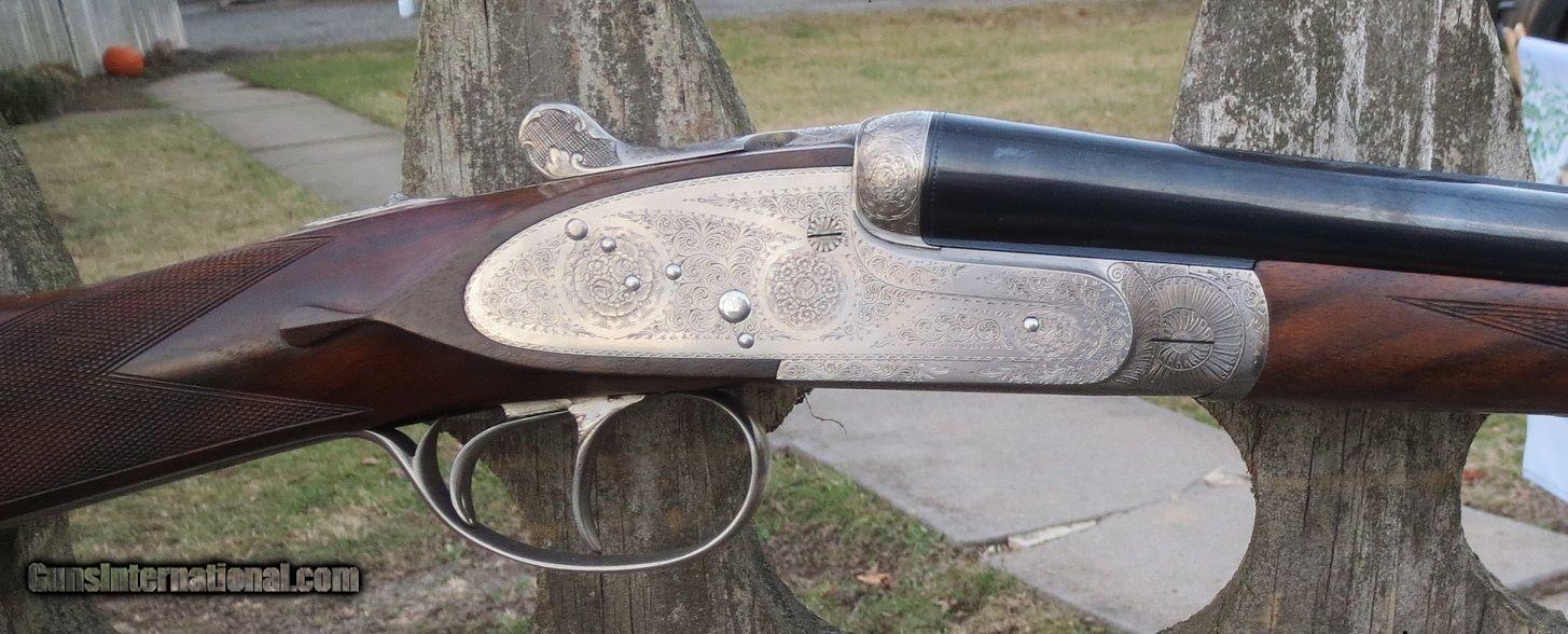 Description: ARRIETA - SIDELOCK EJECTOR - 28 GA. – 26” CHOPPER LUMP BLS. IC/MOD. – CHURCHILL RIB – COIN FINISH RECEIVER W ITH ROSE & SCROLL ENGRAVING - BUSHED STRIKERS - HOLLAND STYLE ASSISTED OPENING – DOUBLE TRIGGERS WITH FRONT HINGED – ROLLED EDGE TRIGGER GUARD – SPLINTER FOREND & STRAIGHT STOCK 1 ½” x 2 ¾” x 15” – CHECKERED BUTT – VERY FINE CHECKERING – GOLD INITIALS “WIS” INLAYED IN TOE LINE. WT. 5 LBS. 12 OZS. - GUN IS IN LIKE NEW CONDITION. $6,600. SOLD |