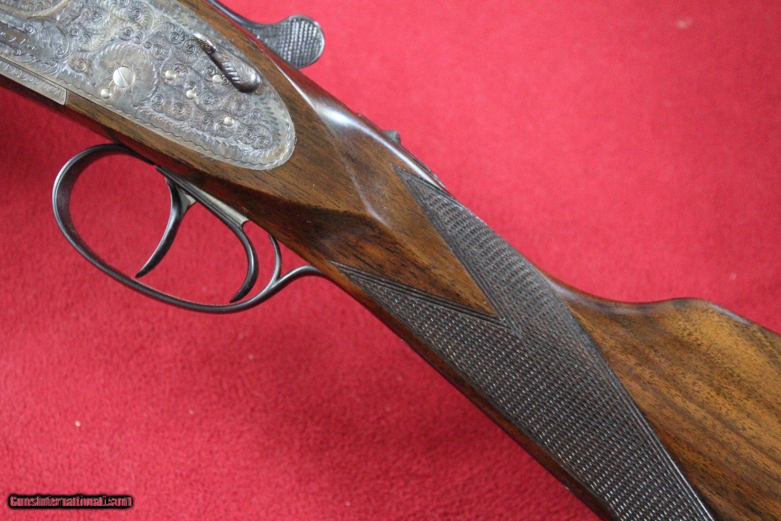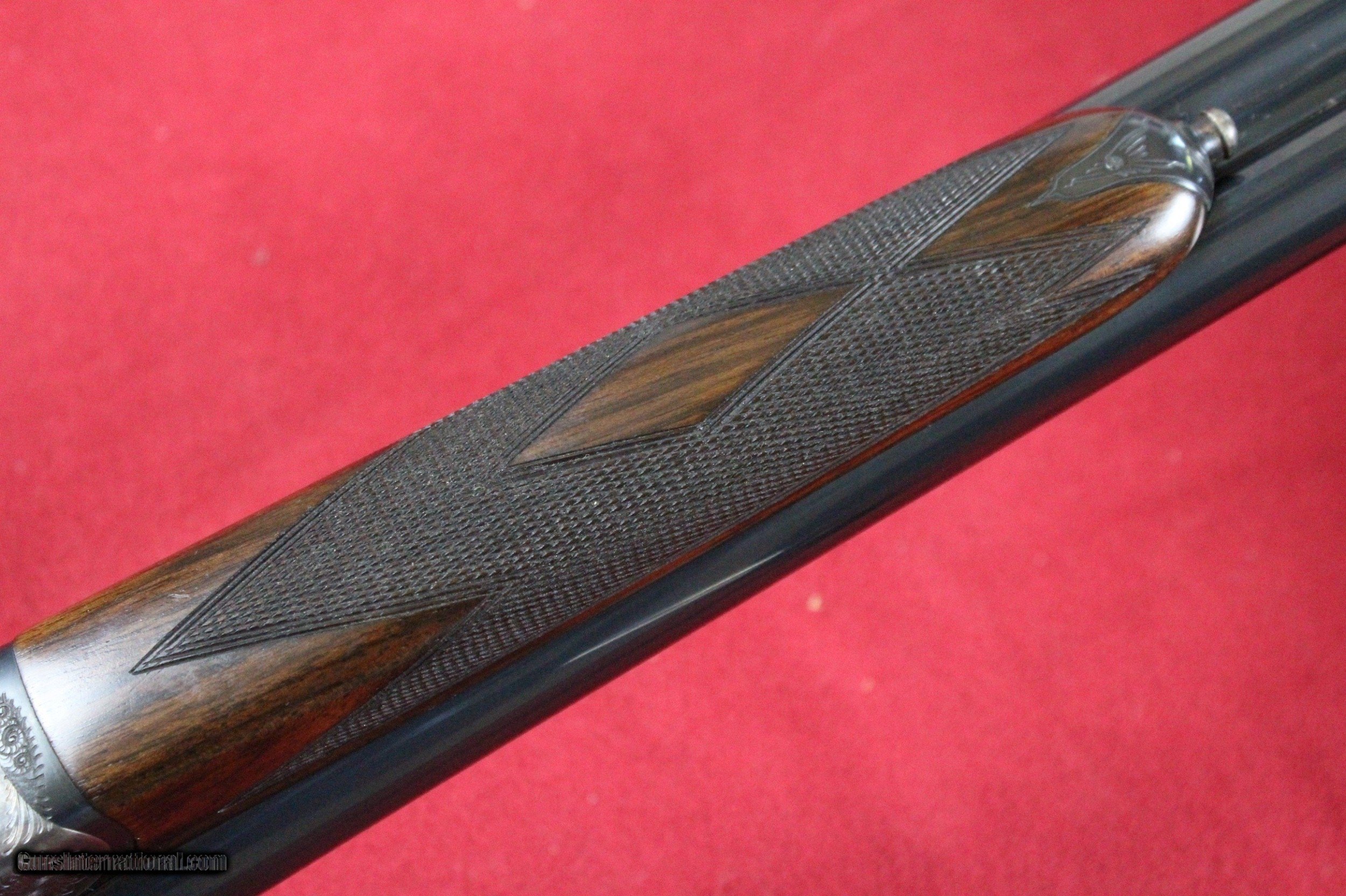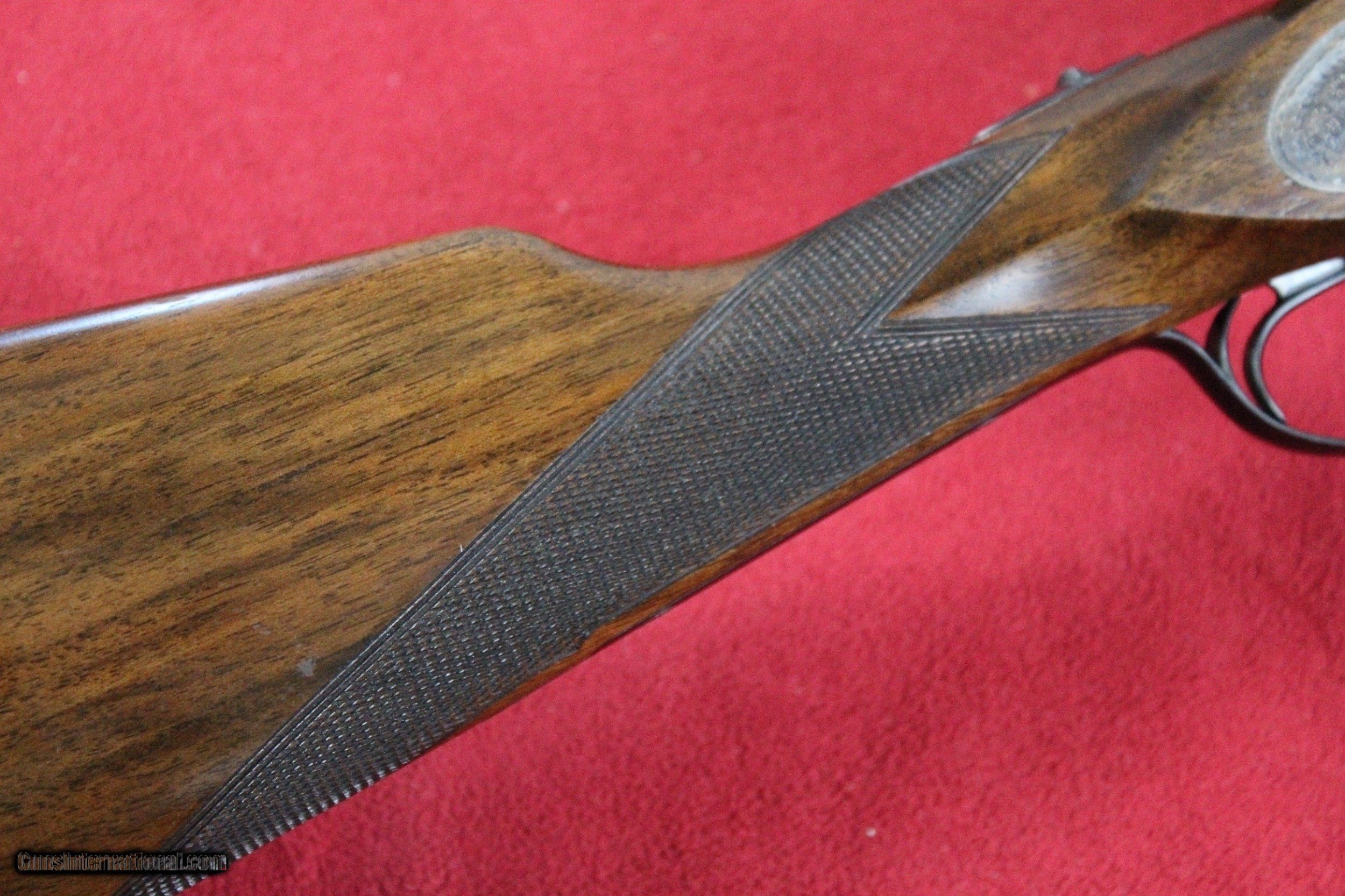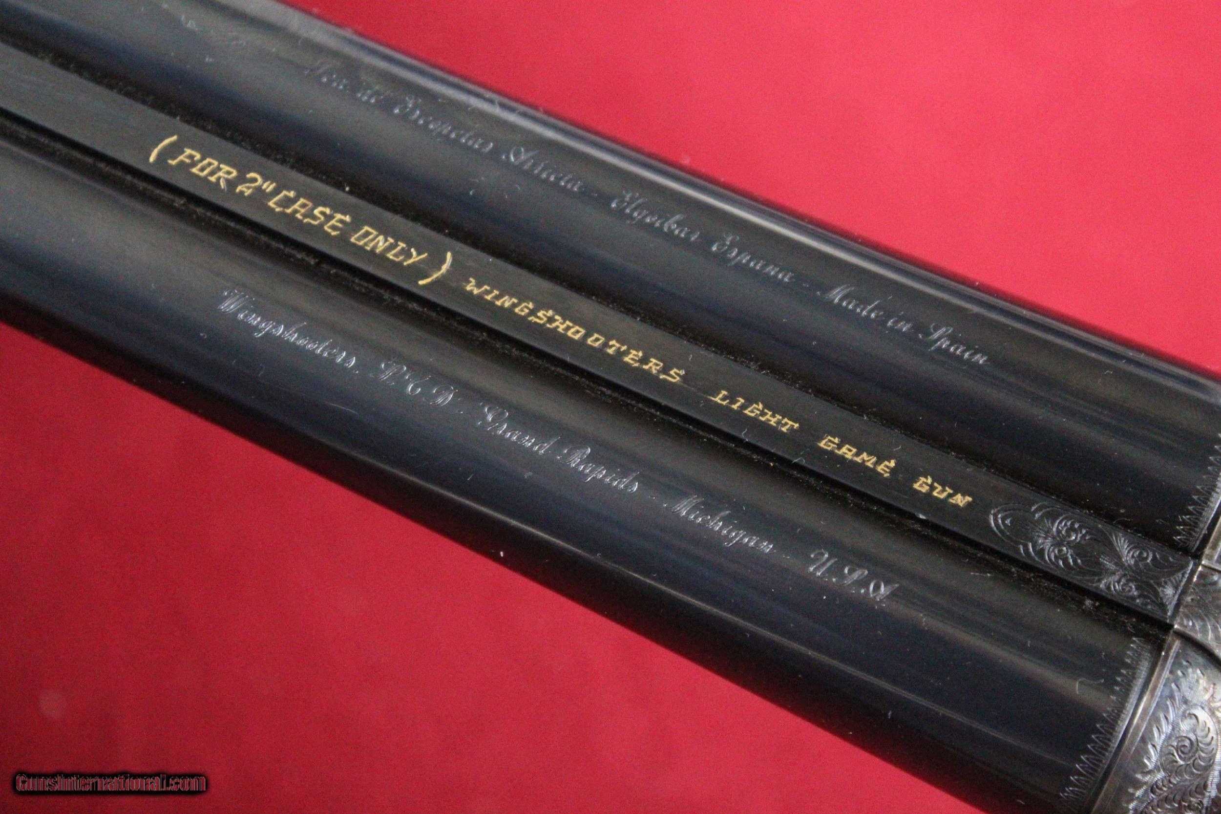 Description: Arrieta 2in Game Gun marked in gold (For 2 in Cases Only) on center rib left barrel marked Wingshooters LTD Grand Rapids MI. 27 in barrels choked cylinder in right and IC in left. Double triggers front articulated; AE; Auto safety; Straight grip stock, LOP 14 & 3/4 in to black checkered butt plate, DAC 1 & 1/2 in; DAH 2 & 1/8 in; cast off 1/8 in. Hand detachable locks; splinter foreend ; weight 5lb 13 oz; condition is fine. Stock and forend excellent with light handling marks. Gun used very little; locks up tight with lever to right of center. Bore are bright and shine like new. Great game gun for grouse woodcock or quail SOLD Manufacturer: Arrietta Bore: 12 Chambers: 2 inch Ejectors: Auto Condition: Fine Metal Condition: Excellent Wood Condition: Excellent Bore Condition: Excellent Barrels: Excellent Barrel Type: Double Triggers: Double Gauge Info: 12 Stock: Excellent Stock Dimensions: 14 & 3/4 inches Stock Comb: 1 & 1/2 Stock Heel: 2 & 1/8 Stock Cast: Off 1/8 Fore End: Splinter Butt Pad: Black checkered LOP: 14 & 3/4 inch Rib: Game Weight: 5 lbs 13 oz Choke Left: IC Choke Right: Cyl Engraving: Yes |
