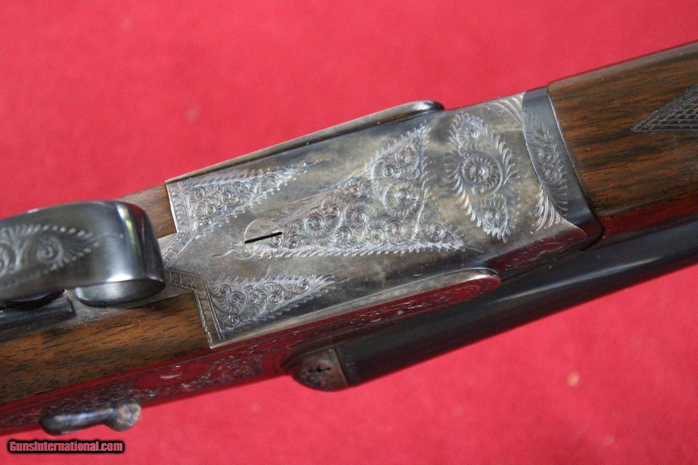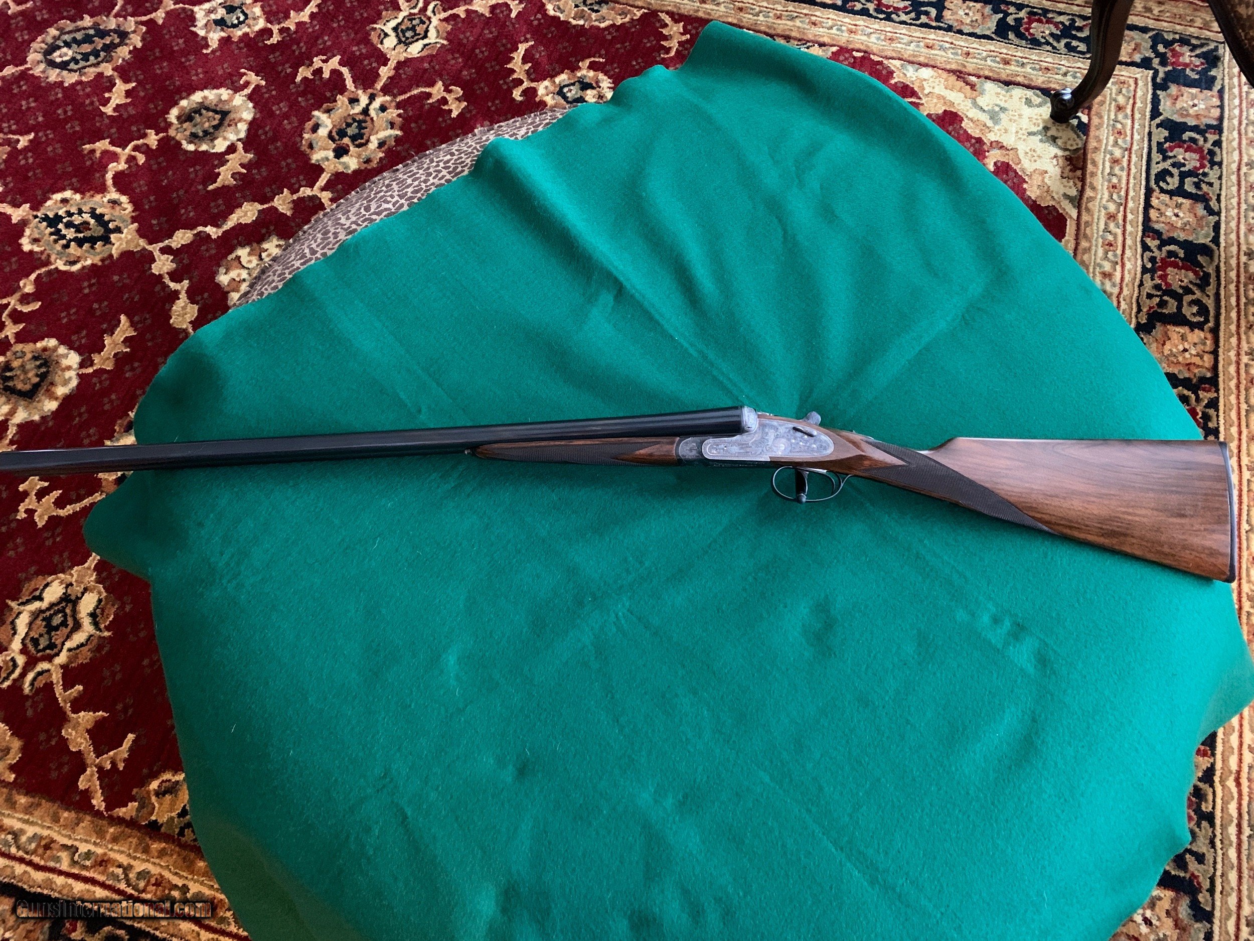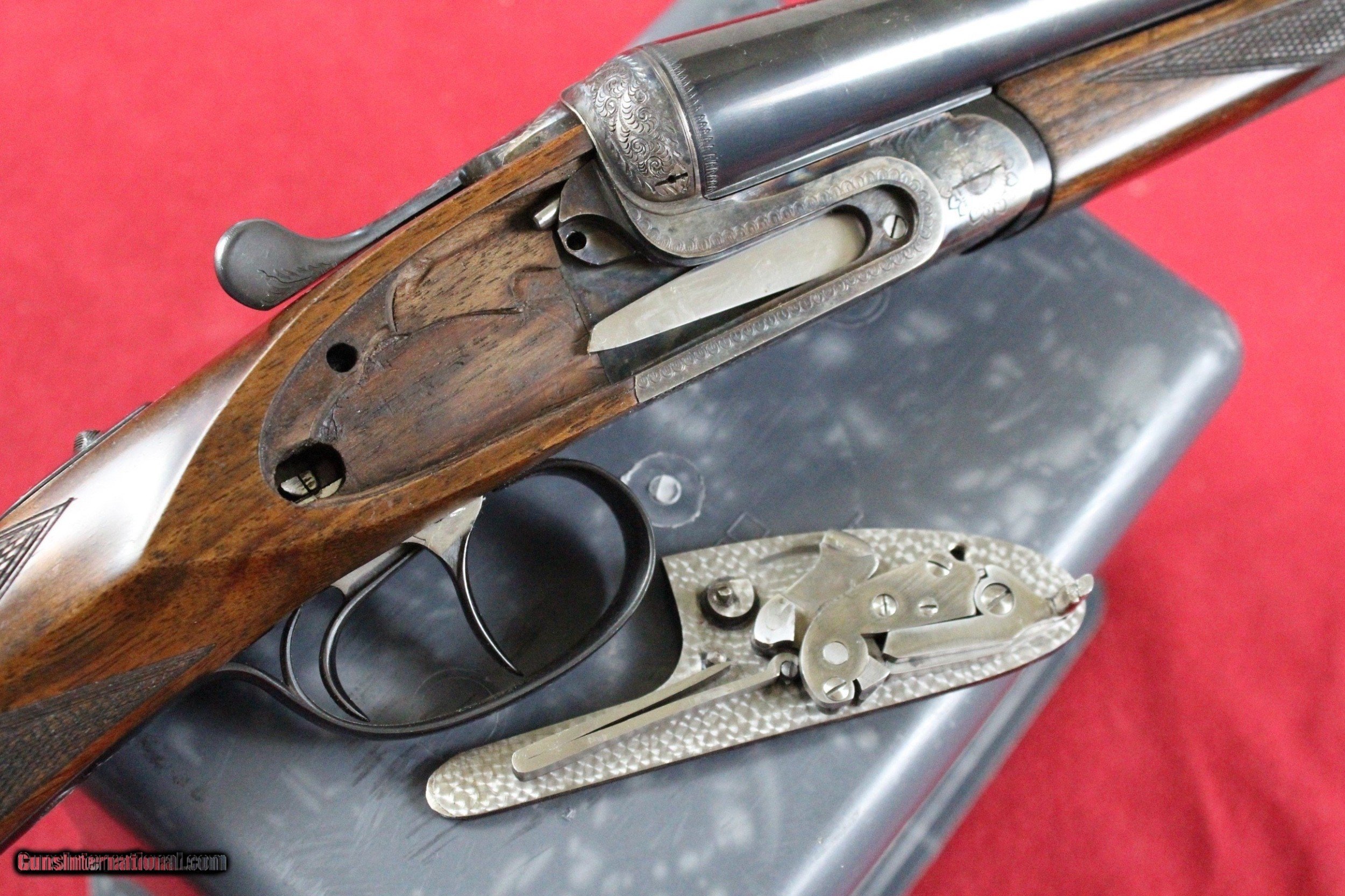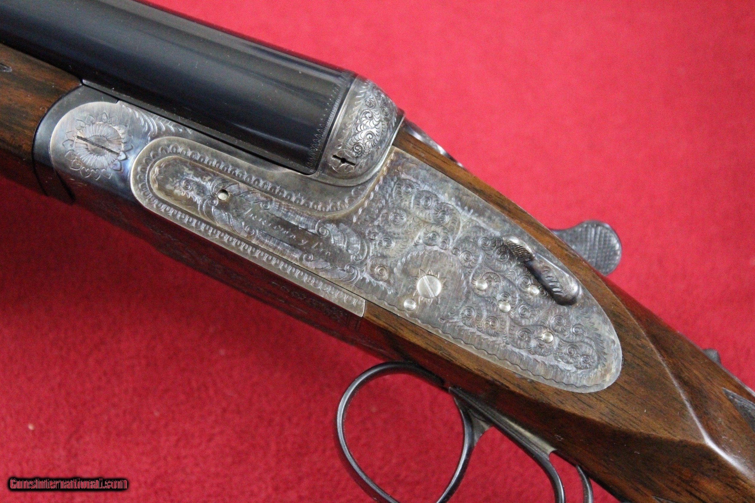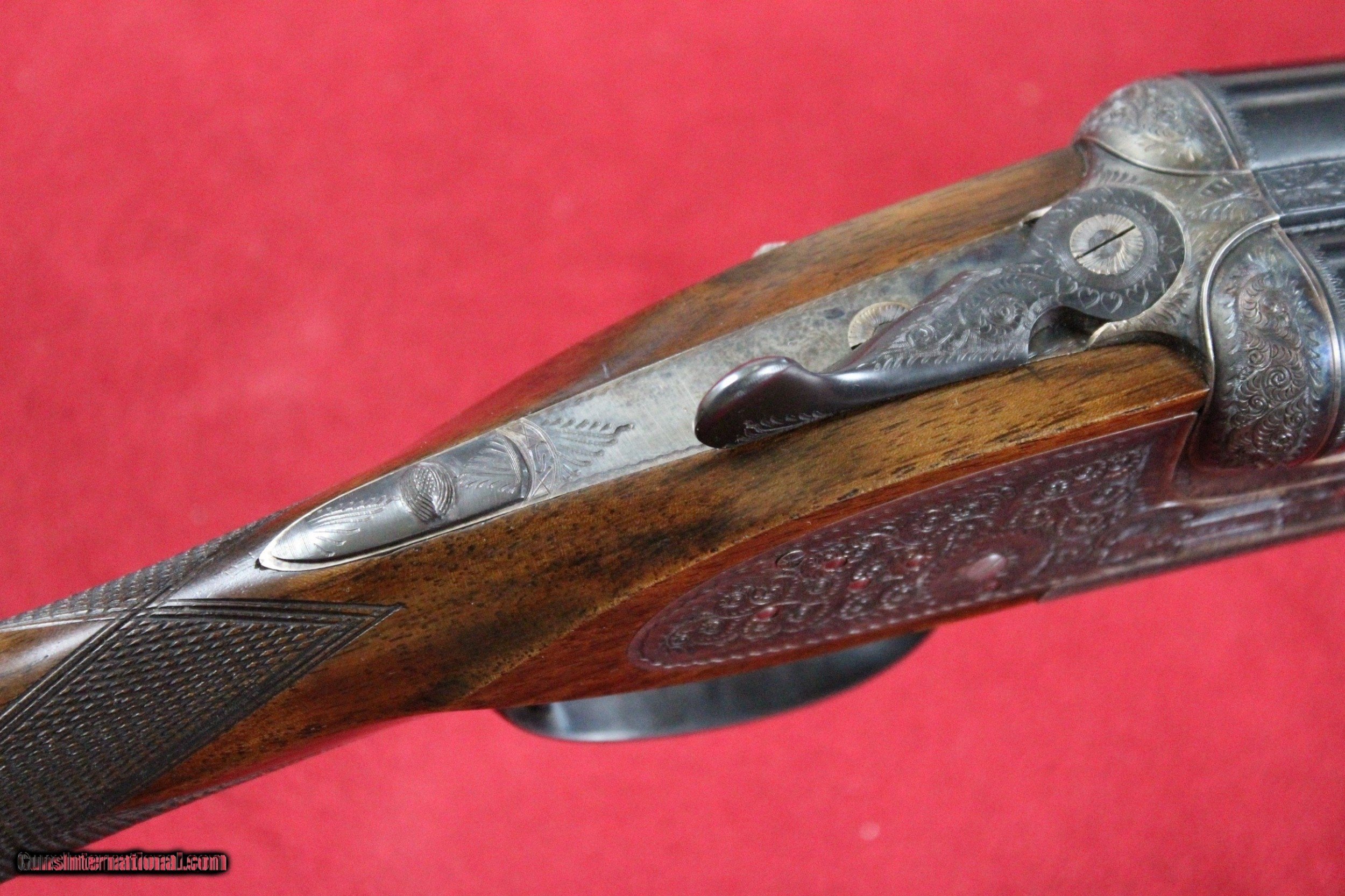 Description: Arrieta 2in Game Gun marked in gold (For 2 in Cases Only) on center rib left barrel marked Wingshooters LTD Grand Rapids MI. 27 in barrels choked cylinder in right and IC in left. Double triggers front articulated; AE; Auto safety; Straight grip stock, LOP 14 & 3/4 in to black checkered butt plate, DAC 1 & 1/2 in; DAH 2 & 1/8 in; cast off 1/8 in. Hand detachable locks; splinter foreend ; weight 5lb 13 oz; condition is fine. Stock and forend excellent with light handling marks. Gun used very little; locks up tight with lever to right of center. Bore are bright and shine like new. Great game gun for grouse woodcock or quail SOLD Manufacturer: Arrietta Bore: 12 Chambers: 2 inch Ejectors: Auto Condition: Fine Metal Condition: Excellent Wood Condition: Excellent Bore Condition: Excellent Barrels: Excellent Barrel Type: Double Triggers: Double Gauge Info: 12 Stock: Excellent Stock Dimensions: 14 & 3/4 inches Stock Comb: 1 & 1/2 Stock Heel: 2 & 1/8 Stock Cast: Off 1/8 Fore End: Splinter Butt Pad: Black checkered LOP: 14 & 3/4 inch Rib: Game Weight: 5 lbs 13 oz Choke Left: IC Choke Right: Cyl Engraving: Yes |