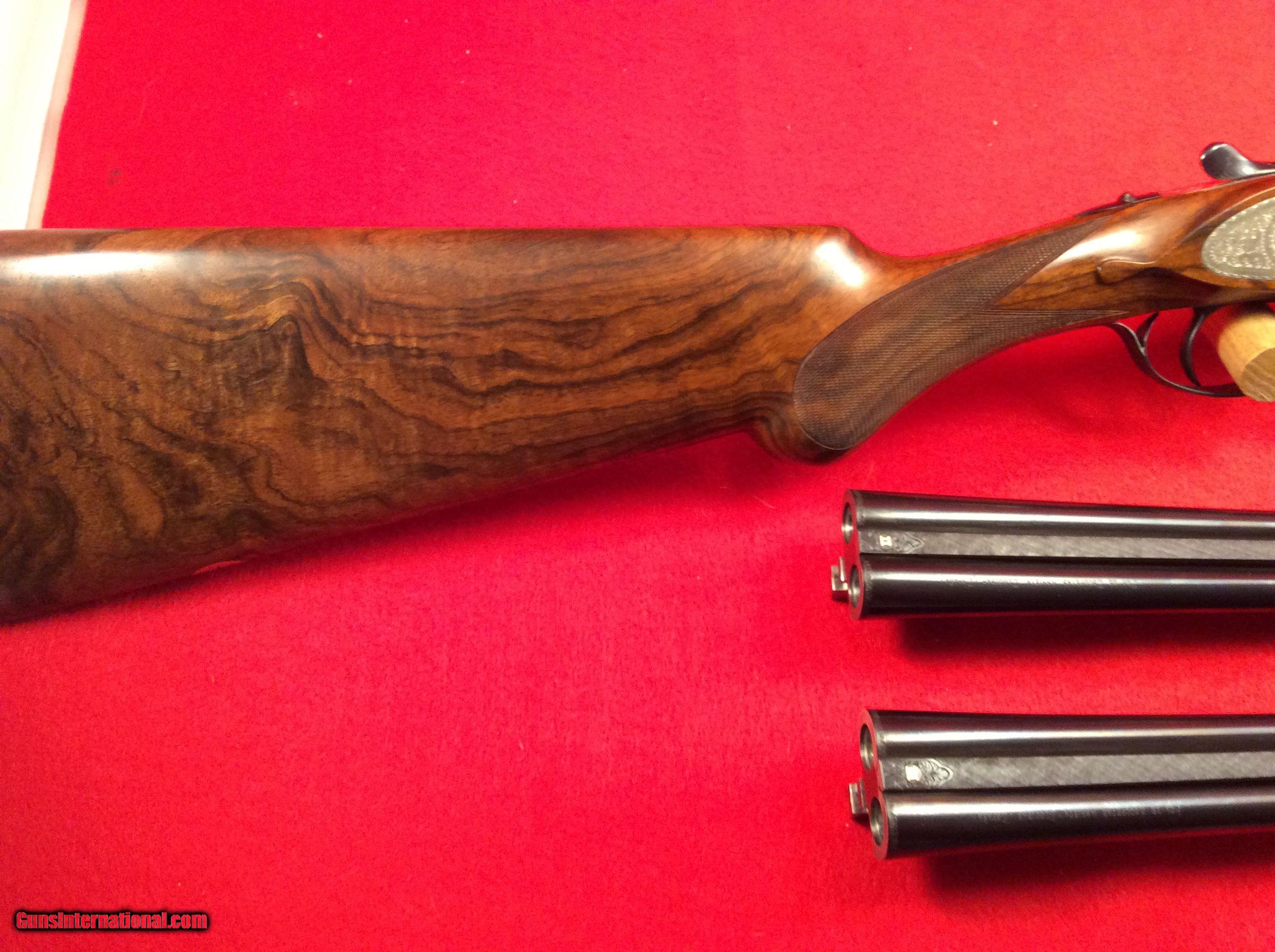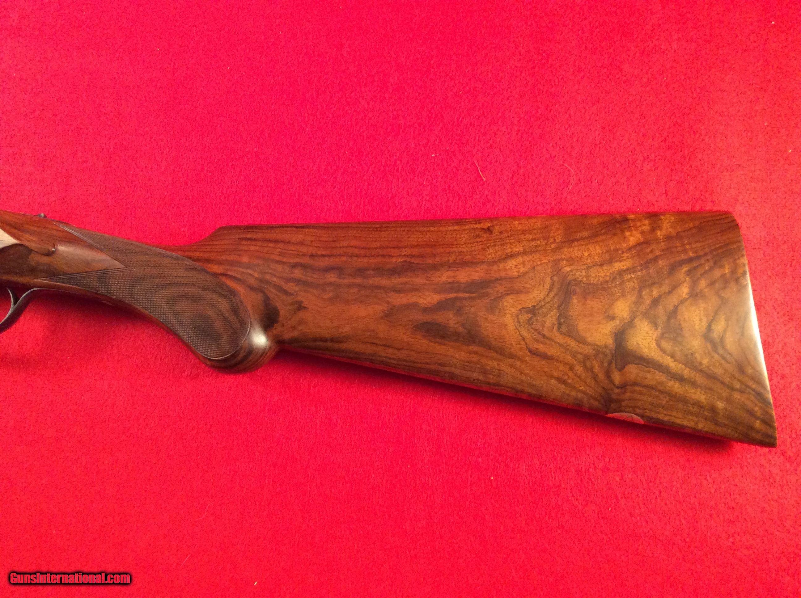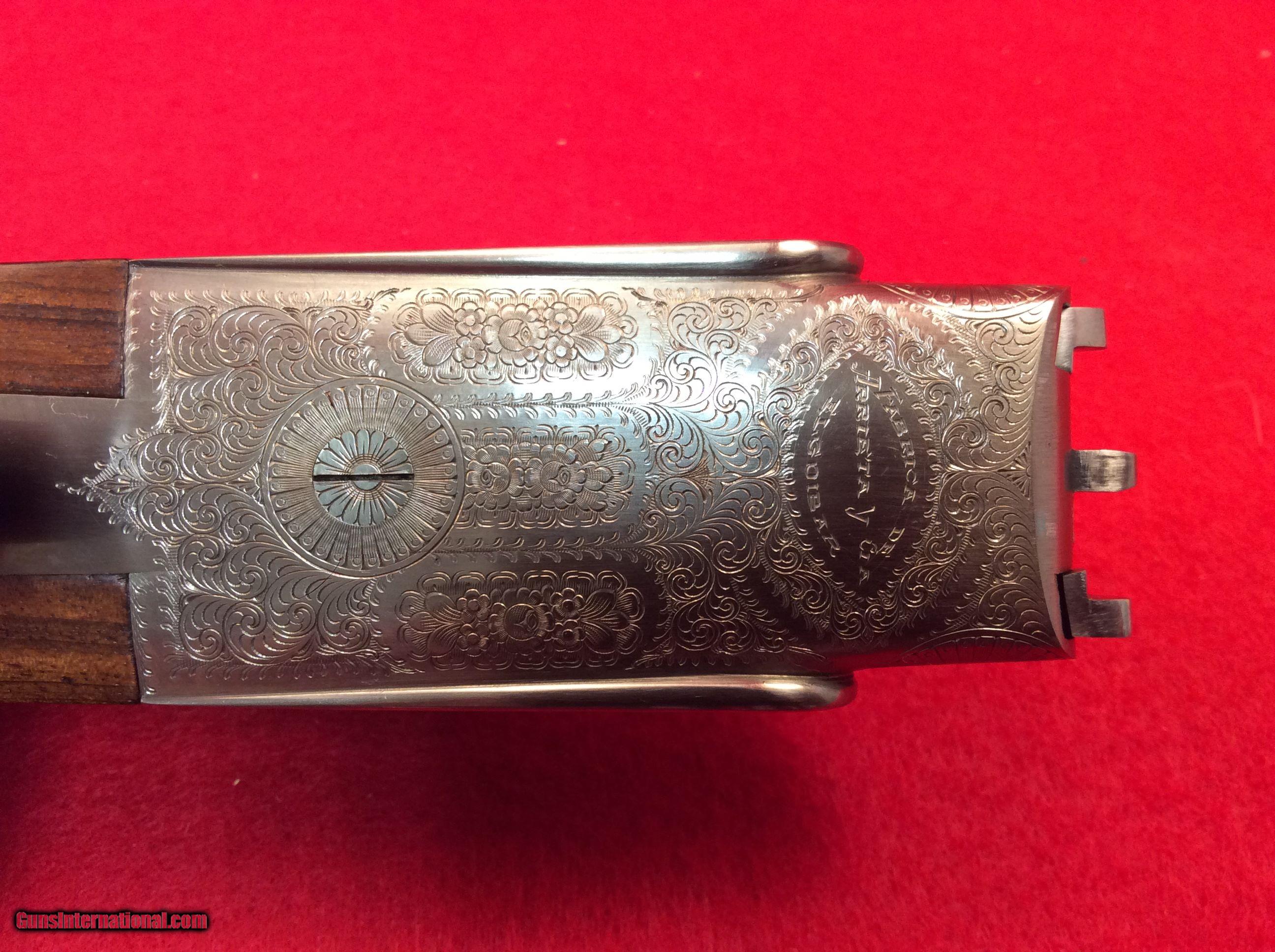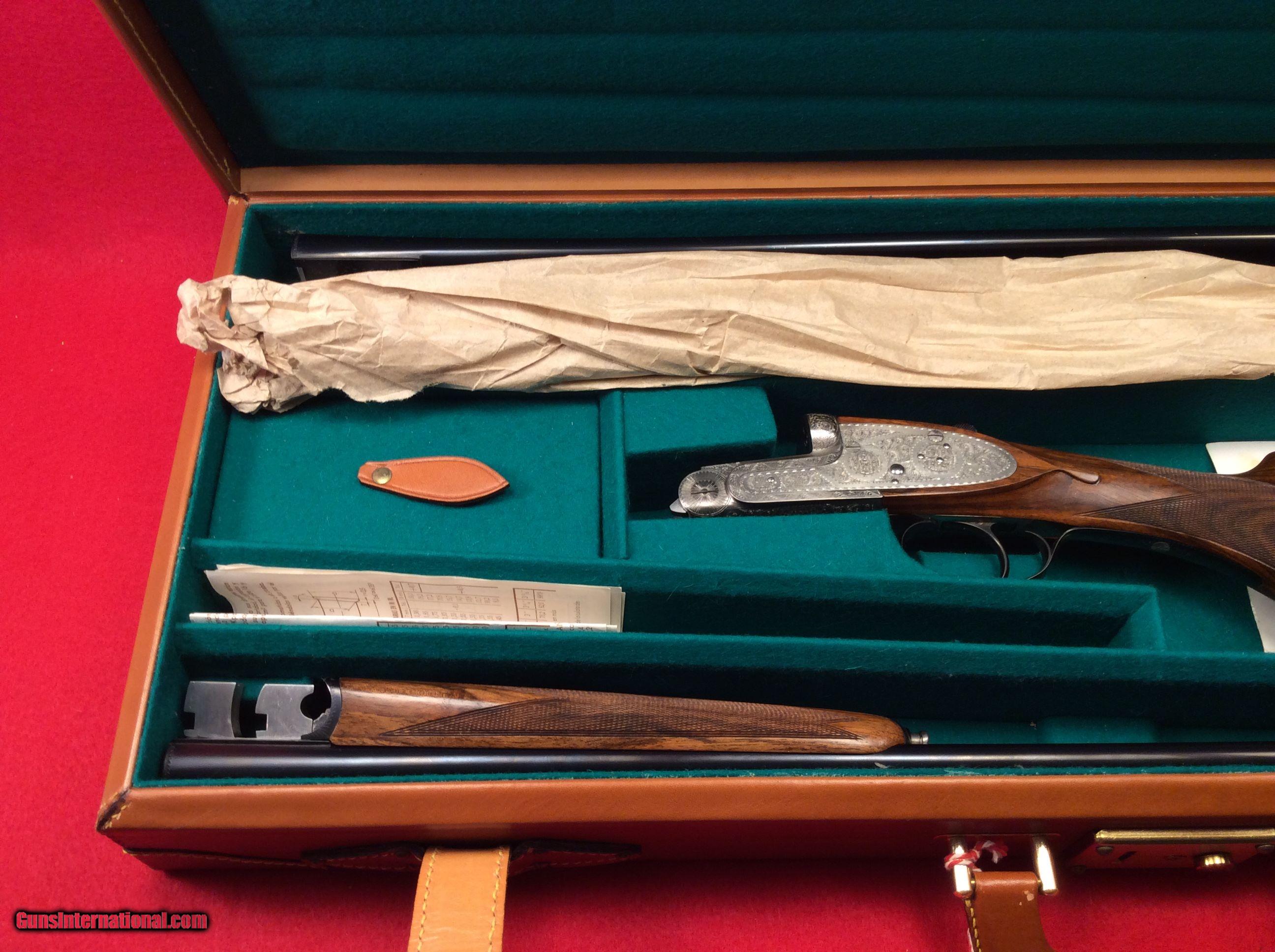 Description: Mountain Valley Armory is proud to offer this like new cased Arrieta 578 side by side shotgun in 410 gauge with three factory barrels. All barrels are 27.5 inches in length and have a matt rib with a single bead attached. Barrel # 1 is choked skeet and skeet. Barrel #2 is choked full and modified. Barrel #3 is choked improved and modified.. All barrels are numbered to the gun.. Single trigger, extra fine line checkering on best quality select walnut straight stock and splintered forend, Checkered butt as well. Engraving is absolutely fantastic and the wood and metal are as nice as the day the left the factory back in 1983. Factory fitted case is also in excellent condition. The current (and original) owner has stated he never fired this gun. The best way to reach us if you are interested in this firearm is to give us a call at 501-609-9595. We are open Monday through Saturday, 10 am to 6 pm CST. Please be sure to look at our other cased Arrieta offerings which include a 28 gauge, 3 barrel set and a pair of 20 gauge, 2 barrel sets. SOLD |