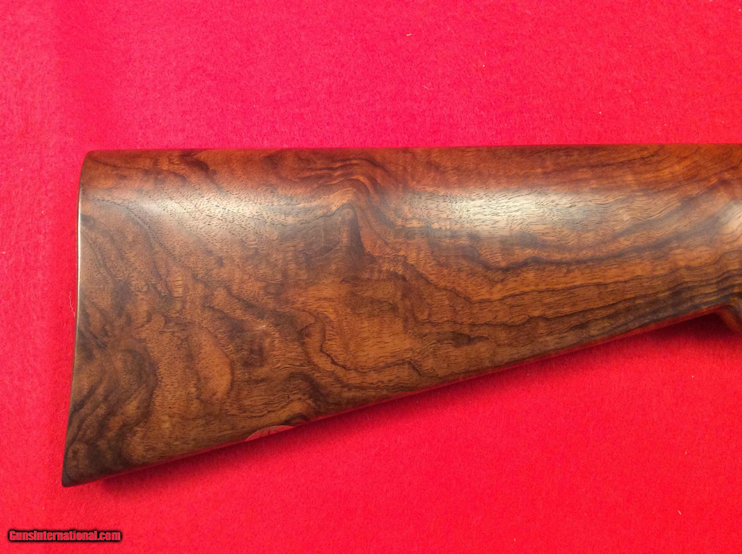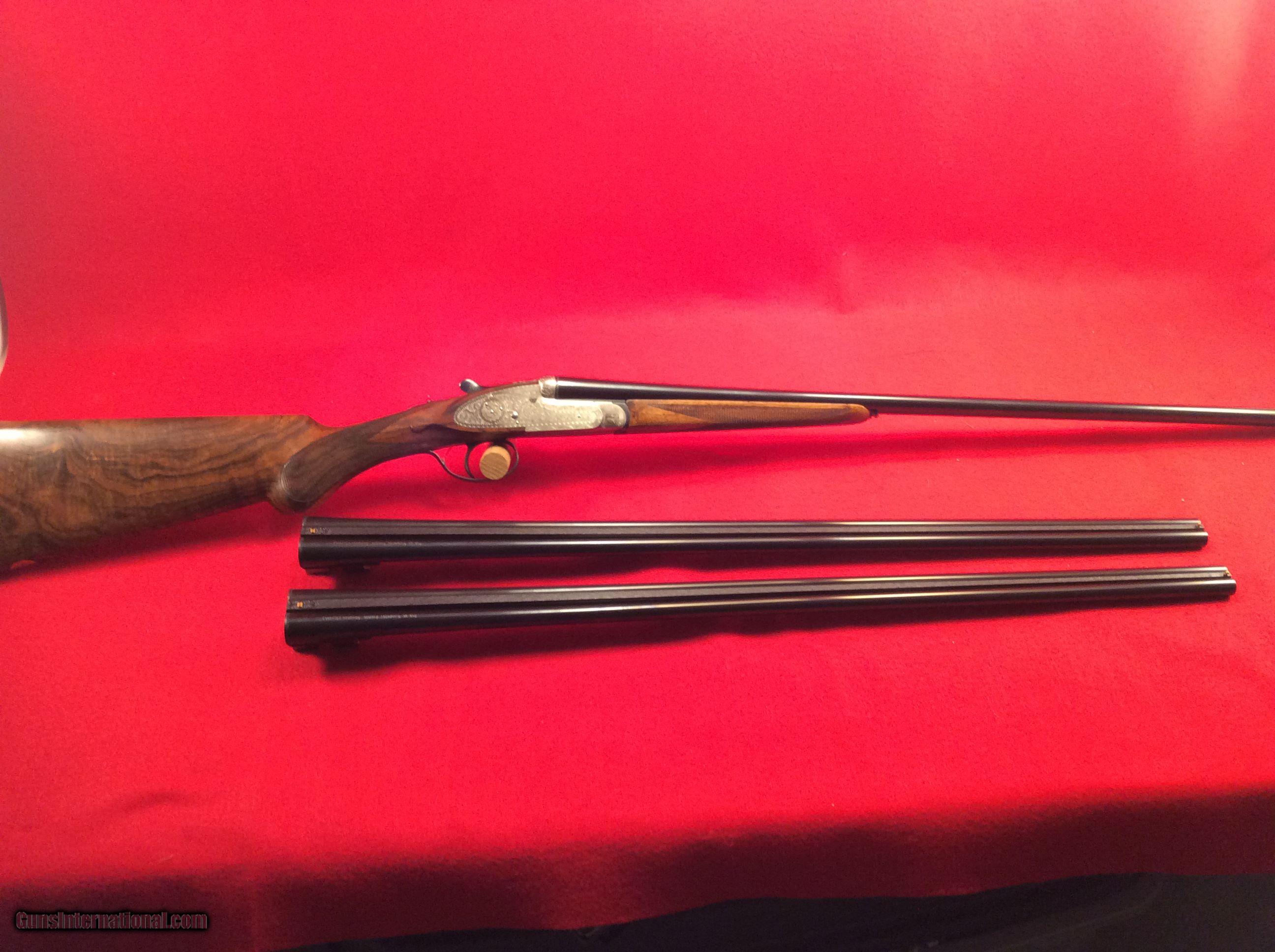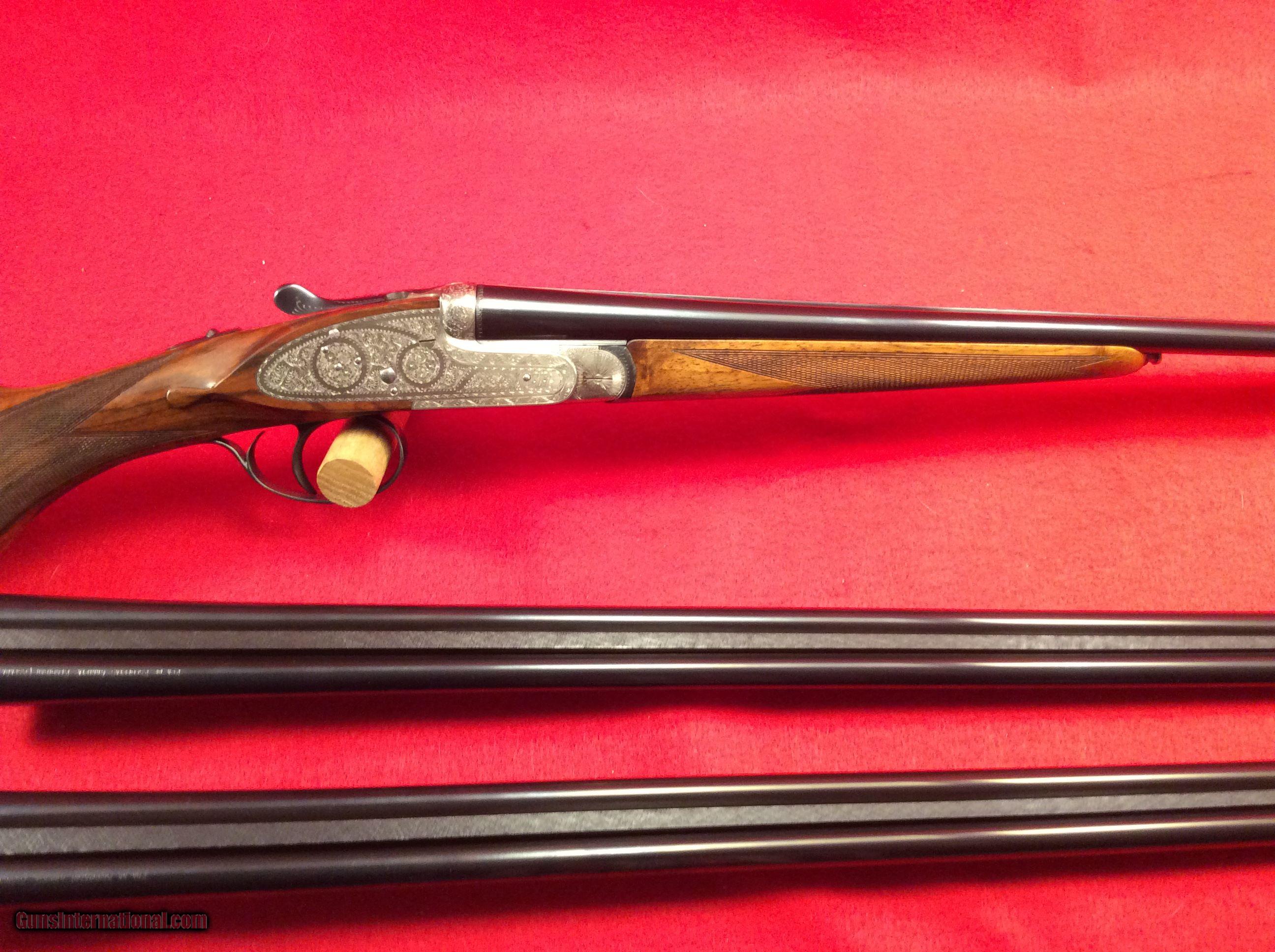 Description: Mountain Valley Armory is proud to offer this like new cased Arrieta 578 side by side shotgun in 410 gauge with three factory barrels. All barrels are 27.5 inches in length and have a matt rib with a single bead attached. Barrel # 1 is choked skeet and skeet. Barrel #2 is choked full and modified. Barrel #3 is choked improved and modified.. All barrels are numbered to the gun.. Single trigger, extra fine line checkering on best quality select walnut straight stock and splintered forend, Checkered butt as well. Engraving is absolutely fantastic and the wood and metal are as nice as the day the left the factory back in 1983. Factory fitted case is also in excellent condition. The current (and original) owner has stated he never fired this gun. The best way to reach us if you are interested in this firearm is to give us a call at 501-609-9595. We are open Monday through Saturday, 10 am to 6 pm CST. Please be sure to look at our other cased Arrieta offerings which include a 28 gauge, 3 barrel set and a pair of 20 gauge, 2 barrel sets. SOLD |