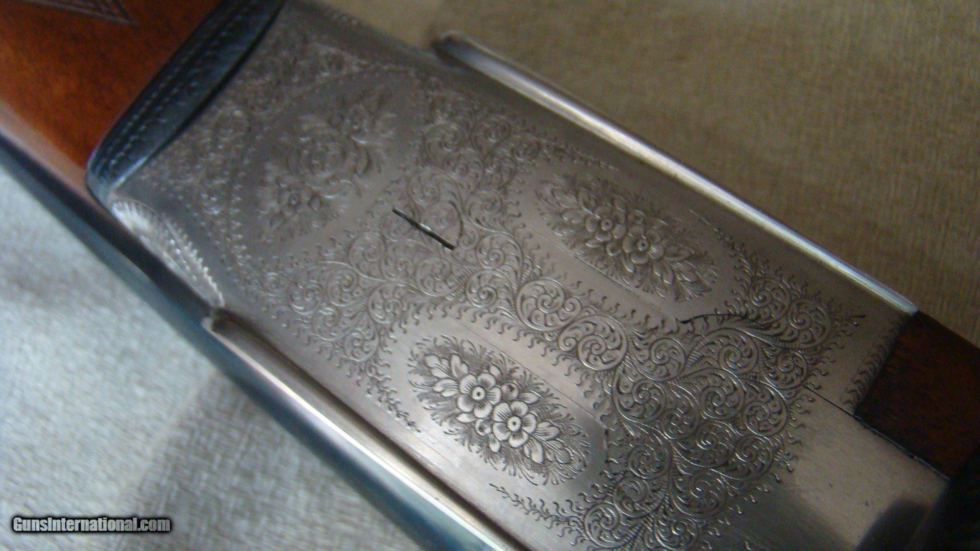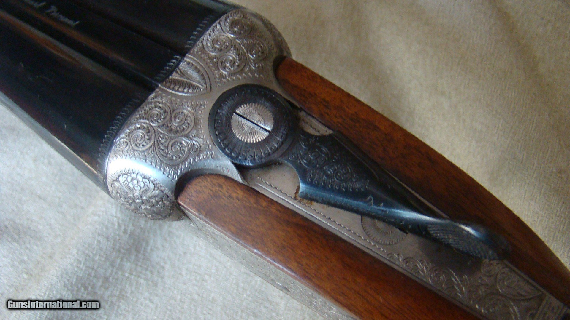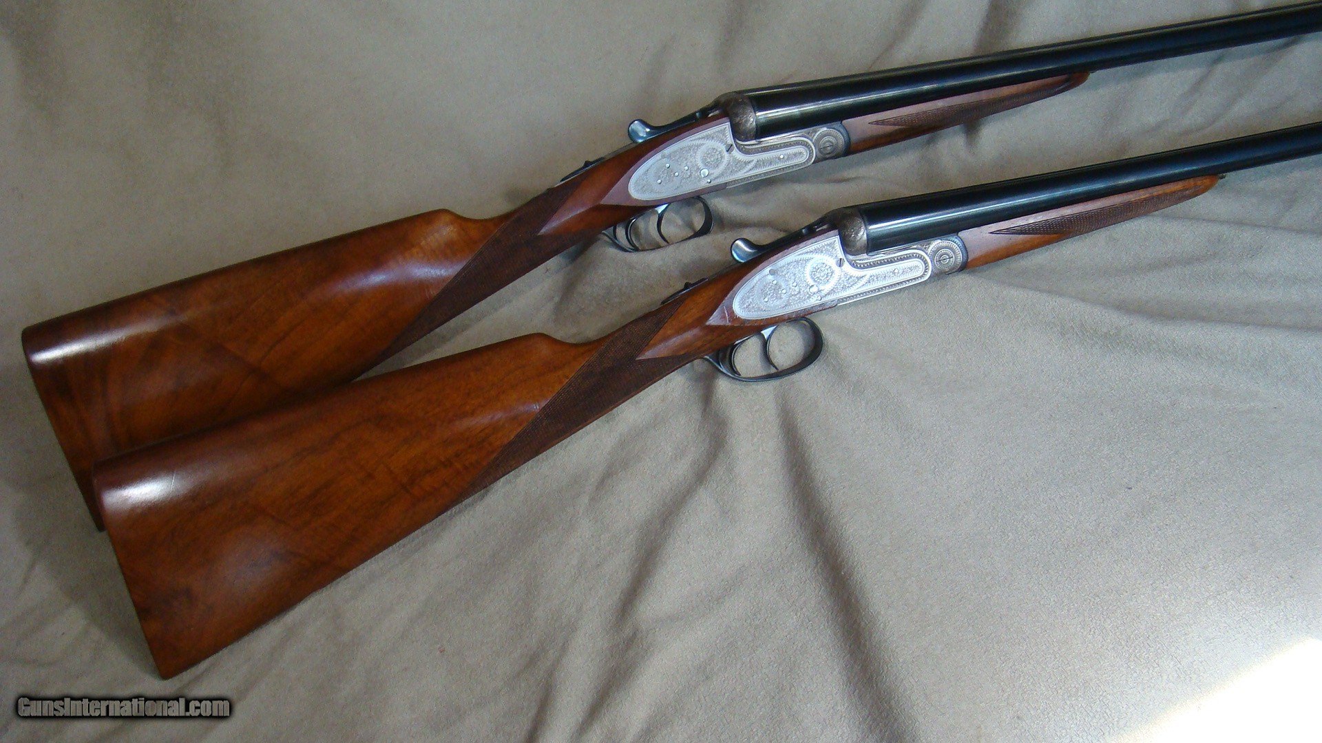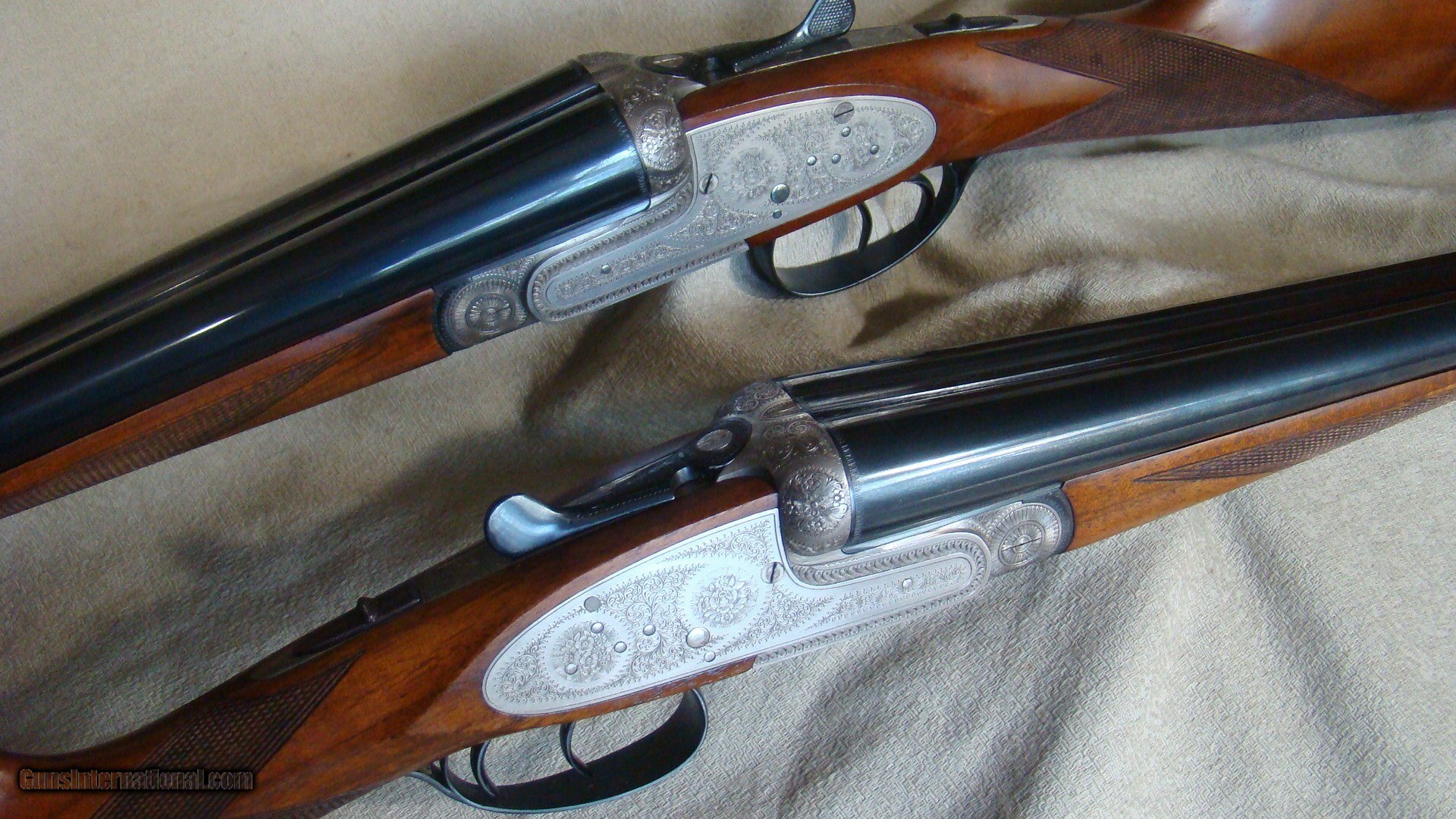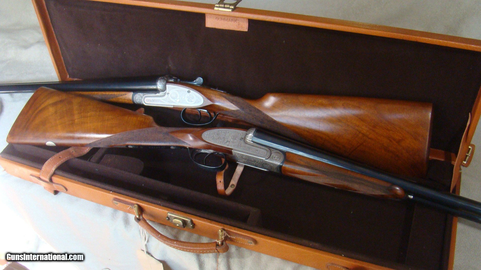 Description: Gunmark Viscount pair by Arrieta, ordered new by the owner, this pair of 12 bore guns feature 2-3/4" chambers, 28" chopperlump barrels choked full and improved cylinder (.009/.026), auto ejectors, auto-safe, double triggers. The sidelocks are engraved in a Purdey-style rose and scroll on an old silver finish. UK-based Gunmark produced these guns in collaboration with Arrieta, striving to create a British-best pair at a very reasonable cost. Essentially Arrieta 578s, these guns have inherent feel and characteristics normally associated with British side-by-sides. Straight stocks, splinter forends, dimensions as follows: comb 1-3/8", heel 2-1/8", approximately 1/4" cast off, length of pull 15-1/2". Weigh 6 lbs, 14 oz. each. This pair has seen very little use and remain in outstanding condition. Ready for your next driven pheasant shoot! Complete with original individual leather cases. SOLD |