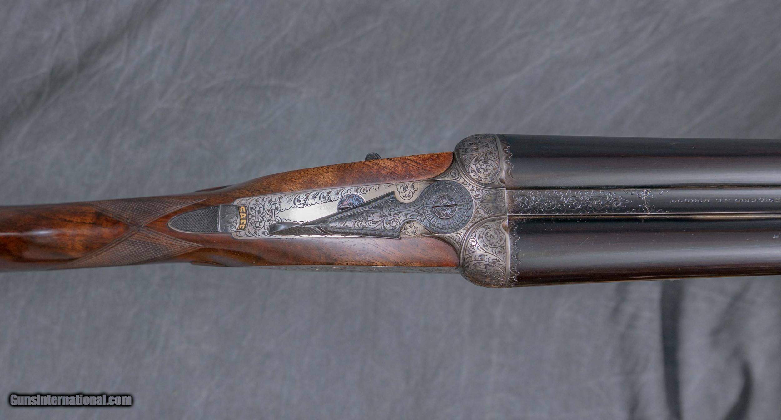 Description: ARRIZABALAGA Heavy Scroll Model Sidelock Ejector 20 gauge SxS, Coin finished fully scroll engraved hand-detachable sidelock action w/ Holland & Holland self-opening system, 26 1/2" bbls. w/ 2 3/4" chambers, Concave rib, Chokes: Right .611 / .015 / IM & Left .610 / .016 / IM, Articulated double triggers, Automatic ejectors, Automatic safety, Well-figured straight grip stock w/ original pad, Splinter forearm, Stock Dimensions: DC: 1 1/2" x DH: 2 1/4" x Cast: 1/8" OFF at Heel x LOP: 14 1/4", Weight: 6 lb. 3 oz., Condition: Excellent w/ maker's VC case, Made in Eibar, Spain circa 1986 for J. Roberts & Son, King St., London. Serial #14152 (C7913) Current MSRP: $25,000+ FIELDSPORT: $9500. SOLD |