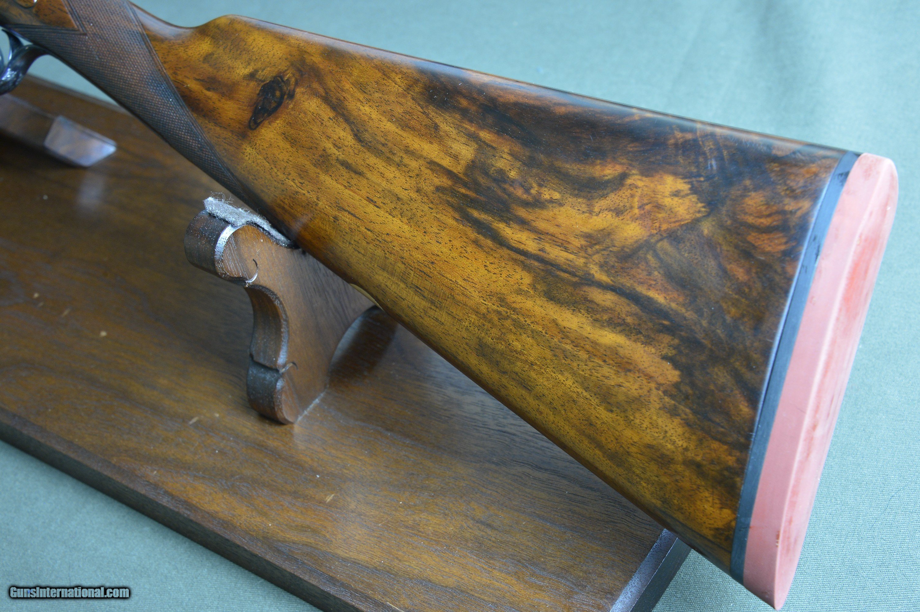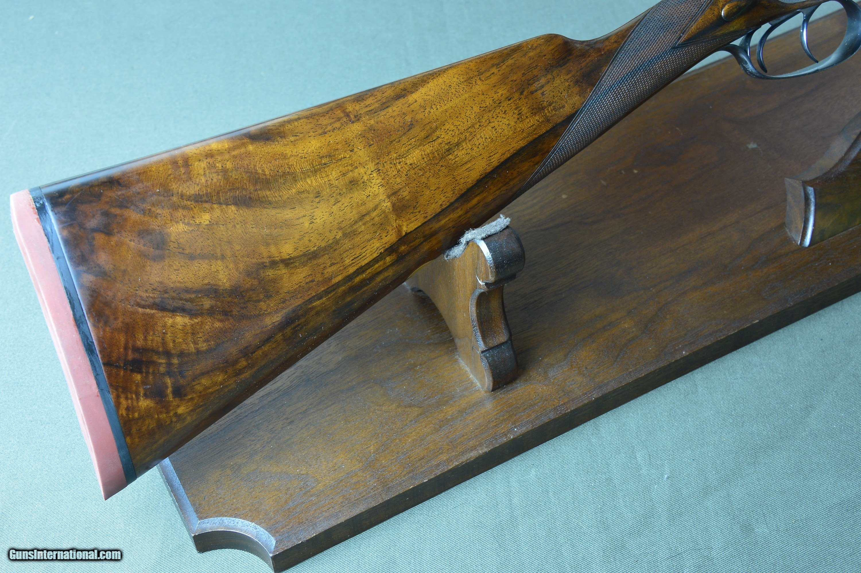 Description: *** SOLD *** The Joseph Lang who was responsible for this gun was the 1st son of the original Joseph who started the business in 1821. The son was apprenticed to James Purdey in 1845 and the very beautiful guns that bear his name reflect this illustrious training. Perhaps most conspicuous is the truly breathtaking engraving that covers every external surface of the action and forend; this style will also be found on guns by Makers such as William Evans. The reason for this similarity may be that many Makers bought in guns from P Webley & Son, a manufacturer of very fine guns for the trade based in Weaman St, Birmingham. The gun has been rebarrelled and restocked in the relatively recent past and together with its fabulous engraving and great dimensions, this gun is a ‘shooter’ in the best possible way and should give many years of sterling service with normal maintenance. Cased with some accessories. Serial number 8418 made circa 1896-97. *** Recently refurbished by Toby Barclay of Heritage Guns UK. This back action barlock sidelock is of P Webley design and features: Double triggers bolted by an automatic top tang safety slide; Back action, 9 pin sidelocks fitted with interceptor sears; Top lever opening, operating a 'Purdey Bolt' by way of a Webley ‘Screw Grip’; Top rib extension with 3rd bite; ‘Southgate’ style ejectors tripped by cocking rods running from the action knuckle to the breasts of the tumblers; Anson pushrod forend catch. Note: Replacement LH Mainspring. Gun weight 6lb 10oz. Engraving style ‘Ribboned’ fences. Best Bouquet and Scroll. Toplever and forend tip engraved ‘1’. Toplever engraved ‘PATENT’. Gold inlaid SAFE. Trigger pulls measure approximately: Front trigger 3 ½ lbs Rear trigger 4 ¼ lbs. *** The replacement steel barrels are 28" in length, chambered for 2 3/4" (70mm) cartridges and are of brazed 'dovetail' lump construction with soft soldered ribs. Top rib is of the smooth, concave, game type. The rib is inscribed "Joseph Lang & Son Ltd. 102 New Bond St. London W." Birmingham reproof for 70mm nitro powder cartridges in 2019. The right barrel is bored 0.730 with a constriction of -0.005 for Skeet choke. Minimum wall thickness is 0.030. The left barrel is bored 0.729 and has a constriction of 0.020 for Modified choke. Barrel wall thickness is 0.028. The replacement Straight Hand Stock and Splinter Forend are crafted from well figured walnut. The stock features a vacant gold oval, well defined drop points, is lightly cast-off for a right-handed shot and is finished with a checkered butt. The forend features a finely engraved steel tip. The 24 lines per inch checkering is refreshed to the normal sidelock design. The stock is finished with a traditional linseed oil based preparation as used on best guns by one of the top English makers. This finish uses no grain fillers to achieve its deep, smooth lustre, only many hours of alternate build and flatting off of the surface. Stock dimensions are 14-7/8” including a ½” red Silvers-style recoil pad by 1-9/16” by 2-3/8”’. Slightly cast off for the righthand shot. *** With its maker’s name, carved fences and shootable dimensions this Lang will make a great gun for game or clays. *** I am the US Agent for Heritage Guns, UK. *** Please note that the photographs are part of the description. Not for sale where prohibited by state or local laws. Buyer is responsible for all shipping, insurance, and any other related charges. I give a 3-day non-firing inspection period which begins when it arrives at the buyer’s FFL or specified address if the gun is classified as an Antique. Returns at buyer’s expense. SOLD Antique: Yes |