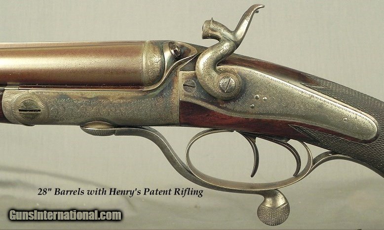 Description: #5895, Stephen Grant & Sons, 67A St. James's Street, London: A Very Well Kept Stephen Grant 450 3 1/4" Black Powder Express Made in 1888 for Mr. D'arcy Chayter, Esquire, A Jones Action Underlever Back-Action with Non-Rebounding Hammers, It is with 28" damascus barrels with a rib extension with Henry's Patent A&T (Arthur Adams & Joseph Tate - Barrel makers & riflers) rifling, London proved;, Full length rib with 1 standing rear sight, Percussion style fences, Half cock hammers, A frontal Anson forend release, Steel engraved grip cap, Sling eyes, 14 3/8" LOP over a 1" Kick-Eez pad, 9 lbs. 1 oz., Very nice figured wood with excellent & deep black/brown color & contrast, 85% coverage of very fine scroll engraving, The engraved trigger guard tang extends to the engraved steel grip cap, This vintage Classic still retains an honest 40% original case colors, The barrels have been professionally rebrowned, The trigger guard & tang retain original finish, The buttstock & forend have been re-oiled and they remain now at 97%, The checkering is still at 98%, The breech face retains 98% of its original case colors, The inside of the forend has 98% case colors, Every screw inside & out is still 95%, As you would expect the bores are in excellent condition, The whole is cased in a period brass cornered oak & leather trunk with a modern trade label with the proper address. The rifle is accurate, and a lot of various loading information comes with the gun. Stephen Grant was established in 1867 at the address of this gun, prior to that he worked for Charles Lancaster and later was the Managing Partner at Boss & Co. in 1857. Mr. Grant died January 21, 1898 but the firm lived on. Stephen Grant obtained Warrants of appointment from the Royal Houses of France, Spain, Germany, Austria, Hungary, Russia, Persia and Turkey. In 1925 the firm went with Joseph Lang. In the 1930's Grant & Lang joined with Atkin, Beesley, Hellis, Hussey, Watson Bros. and Lancaster. In 1960 the firm was operating as Atkin, Grant & Lang and by 1971 it was Churchill, Atkin, Grant & Lang. In the 1990's Ken Duglan operated it as AG&L and by mid-2011 Mr. Francis Lovel purchased the business. He was no stranger to the trade as he also owns Francis Lovel & Co. Ltd. (francislovel). Mr. Lovel shortly thereafter started building Grant over & unders, Grant sidelever's, Atkin spring openers, Atkin over & unders, Lang double express rifles and Lang bolt rifles. You can check out their offerings at agl-uk SOLD Antique: Yes |
