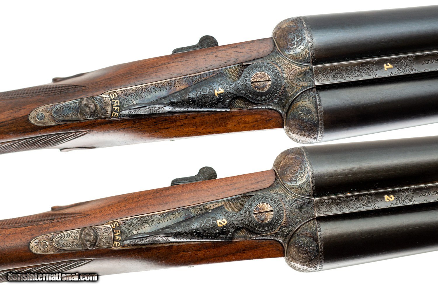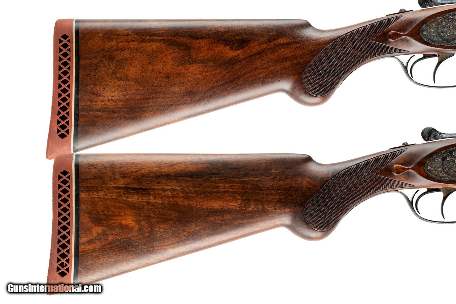 Description: BOTH GUNS ARE THE SAME 26" 009 AND 018 DOUBLE TRIGGER EJECTORS SPLINTER FOREARM PISTOL GRIP EXCELLENT CONDITION WITH LIGHT HANDLING MARKS MAKERS CASE 6LBS 11 OZ 2 3/8 DAH 1 1/2 DAC 14 1/2 LOP SOLD |
