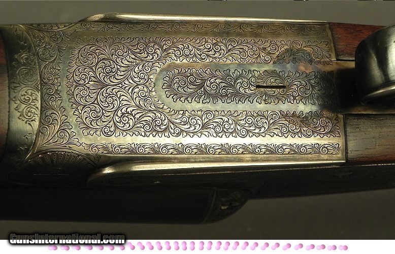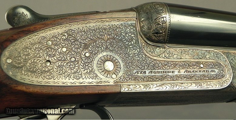 Description: #122, AYA-Aguirre & Aranzabal-Made in Spain: A Factory 2 Barrel Set Bar Action Sidelock Ejector 16 Bore Made in 2002 as a Model No. 2, Both barrels are 28" Demi-Bloc Chopper Lump, The #1 barrels at .662 .000 & .008" (Cyl. & Imp.Cyl.), 2 3/4" chambers, The #2 barrels at .661 .008 & .014" (Imp. Cyl. & Mod.), 2 3/4" chambers, The forcing cones very nicely opened on both sets of barrels, Bushed strikers, Double triggers with the front articulated, Splinter forend with an Anson release, Straight hand stock at 15 x 1 1/2 x 2 5/16" over a checkered butt, Neutral stock for the right or left hand, Rolled trigger guard edge for the right hand, 6 lbs. 9 oz., Very nice wood with excellent color and contrast, 98% coverage of scroll engraving on a case color finished frame, The original barrel blue is at 98% on both barrel sets, The original case colors at 75%, The stock finish at 96%, The checkering at 99%, The bores remain as new on both sets, This piece is smack on the face with excellent bite remaining. This piece points great with these stock dimensions if you like a 15" length of pull. The whole is cased in a very nice leather trunk with leather corners with an AYA trade label. SOLD Shotgun Gauge: 16 Gauge |
