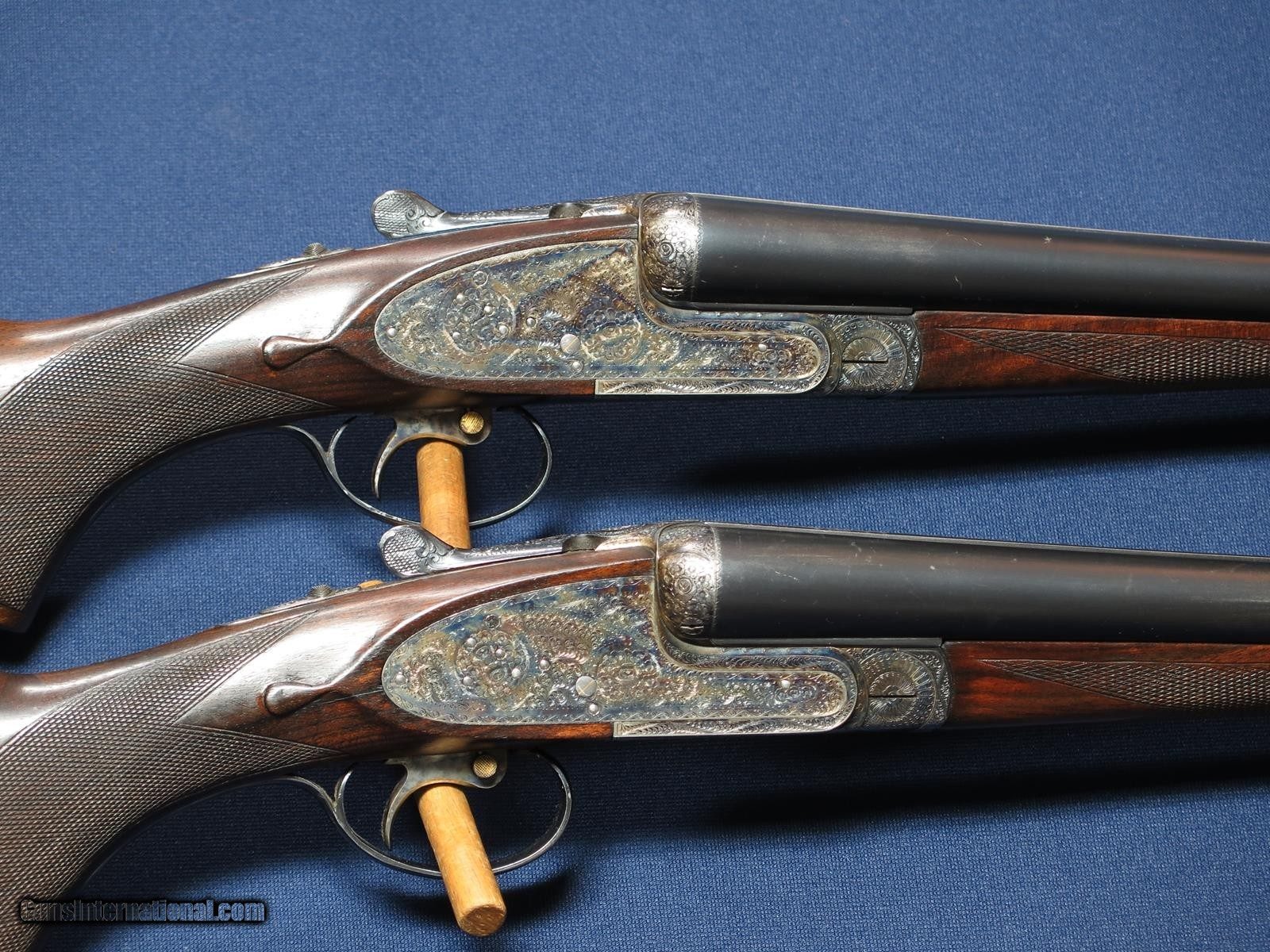 Description: AYA #2 12ga Match Pair. Numbered 1 & 2. Consecutive serial numbers. Sidelocks. S.S.T. Ejectors. 28 inch IC & Mod + 28 inch Mod & Full. Both 15 inch LOP checkered butt. 1 3/8 comb 2 inch heel. 95% case coloring. 96% blue. 2 3/4 chambers. Excellent bores. SOLD |