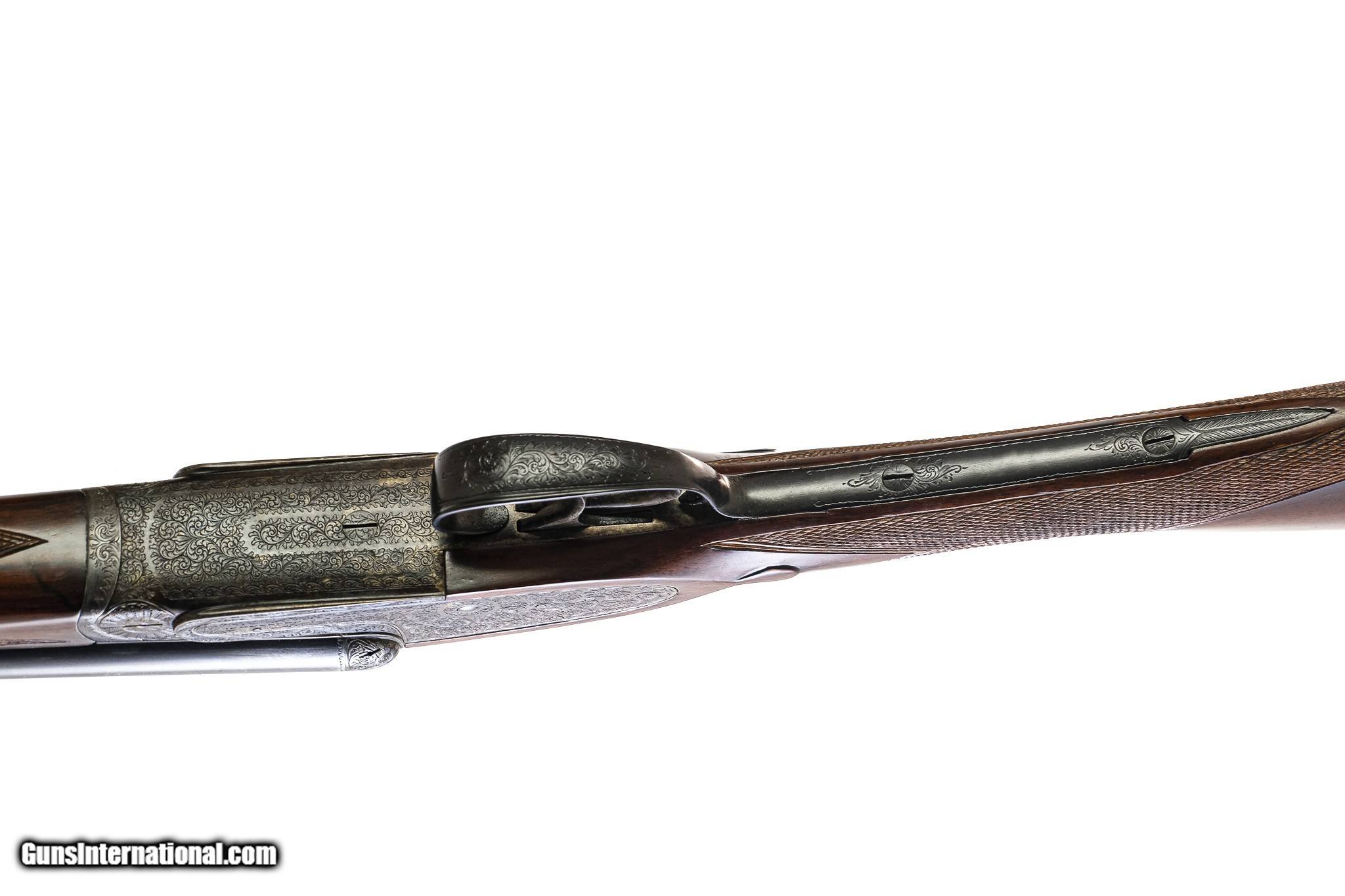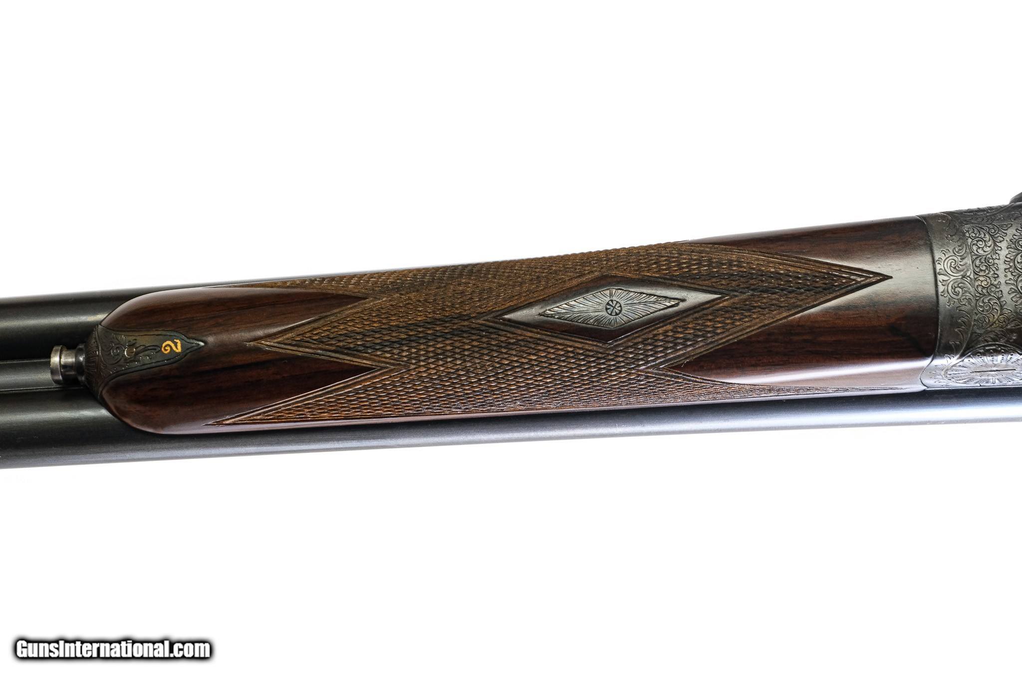 Description: AYA - #2 Hand Detachable Full Sidelock, SxS, Matched Pair, 20ga. 28" Barrels. Hand detachable side lock ejector, consecutive serial number, gold 1 and 2 made in 1999, 28" barrel 2 ¾ inch chamber, improved cylinder, gold number 1 and 2, automatic safeties, rolled edge trigger guard, articulated front triggers, beautifully engraved with large ornamental scroll on 100% of the receiver, with perfect engraving and perfect screws, straight grip, splinter fore-end, checkered butt, most of the Spanish case color which is gray in ton, straight grained European walnut, very clean serviceable, and tight. Inv: 79247 - 79248 6 lbs. 0 oz. 15 1/8" x 1 5/8" x 2 1/2" $9,500.00/Pair or $5,000.00/Each SOLD |