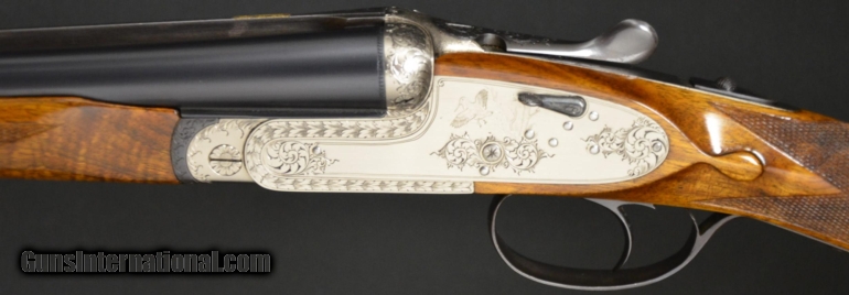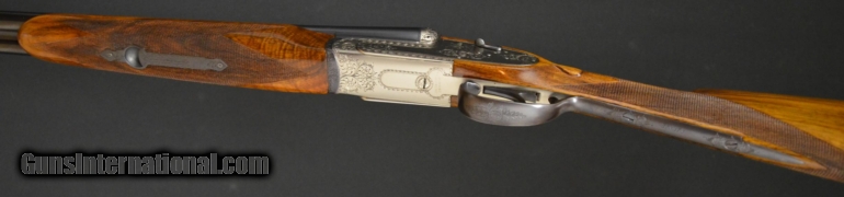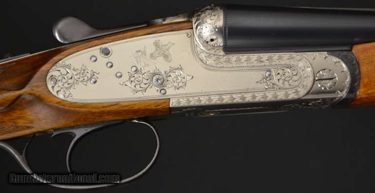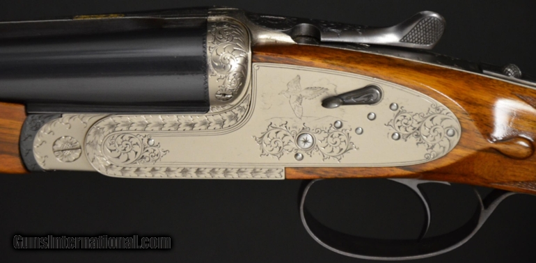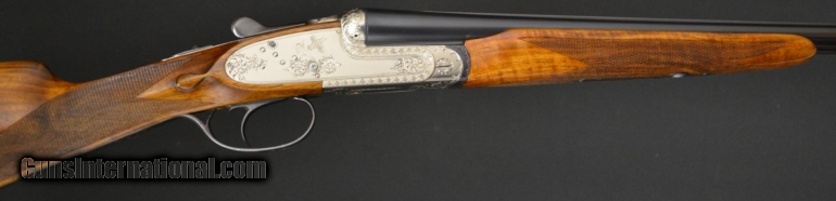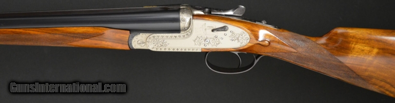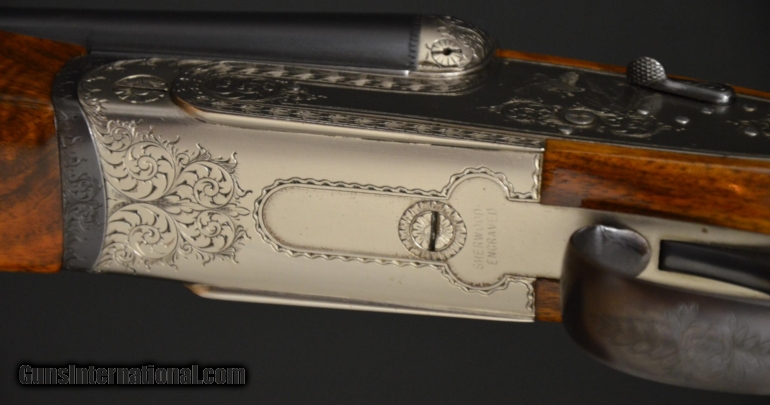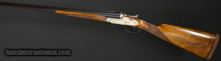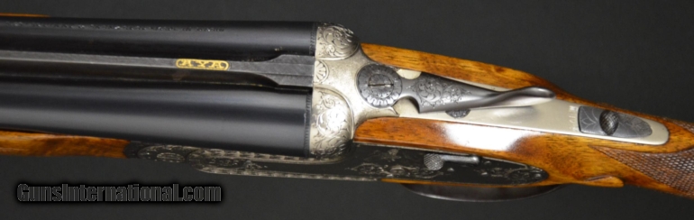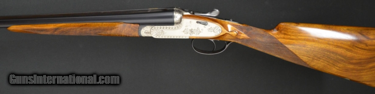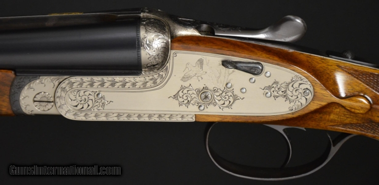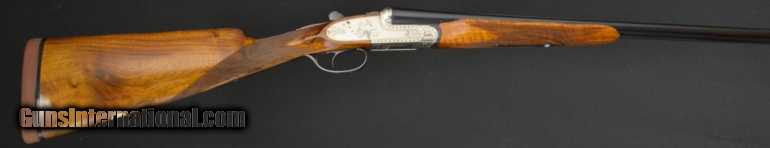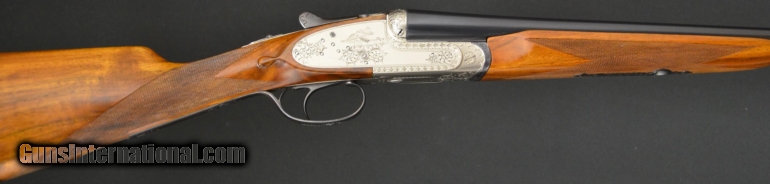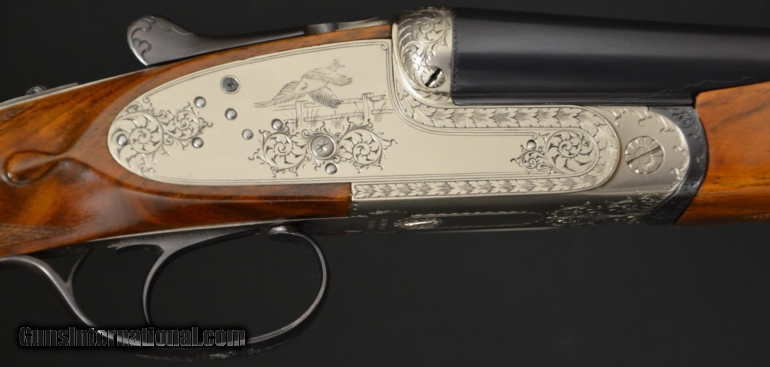 Description: AYA- #2 Two Gun Matched Set 28/20ga.– Special Order Guns - 28 gauge gun with 27” barrels choked M/F, 20 gauge gun with 27” barrels choked Cyl/IC, straight grip stock, beavertail forends, RARE single triggers, Churchill ribs, 14 ¾” length of pulls to a Pachmayr recoil pad, gold ovals, chopper lump barrels, automatic safety, full sideock shotguns with hand detachable locks, engraving features a woodcock and quail in flight surrounded by beautiful deep scroll on the 28 gauge gun and a pheasant and a pigeon in flight surrounded by beautiful deep scroll on the 20 gauge gun, both guns are executed and signed by Sherwood, a gorgeous one of a kind special order set cased in a two gun leather trunk case, the guns remain in excellent overall condition with very minimal use, available for immediate delivery.