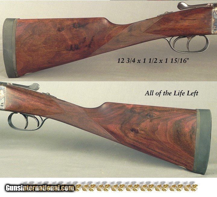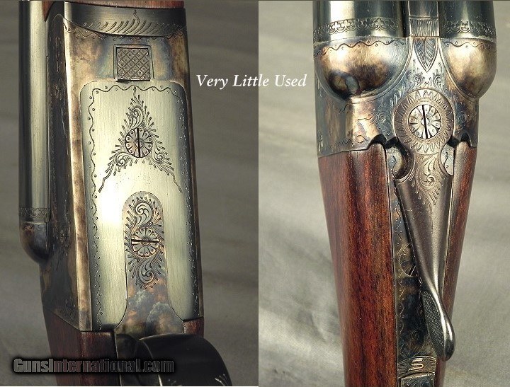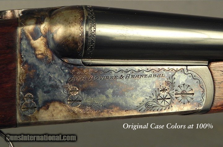 Description: #080, AYA-Aguirre & Aranzabal-Made in Spain: A 20 Bore Ideal for The Lady or Youth with 12 3/4" LOP, A 20 Bore AYA Model #4 Boxlock, Made 2004, 28" Chopper Lump barrels at .625. .011 & .021" (Skt.II & Mod.), Original 2 3/4", Bushed strikers, Double triggers, Splinter forend with a frontal Anson release, Straight hand stock at 12 3/4 x 1 1/2 x 1 15/16" over a 1" Terminator soft pad, 5 lbs. 10 oz., Decent wood, 15% coverage of scroll engraving on a case color finished frame, The original barrel blue is at 99%, The original case colors at 100%, The stock finish at 99%, The checkering at 100%, The bores remain as new, This piece is smack on the face with excellent bite remaining. It has 6 retainer screws on key screws which is unusual for a gun in this price range, plus it has chopper lump barrels. It was imported by the Gunmaker Mr. Jack Rowe after he left our shop and went on his own here in Enid, Oklahoma. This piece was little used and has all of its mechanical life left. This is like buying it new. SOLD Shotgun Gauge: 20 Gauge |