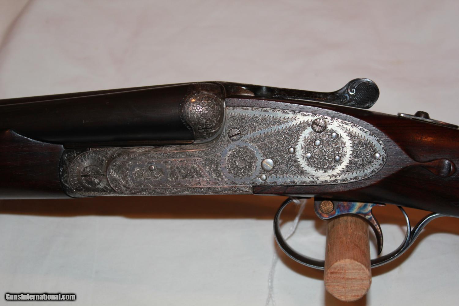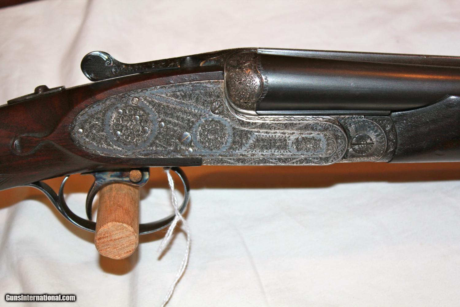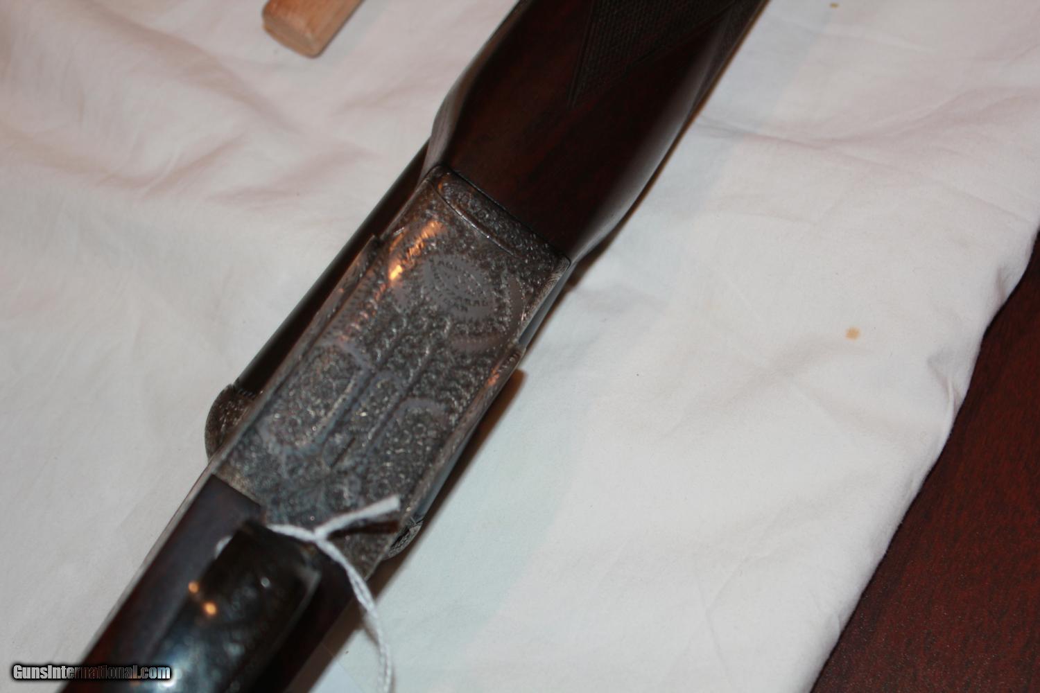 Description: A sweet good looking 20ga 26 1/2 in barrels choked F/F (open to your choice)has a 14 1/4 LOP from a rear single selective trigger very nice oil finished wood a checkered butt beavertail forearm an extremely nice gun not many around got a little blue wear wood is exc Very nice engraving ,sideclips, internal 3rd fastener ,ejectors SOLD |