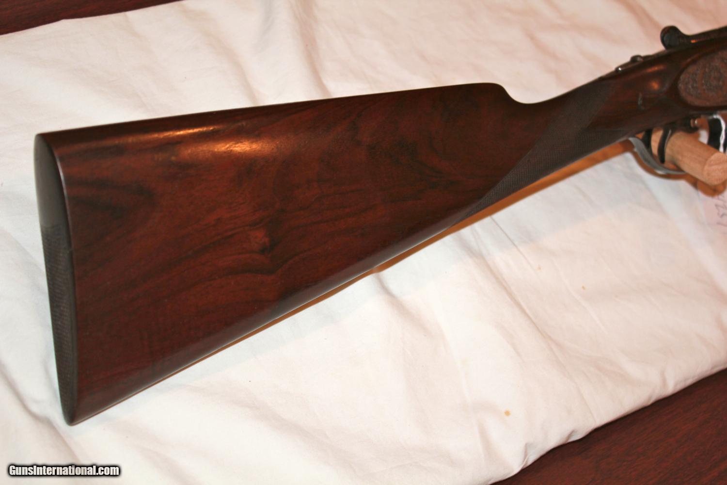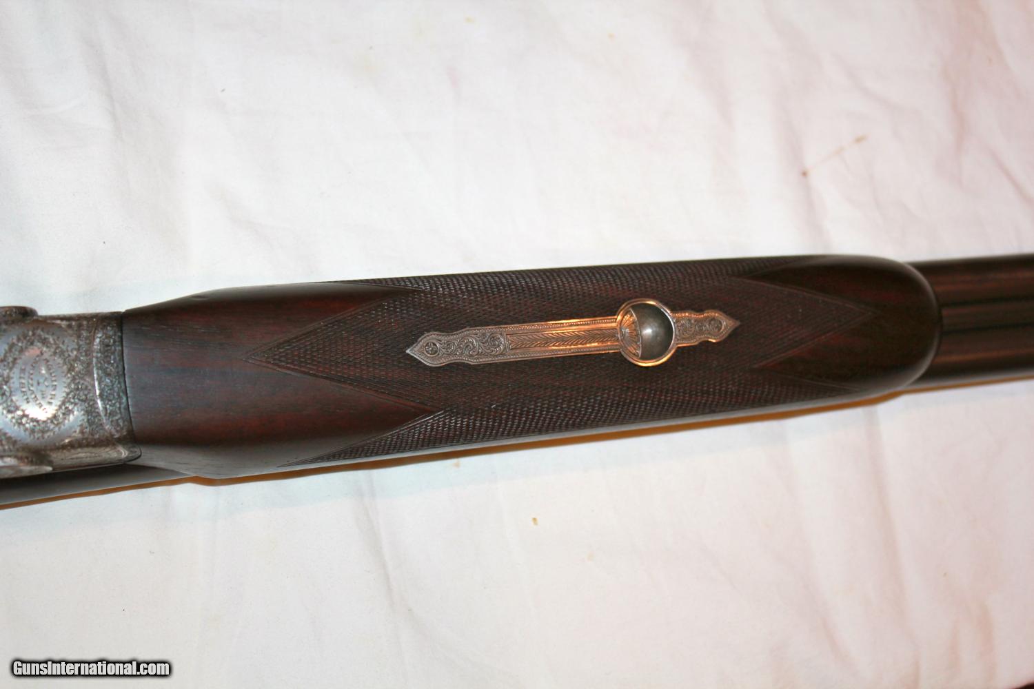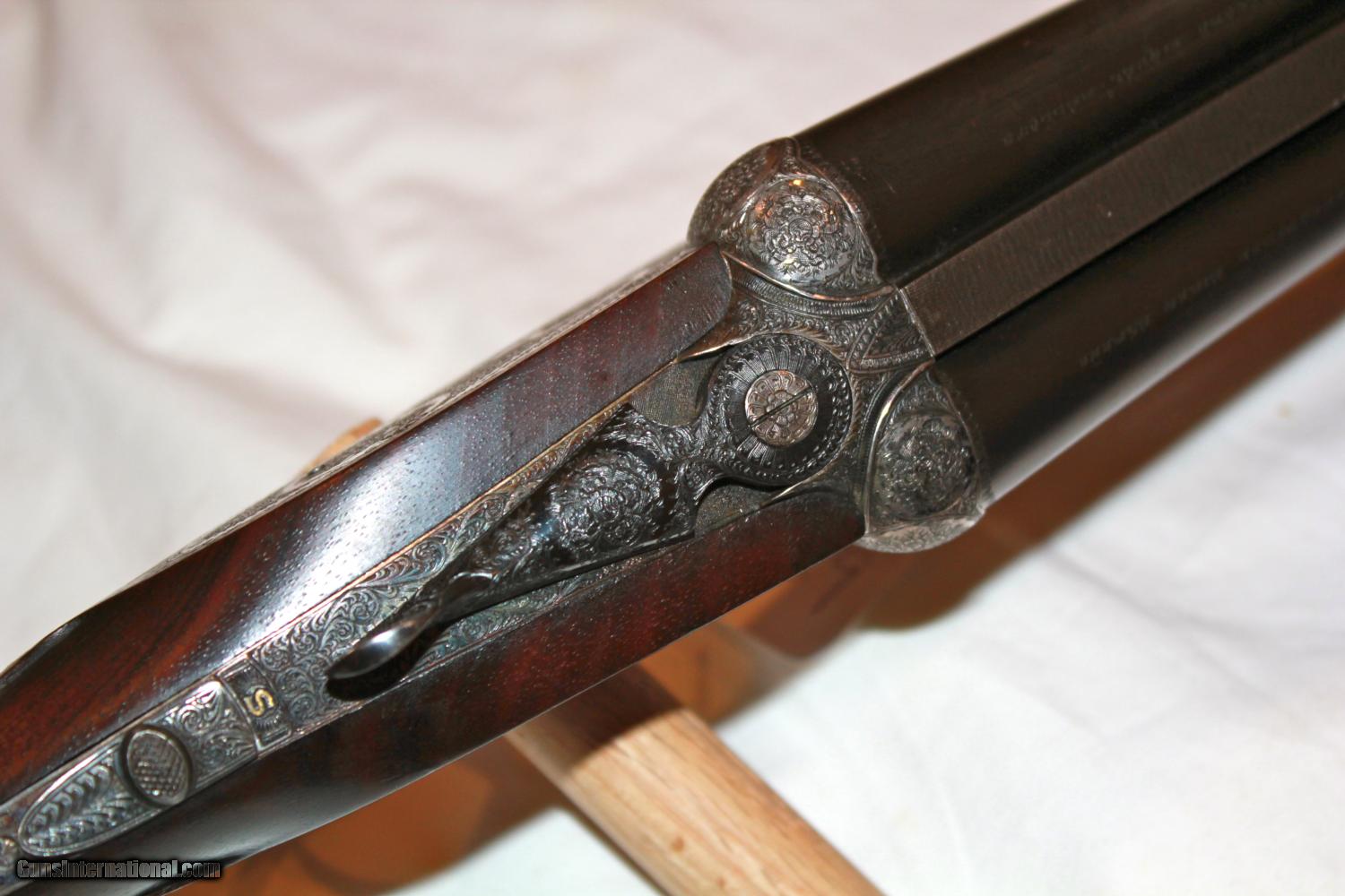 Description: A sweet good looking 20ga 26 1/2 in barrels choked F/F (open to your choice)has a 14 1/4 LOP from a rear single selective trigger very nice oil finished wood a checkered butt beavertail forearm an extremely nice gun not many around got a little blue wear wood is exc Very nice engraving ,sideclips, internal 3rd fastener ,ejectors SOLD |