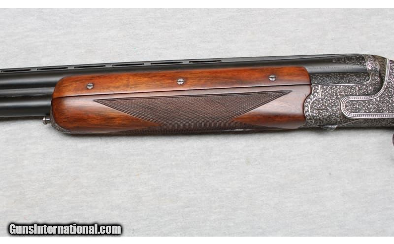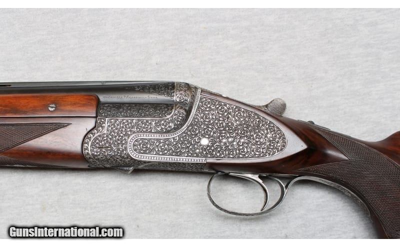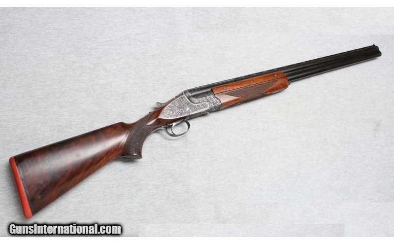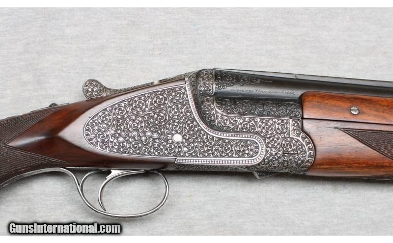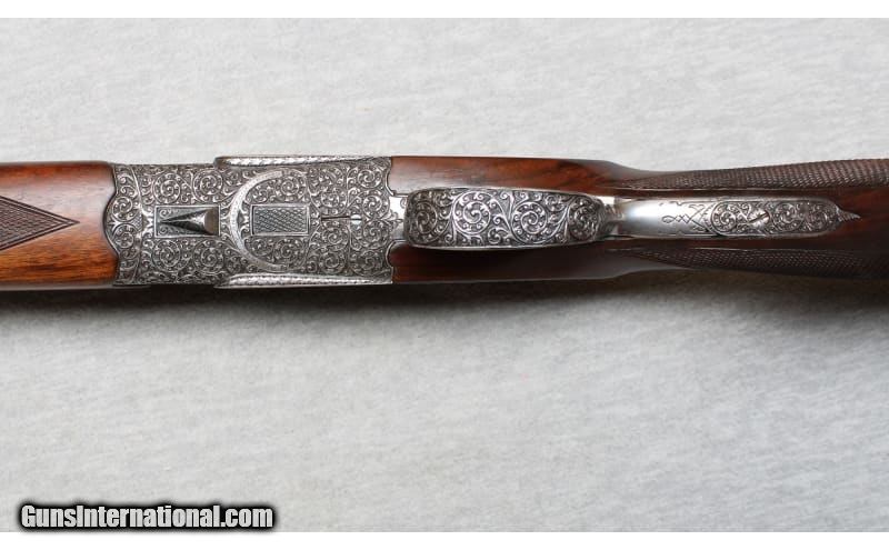 Description: AyA Model 37 Augusta Grade in 12 Gauge. This is a fine shotgun manufactured in Eibar, Spain by Aguirre Y Aranzabal. It features 28 inch barrels with hand matted vent rib, sidelock action featuring single non-selective trigger, selective ejectors, non-automatic safet, and gold bar tumbler cocking indicators. It has full coverage deep relief tight scroll engraving that continues to breech end of the barrels and forearm iron. The engraving is highlighted by dark backgrounds. Inside of the forearm iron is machine jeweled. The 3 piece forearm & pistol grip stock are dark colored fancy European walnut with point pattern hand checkering. 12 Gauge SOLD Chambers: 2 3/4 Inches Metal Condition: Excellent Wood Condition: Excellent Bore Condition: Bright Barrels: 28 Inches Triggers: Single non-selective Stock Dimensions: LOP 14 1/8 Inches Fore End: Checkered Walnut Butt Pad: Rubber pad Sights: White bead on ventilated rib Chokes: Improved Cylinder/Modified Item Location: La Vista, NE |