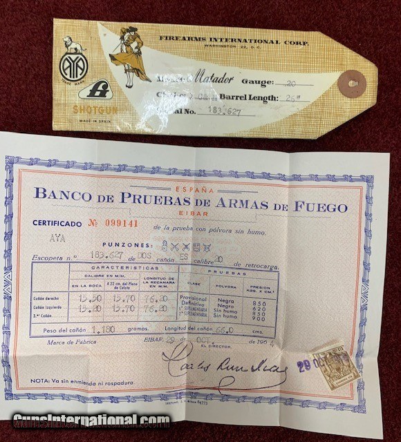 Description: AyA Matador II 20g 26" Great entry level 20g sxs. Muzzle has some pitting, nicks, and discoloration; Orvis gunsmith polished and cleaned up very nicely. Barrels are perfectly fine. Bores are clean. Gun is tight and has seen little use. Handling marks and some worn bluing on barrels seen in photos. Nice colors. Great price! Call or email for additional information. SOLD Shotgun Gauge: 20 Gauge Manufacturer: AyA Model: Matador II Serial Number: 183627 Barrel Length: 26 Chambers: 3 Ejectors: Yes Condition: Good to very good Metal Condition: Good Wood Condition: Good Bore Condition: Very good Triggers: Single Selective Stock Comb: 1 1/2 Stock Heel: 2 3/8 Stock Cast: Neutral Fore End: Beavertail Butt Pad: Rubber LOP: 14 3/8 Rib: Vent Weight: 6 1/2 lbs Sights: Bead Choke Left: Modified Choke Right: Improved Cylinder |
