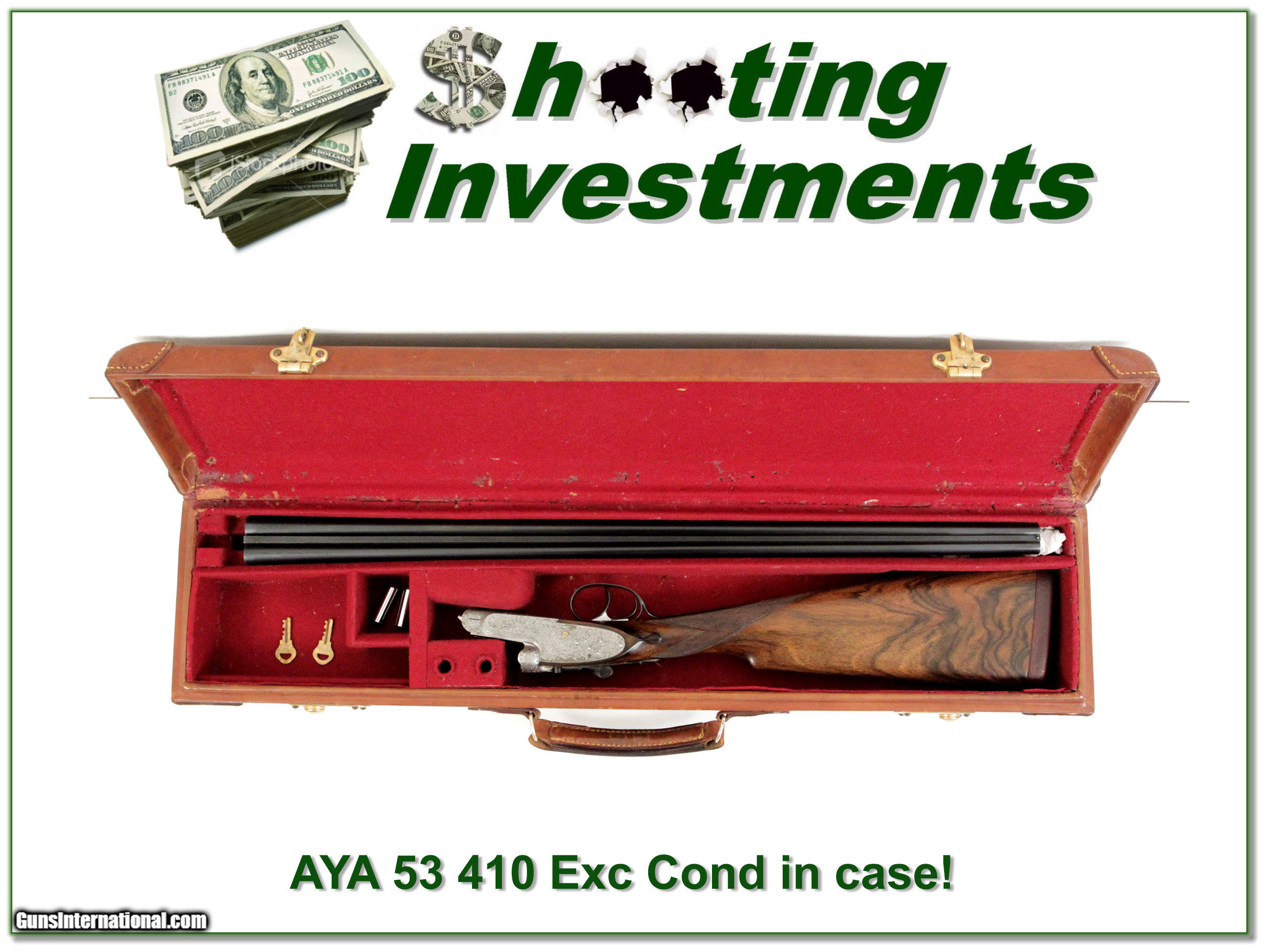 Description: Collectors, this is a beautiful AYA 53 in the very hard to find 410. It was made in 1955 and expertly executed engraving. The engraving on the early guns is far superior and with more coverage than later ones. This one has 26 in barrels choked Full and Mod. It will make a prized addition to your collection! I am selling this one on consignment and as such, lay-a-way can’t be used. It does of course have the standard 3-day inspection. Shipping and insurance is $85. Please email me with any questions or larger pictures. (Consign your quality firearms with Shooting Investments for only 10%! Let me know if you have any you would like to sell!) 17-0525 Payment: Payment is by Money Order, Cashiers Check or Personal Check. I can now also accept MasterCard and Visa with a 3% convenience fee. PayPal can be used for some items but never firearms. Please let us know if you would like to pay via PayPal. Shipping: The shipping charge will be listed in each description. It is $35 for most guns. Some heavy guns or those insured for over $2000 will be higher. Shipments to Alaska and Hawaii are higher because air shipment is required. Most firearms are shipped within 5 days of receipt of payment. We prefer shipping at the beginning of the week to avoid firearms in transit over weekends. We package all shipments carefully and insure them for the full purchase price, rounded up to the next $100. In the unlikely event that damage occurs, it is important that you save all packaging material for the claims process. Optics are shipped Priority Mail and most other non-firearm shipments are shipped First Class. Returns: Our return policy is simple. If for any reason you are not pleased with your purchase, you may return your item for a refund. The only exception is ammunition, it cannot be returned. It is important to us that you are happy. Guns cannot be fired or dissembled before returning them and must be returned in the same condition as received. Notification of a return must occur with-in 3 days of receipt at your dealer. Shipping, convenience and dealer fees are not refundable and are the responsibility of the buyer. Lay-a-way: If needed, we offer a 60 day lay-a-way option on most firearms. It is 1/3 now, 1/3 in 30 days and 1/3 in 60 days. Lay-a-way firearm sales are final. Consigning your firearms with Shooting Investments: We will help you get top dollar for your firearms. While most local guns shops charge 20% or more, our fee is only 10% with a minimum of $50. At your local gun shop it might take months to sell. Selling on-line provides instant access to thousands of interested buyers. You won’t find any other on-line dealer willing to sell your firearms for only 10% or listing every gun on 4 separate s. Selling through an House typically costs the seller 15% and the buyer an addition 15% (so 30%) and you have to wait several months to sell and longer to receive funds. If properly priced, we will sell your firearms in a week or two. Send us an email or give us a call and we’ll explain how easy it is for you to get top dollar. Trading: We collect guns and usually just trade for guns we want to add to our collections. We often sell guns for others wanting to purchase one of ours. We find this the most fair to both of us. Our Commission is only 10% and we hold the gun you want until yours sells. Please contact us if you want to sell one of yours to buy one of ours. Help for California Buyers: We are happy to ship to California. It is the buyer’s responsibility to make sure any item you buy is legal in your state. We are also happy to help with your purchase of a firearm from someone other than us. If you see a gun you would like to buy but the seller can’t or won’t ship to California we can help. You buy the gun and have it shipped to us. We’ll then ship it to your California dealer. The cost for this service is only $30 + shipping. Let me know if we can help! SOLD |
