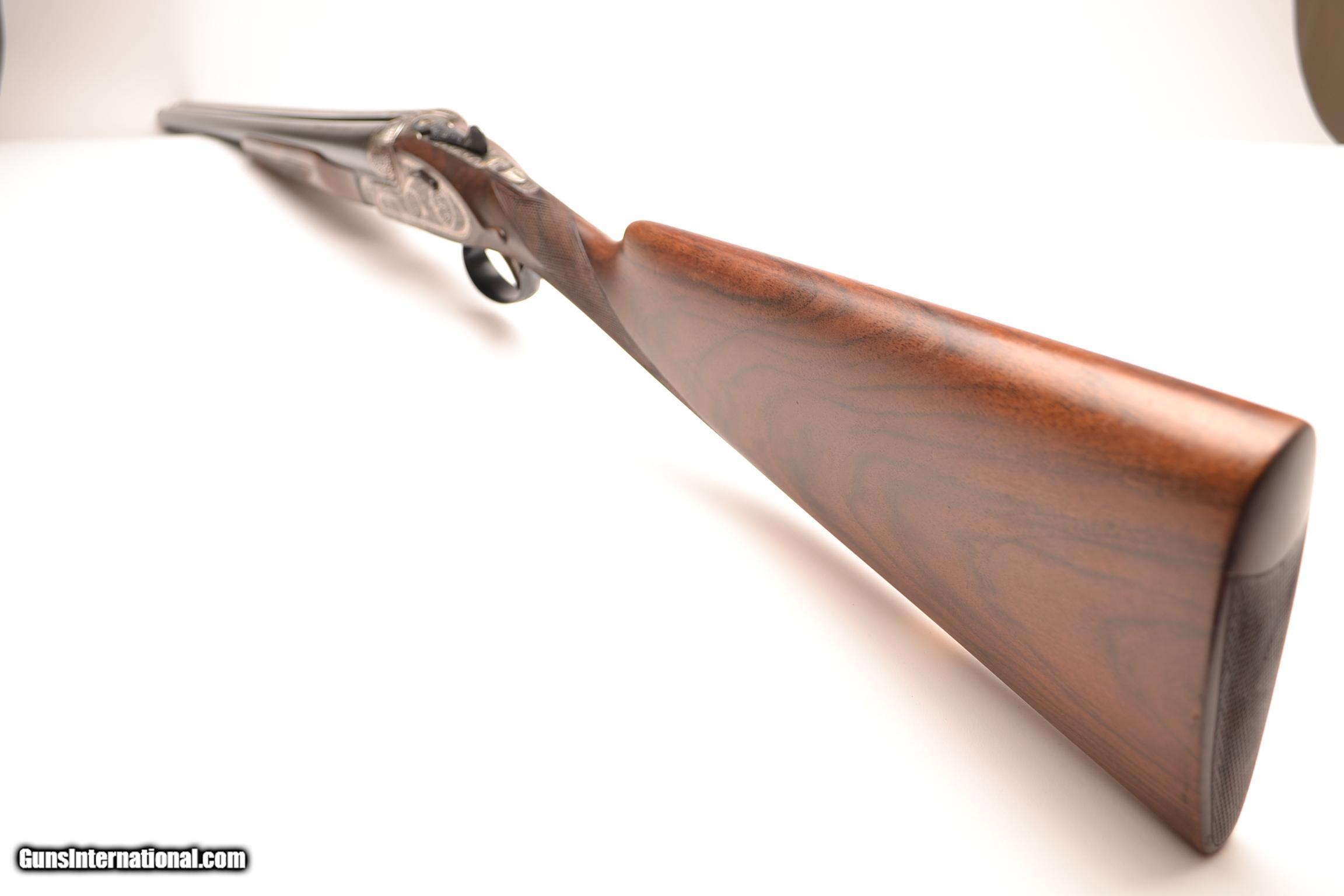 Description: AYA- No. 1, 12ga. two barrel set, 26” barrels choked M/M, 27” barrels choked F/F, straight grip stock, beavertail forend, checkered butt, single trigger, automatic ejectors, automatic safety, solid concave rib, hand detachable locks, Purdey-type double underlugs, chopper-lump barrels, gold washed internal lock parts, beautiful No.1 engraving pattern featuring traditional Purdey-style rose & scroll, excellent like new overall condition with minor handling marks, a wonderful two barrel set priced well below the replacement cost, fitted in a wooden display case, available for immediate delivery. Inv# 25731 6lbs 9oz. 14 ¼” x 1 3/8” x 2 1/8” $7,499.00 SOLD |