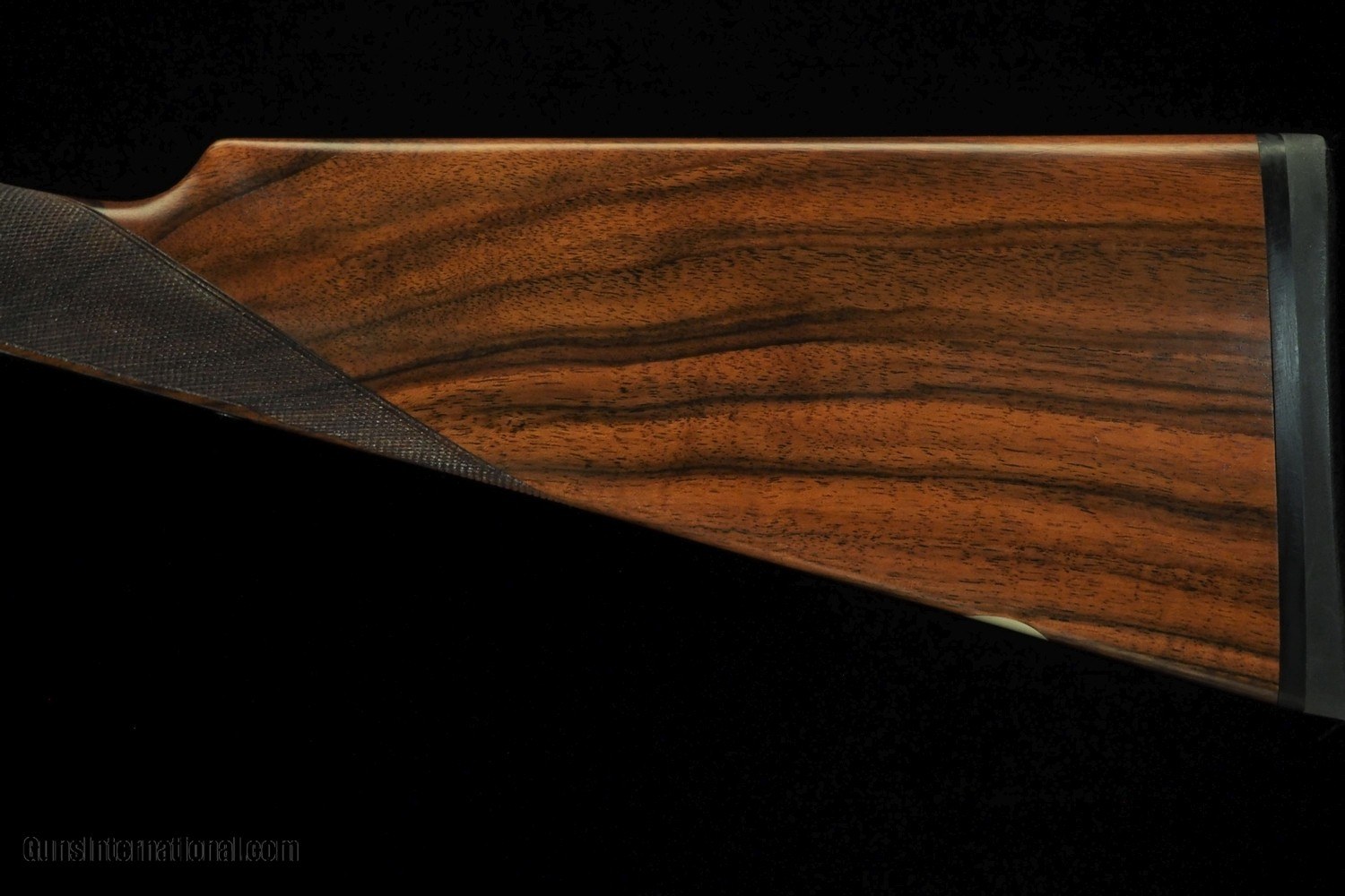 Description: AYA No. 2 Deluxe Sidelock Ejector, 20 bore, 2 3/4" chambers, double triggers, straight grip, splinter forend, 28" barrels choked .006 IC and .012 Mod., 6 lbs. 5oz., 14 7/8" LOP over a slim 5/8" pad, 1 1/2" DAC, 2 3/8" DAH, 1/8", neutral cast, traditional square action with hand detachable lock plates, deep bold acanthus scroll engraving done by laser and finished by hand, No. 1 wood grade with best hand oil finish, old silver action finish, cocking indicators, disc set strikers, chopper lump barrels, vacant gold oval, rolled trigger guard, articulated front trigger. We had made in 2012 and it has been only very lightly used showing only very minor handling marks. Action is still very tight and top lever still well right of center. Looks to have had one small chip repaired behind the top tang. Still a 98% gun that looks very near new. Comes with original box. New price today is $10k. SOLD Shotgun Gauge: 20 Gauge |
