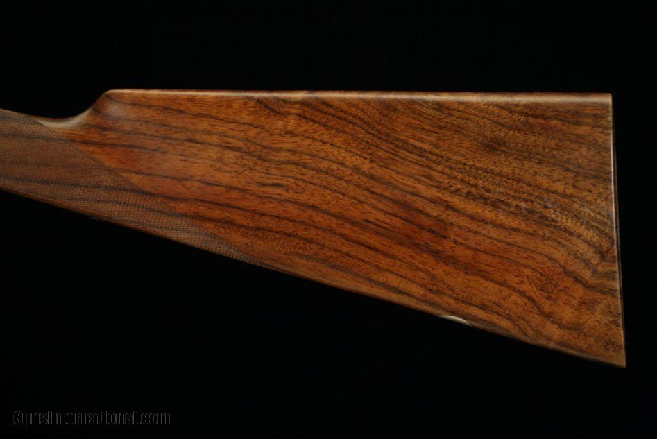 Description: AYA No. 2 RA Sidelock Ejector, 12 bore, 2 3/4" chambers, double triggers, straight grip, splinter forend, 28" barrels with Briley thin wall choke tubes, 6 lbs. 8 oz., 15" LOP to checkered butt, 1 1/2" DAC, 2 3/8" DAH, 1/8" cast off for right hand shooter, case hardened finish, cocking indicators, disc set strikers, chopper lump barrels, gold oval, rolled trigger guard, articulated front trigger. Lightly used gun showing only minor handling marks. Gun no. 36706. SOLD |
