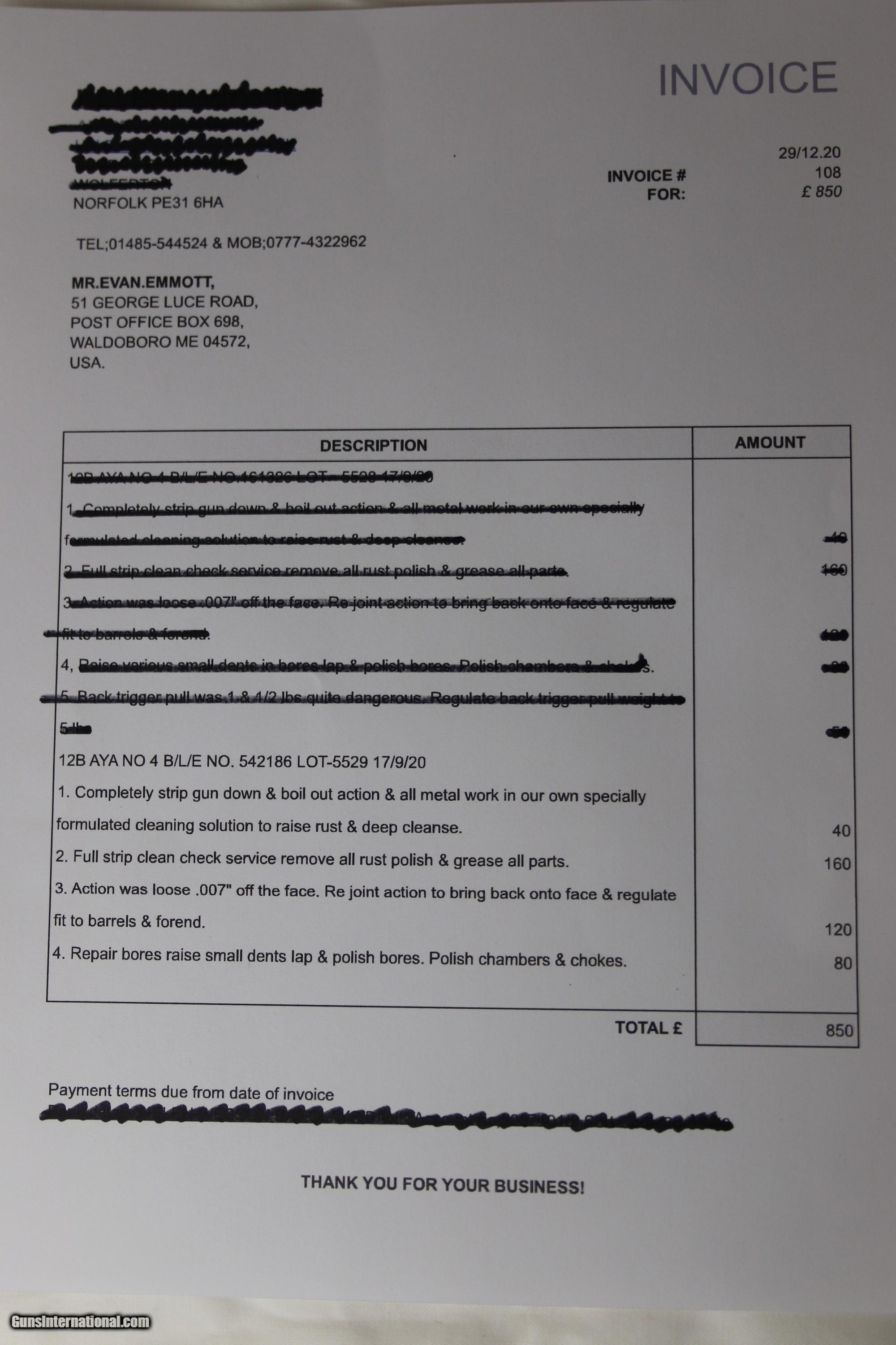 Description: For your consideration is an AYA No.4/53 12-bore BOXLOCK EJECTOR, serial no. 542186. The gun features 28in. nitro-proved, chopper-lump barrels, 2 3/4in. chambers, bored approximately improved cylinder and 3/4 choke (by British nomenclature; actual decimal inside diameters of the chokes are provided below), removable striker discs, automatic safety with gold-inlaid 'S' detail, border and partial scroll engraving, retaining most original colour-hardening and finish. The stock is 15 1/4in. long, including 3/4in. red rubber recoil pad. Weight is 6lb. 13oz. Trigger pulls have been regulated to 4lbs on the front trigger, and 5 lbs on the rear. The stock length of pull can easily be adjusted to suit a new owner by replacing the recoil pad with one of a different thickness. This gun has just been completely mechanically overhauled by an English gunmaker, and has not been used since. Inside it is in like-new mechanical condition. Moreover, the gun has been demonstrated to be in proof. There is some finish loss to the stock around the hand, and original case coloring on the underside of the action, although the gun is overall in very good condition. It is ready and safe to shoot, and needs no work done to it. I have provided a copy of the work invoice, with personal and bank details blacked out, to confirm this. You can see the Norfolk, UK, address of the gunmaker in the top left corner of the invoice, and the gun is referenced by its serial number. I have also blacked out the details of another gun on the same invoice. I purchased this gun from the UK, and had it overhauled there by an indepedent gunmaker/gunsmith formerly affiliated with Holland and Holland. Essentially, the gun has been brought up to a like-new mechanical standard by a world-class craftsman. I purchase all my guns for re-sale from the UK because it is illegal to sell a gun there that is out of proof, so the buyer is protected by law from purchasing an unsafe or un-use-able shotgun. Moreover, they have world-class gunsmiths who perform outstanding work. As long as you continue to maintain this gun to its present standard by having it professionally cleaned and lubricated every year, it will continue to function without fault well into the future. There is nothing else which would need to be done. Everything has been inspected, and brought up to standard. The recent maintainence regime performed on this gun was as follows: 1) Completely dissassembled and all metal work boiled in a specially-formulated solution to deep clean and raise any rust down to the smallest crevice. 2) Every part was checked over for soundness, and then all parts were polished and lubricated. 3) The action was tightened, and barrel and fore-end fit were regulated. 4) Bores, chambers and chokes were lapped and polished. 5) Triggers pulls were verified to be at 4 and 5 lbs. As is the English custom, the gun was then fired 50 times by the gunsmith to verify that all work was done properly. The gun has not been fired since. AyA was founded in 1917 by Miguel Aguirre and Nicolas Aranzabal to make locks for the trade in Eibar, in the Basque region of northern Spain. By 1953 the company had expanded to become the largest gunmaker in Eibar with over 500 employees, not counting outworkers. From 1950 to 1965 the annual production was approximately 20,000 guns per year. Following economic downturns and a series of reorganizations, by 1988 AyA was reshaped as a gunmaking company by Imanuel Aranzabal, who focused on producing British-pattern side-by-sides in box- and side-lock configurations in smaller numbers and in higher quality only. The company now employs between 12 and 25 employees who preserve traditional methods to hand-make high-quality guns in side-by-side and over/under models that closely match the traditional British ideal of style and handling. Today, AyA guns represent some of the best value-for-quality firearms found anywhere in the world. The gun is a faithful Anson and Deeley boxlock with Southgate-patent ejectors, which are well timed, and perform nicely. Although this is AYA's most basic model, it is a very lively gun, with excellent handling characteristics, and features all the construction details found on their much more expensive guns, such as chopper-lump barrels, remove-able hinge pin, hand-struck barrels, disc-set strikers to limit gas escape and a heat-treated action with true case coloring. The only qualities that have been omitted are the superficial, such as highly-figured wood and lavish engraving. New, this gun sells for between $6,000 and $7,000. The stock length of pull can easily be adjusted to accomodate you by the fitting of a shorter recoil pad if neccesary. Gun Details: Drop at Comb: 1 5/8" Drop at Heel: 2 5/8" LOP 15 1/4" including 3/4" English red rubber recoil pad (in very good condition and not at all dry or brittle). Cast Off ( 1/4" at heel and 1/8" at face) Right choke: 0.705" Left Choke: 0.692" Weight: 6 lbs 13 oz. This gun is located at my premises in Maine. Should you be able, I can arrange for you to try the gun out on various clay-target presentations at a private shooting ground for a $100 fee, which covers shells and clays. All CDC safety guidelines must be adhered to and followed throughout. Please contact me with any questions. I am happy to help. 3 day non-firing/non-disassembly inspection and return policy on used guns. Buyer is responsible for shipping, insurance and FFL fees for all returns. Firearms are transferred to FFL Dealers only. The buyer is responsible for finding a FFL to handle the Firearms Transfer from a non FFL seller. SOLD Shotgun Gauge: 12 Gauge Manufacturer: AYA Model: 4/53 Serial Number: 542186 Barrel Length: 28 Bore: 12 Chambers: 2.75 Ejectors: Southgate Patent Condition: Very Good Metal Condition: Very Good Wood Condition: Very Good Bore Condition: Excellent Action: Anson and Deeley Triggers: double Stock Cast: Cast Off Fore End: Splinter Rib: Concave Item Location: Maine Proof: