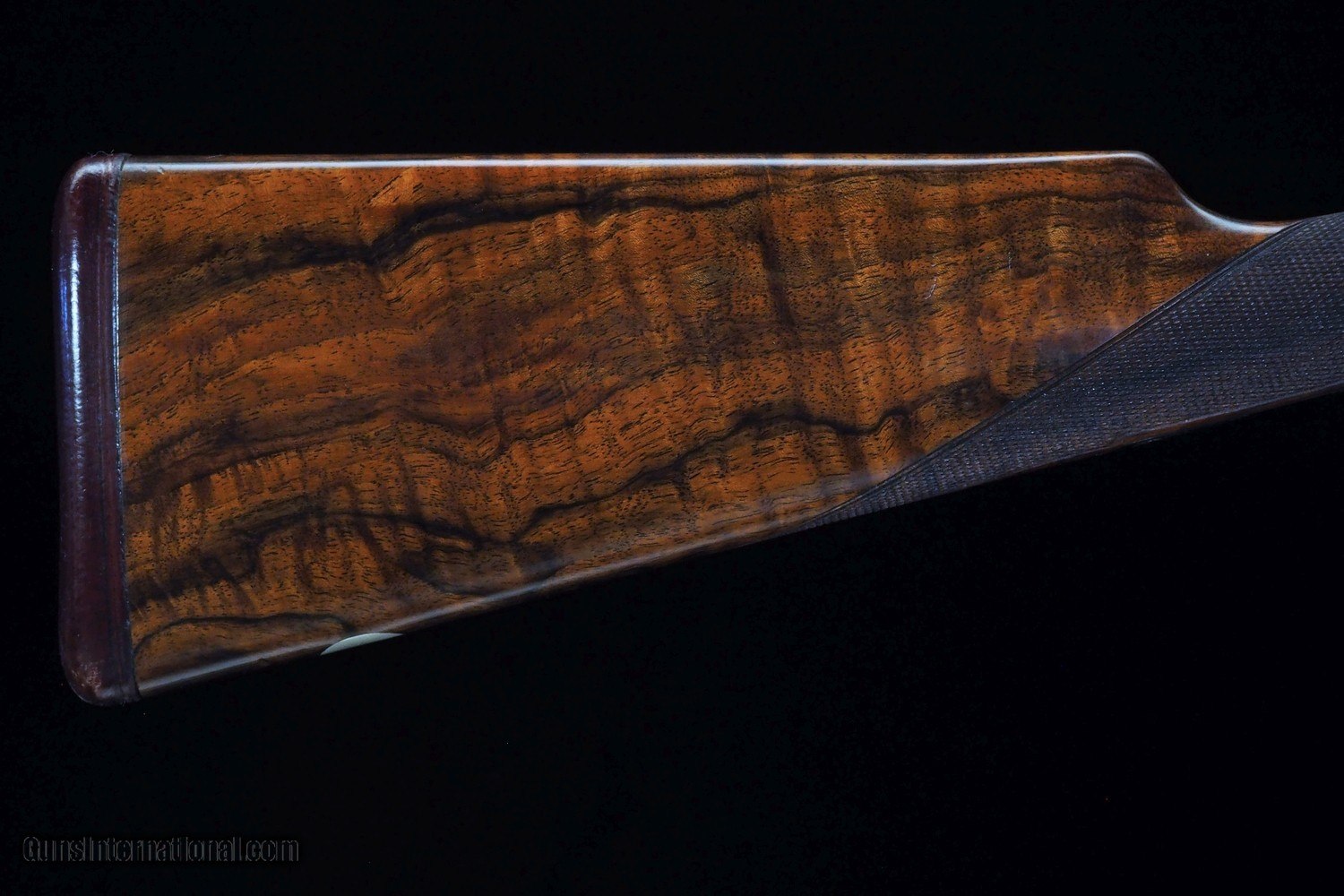 Description: **Sale Pending** AYA No. 4 Round Action, The Bournbrook, 28 bore, 2 3/4" chambers, 29" chopper lump barrels choked .003 Skt and .003 Skt, 14 5/8" LOP over a thin 1/2" leather covered pad, 1 3/8" DAC, 2" DAH, 1/8" cast off, 6 lbs. 3 oz., ejectors, double triggers, straight grip, splinter forend, disc set strikers, smooth concave game rib, 100% full coverage foliate hand engraving, automatic safety, Special Grade Circassian walnut, rolled edge trigger guard, articulated front trigger, gold stock oval, old silver finish, best oil wood finish. Excellent, lightly used condition showing a few handling marks and top lever still well right of center. Comes with original box and papers. SOLD |