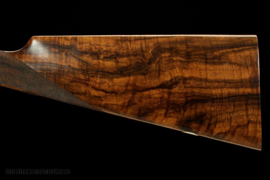 Description: AYA No. 4 Round Action, The Bournbrook Exhibition Grade, 28 bore, 2 3/4" chambers, 28" chopper lump barrels choked .007 IC and .014 Mod., 15" LOP to a checkered butt, 1 3/8" DAC, 2 1/16" DAH, 1/8" cast off, 6 lbs. 1 oz., ejectors, double triggers, straight grip, splinter forend, disc set strikers, smooth concave game rib, 100% full coverage hand engraving, automatic safety, Exhibition Grade Circassian walnut, rolled edge trigger guard, articulated front trigger, gold stock oval, old silver finish, best oil wood finish. Gun No. 23611. This is a brand new model from AYA in Spain and available exclusively in the United States at M.W. Reynolds. Our Bournbrook model features wood that we select and send to Spain just for these guns. You can custom order these guns with any option or specification you desire and pick your wood from our blank selection. SOLD |