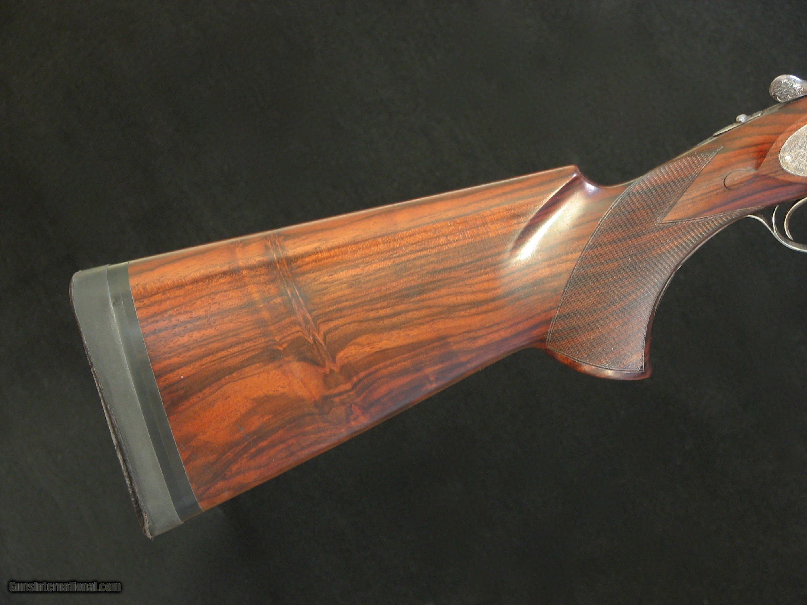 Description: AyA No.56 SLE 12 gauge in excellent cosmetic and mechanical condition. This gun has the following features: - side clips - Purdey-style hidden third fastener - disc-set strikers - Southgate type selective ejectors - articulated front trigger - high, hand-matted rib with mid-bead - factory beavertail forend - Deeley & Edge type forend latch - factory target-style pistol grip - leather-faced Pachmayr recoil pad - 28" barrels - 70mm chambers - choked .009" and .016" - pull length is 15 1/8" - drop at comb 1, 9/32" - drop at heel 2, 2/32" - cast is neutral - pitch is 6 degrees down - weight is 7 lbs., 9 oz. I'm selling this gun for the widow of a deceased client, who used the gun for sporting clays. It has been fully inspected and is ready for use. Because it is a consignment gun, no warranty is offered, expressed or implied, and returns are not offered. The buyer pays actual shipping costs. Reasonable offers considered. SOLD |