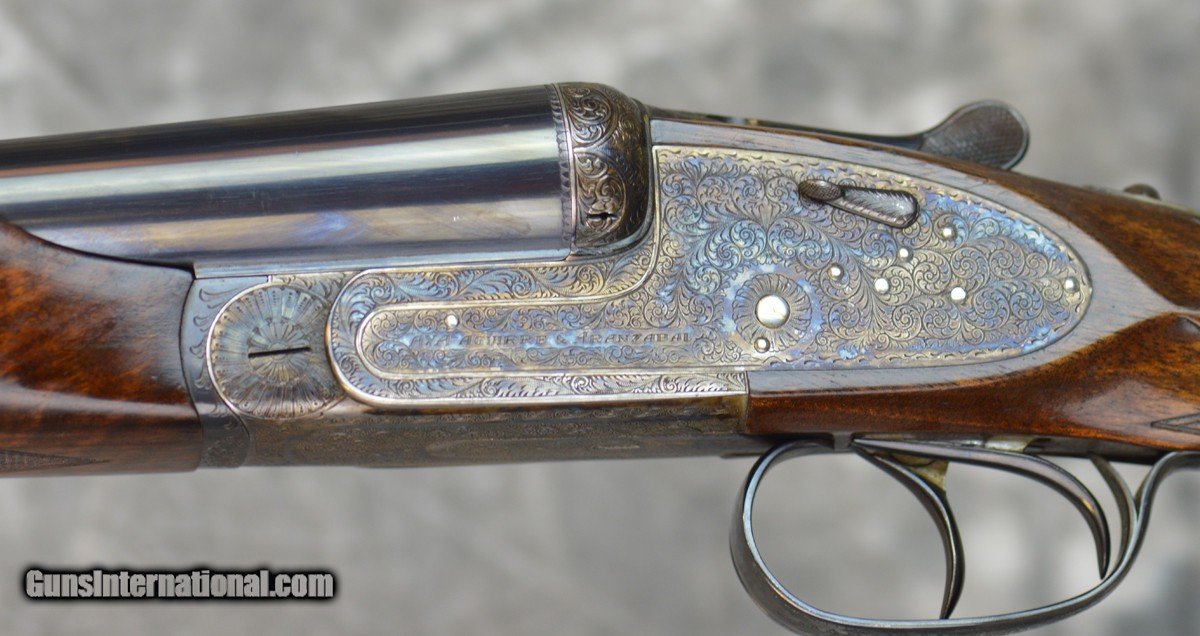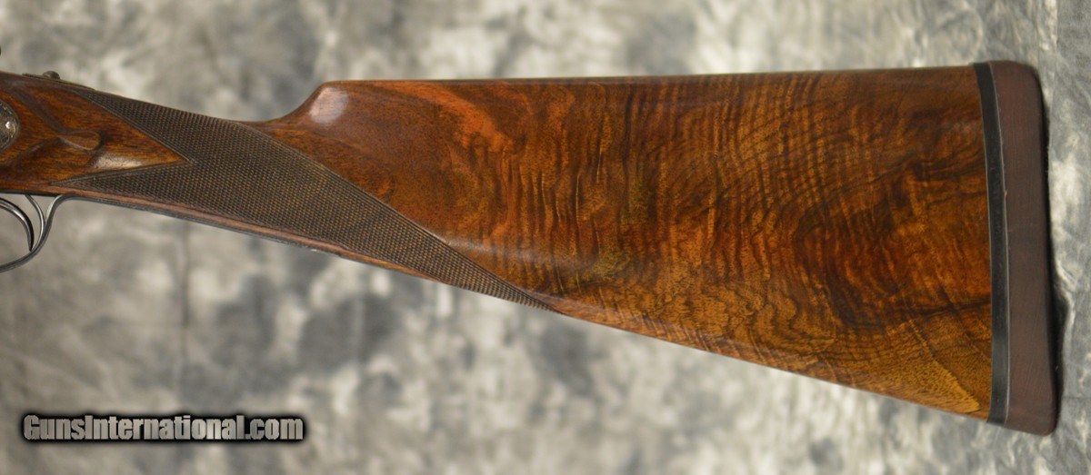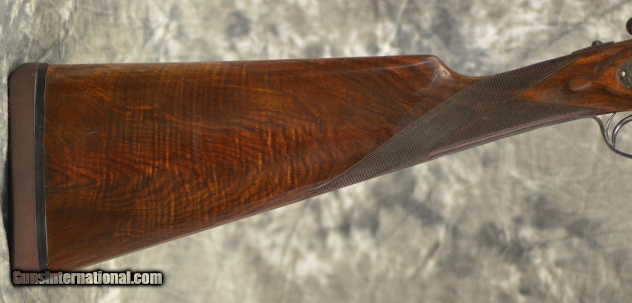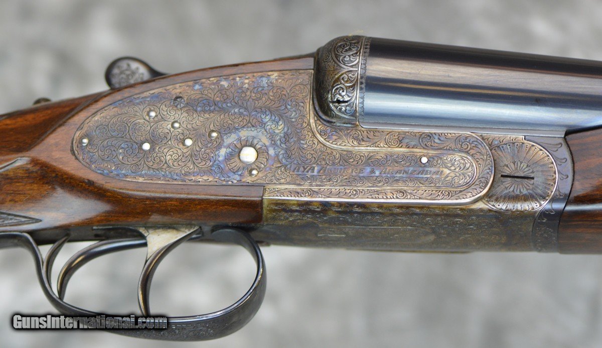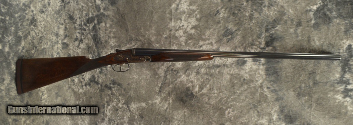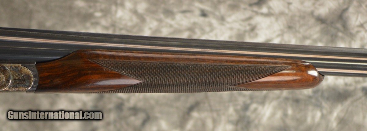 Description: Pre-Owned AyA NO. 56 Competition 12GA Side-Lock Ejector featuring 30" fixed choke (IC/SKT) barrels, solid hand-filed rib, barrels show extremely minor bluing wear. Case-color hardened action with minor finish wear, 95% of original finish remains. Features 7 pin Holland style hand-detachable action with full coverage scroll engraving. The No. 56 model features the AyA Heavy contour 12GA action for high volume competition or pigeon shooting. Double articulating triggers, English straight hand stock to recoil pad and full beavertail forearm with latch. Outstanding overall condition with only minor handling marks. No case. Manufactured in 1995. SOLD |